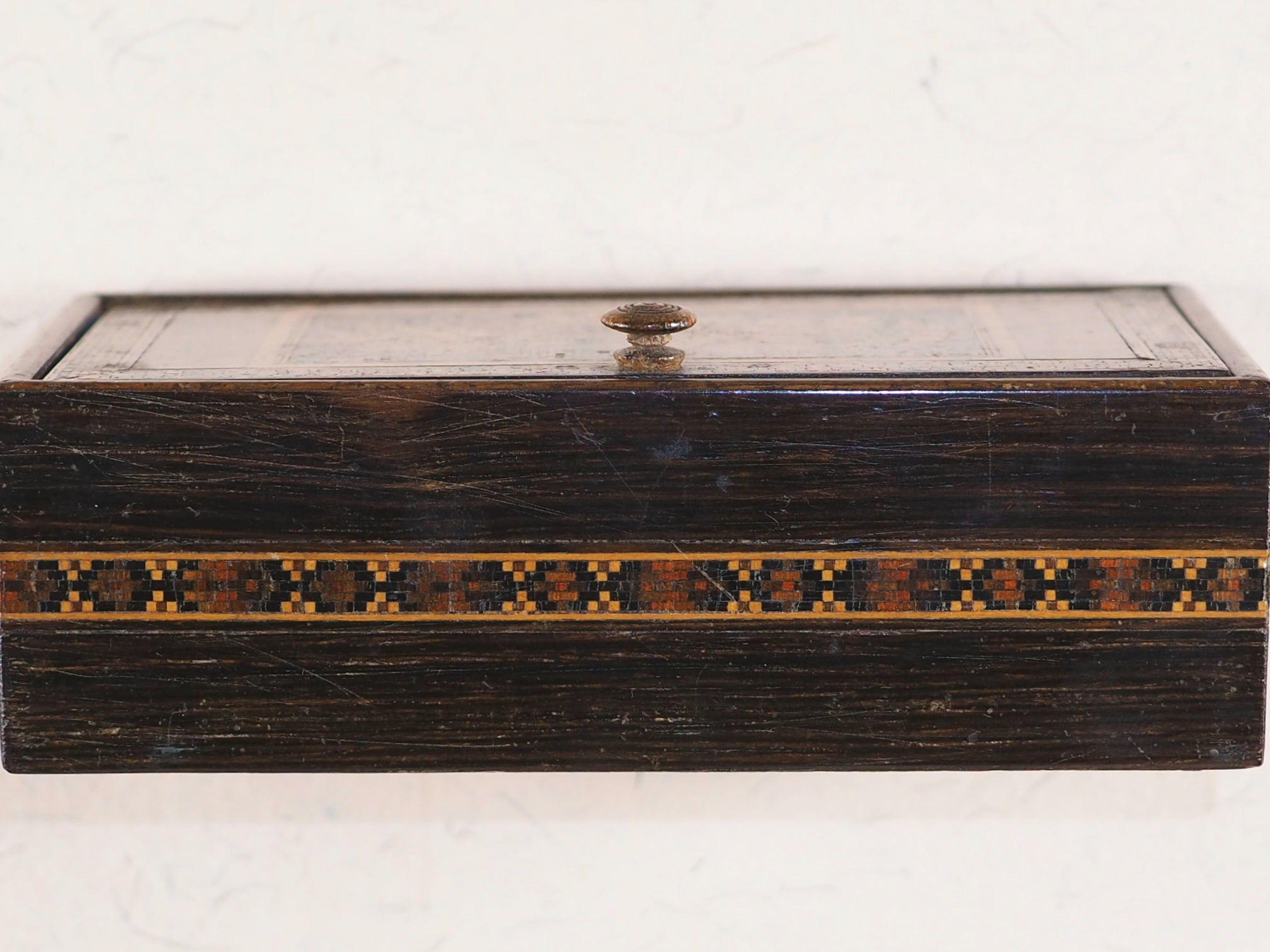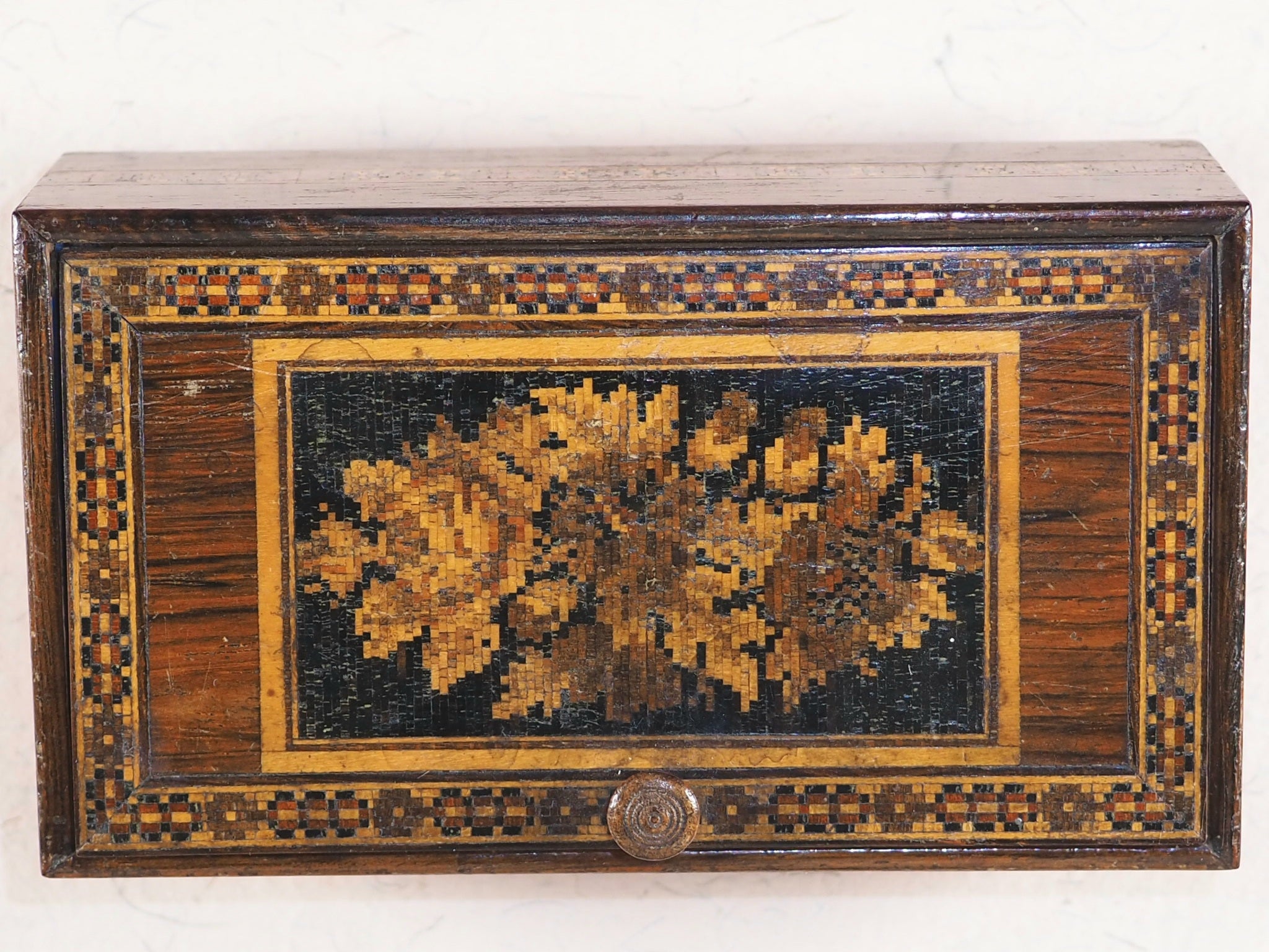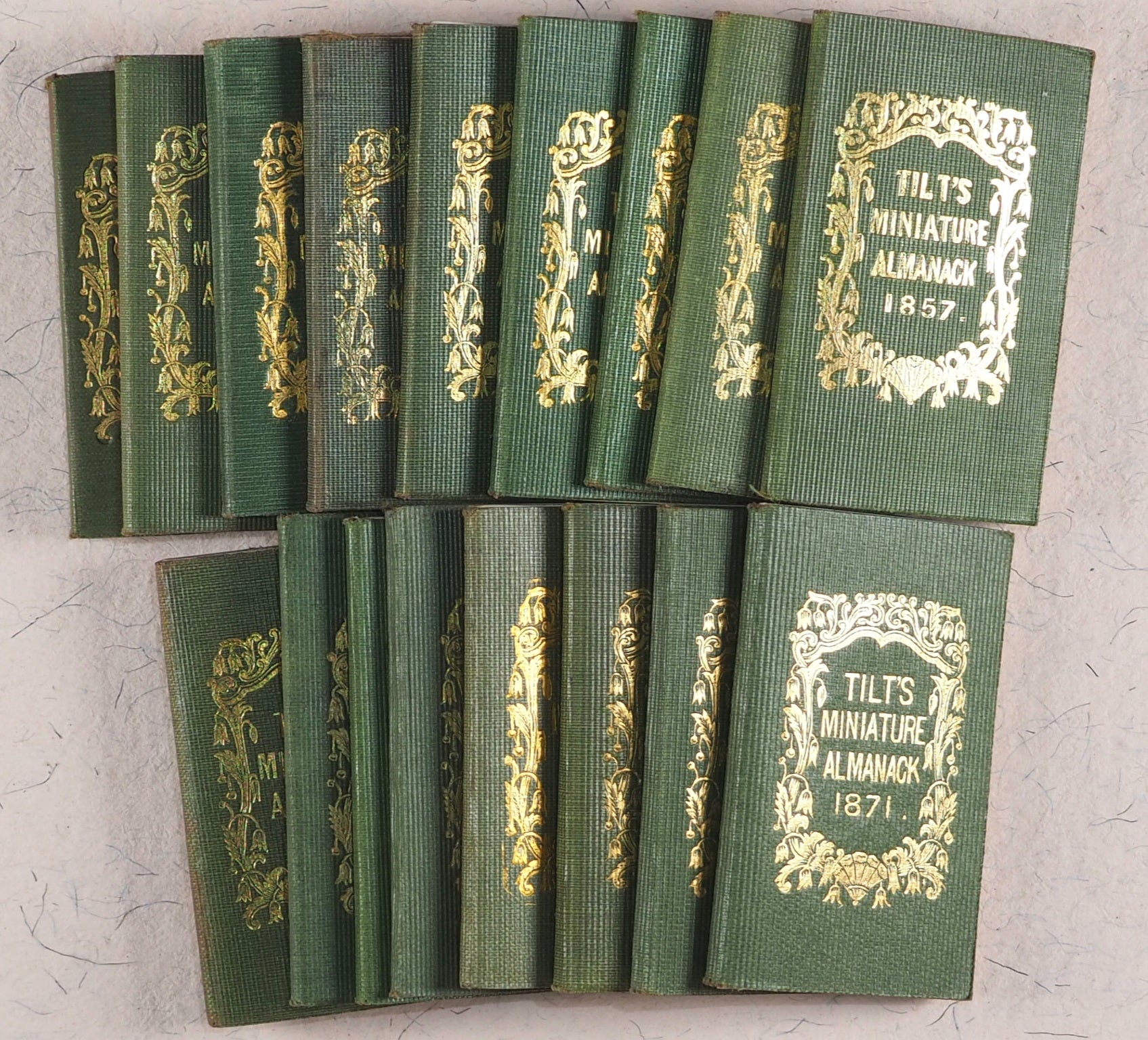 A substantial collection of 17 complete almanacs by various publishers, all in the same format and the same series. Editions for the years 1849, 1850, 1851, 1852, 1853, 1854, 1855, 1856, 1857,1858, 1859, 1860, 1861, 1862, 1864, 1865, and 1871. Of these 17 items, 10 are not listed in WorldCat, and of the 7 editions that have been listed, there are only 9 copies known. 13 of these almanacs are not listed in Doris Welsh's standard Bibliography of Miniature Books. Bondy says "Many collectors also value highly another series issued under the title Tilt's Miniature Almanac or Tilt's Useful Almanac by one or the other of the following publishers: Tilt, Tilt and Bogue, D.Bogue, late Tilt and Bogue, W.Kent, Piper and Carter, and Kent & Co. over a period ranging from 1836 to at least 1886". Some endpapers and pages with contemporary inscriptions. Some leaves loose due to the simple glue binding techniques. 37 x 61 mm. Original green flexible buckram covers with gilt titling. Overall in very good condition. Together with an antique Tunbridgeware box with a hinged decorative lid and original knob. Bondy, 44. Welsh, 6733 (1850 edition), 6734 (1851 edition), 6735 (1855 edition), 6736 (1856 edition), 6738 (1871 edition). OCLC, 299608210 (1849 edition, WorldCat locates one copy worldwide - Virginia). 763202461 (1850 edition, one copy - Indiana). 244110592 (1851 edition, one copy - Grolier Club). 2441072297 (1855 edition, three copies - Grolier, Virginia and Strong Rochester). 1043419777 (1858 edition, one copy - Oxford Uni.). 62114132 (1861 edition, one copy - Williams College, Williamstown). 1117775086 (1864 edition, one copy - Washington Uni. St. Louis).