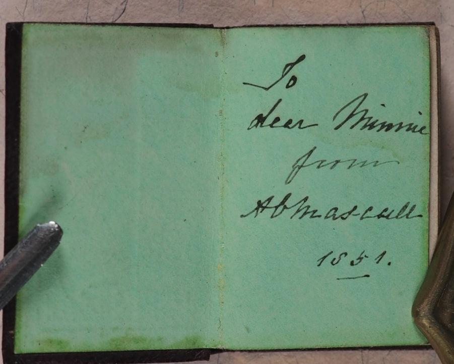 120 printed pages, + 7 pages of publisher's adverts and colophon at end. Original green endpapers. All edges gilt. Contemporary ink owner's inscription on front free endpaper, dated 1851. 32 x 50 mm. Original brown morocco. Gilt titling and decoration on spine and coves. Uniform with other volumes in series. Bondy, 130. Spielmann, 512. Welsh, 7179. OCLC, 41463383. WorldCat locates six copies worldwide (Oxford, Harvard, Pierpont Morgan, Delaware, Virginia, and Indiana University Libraries).