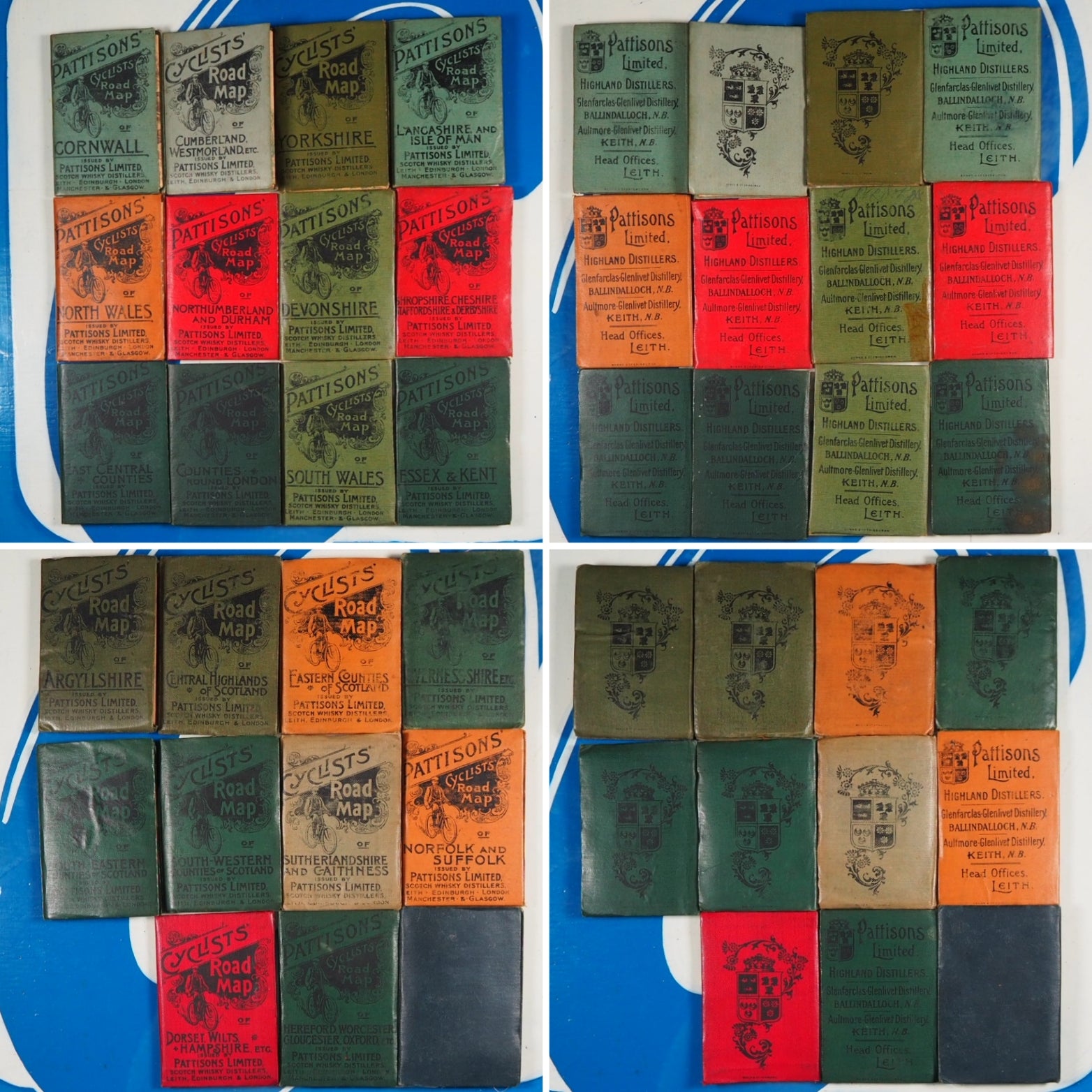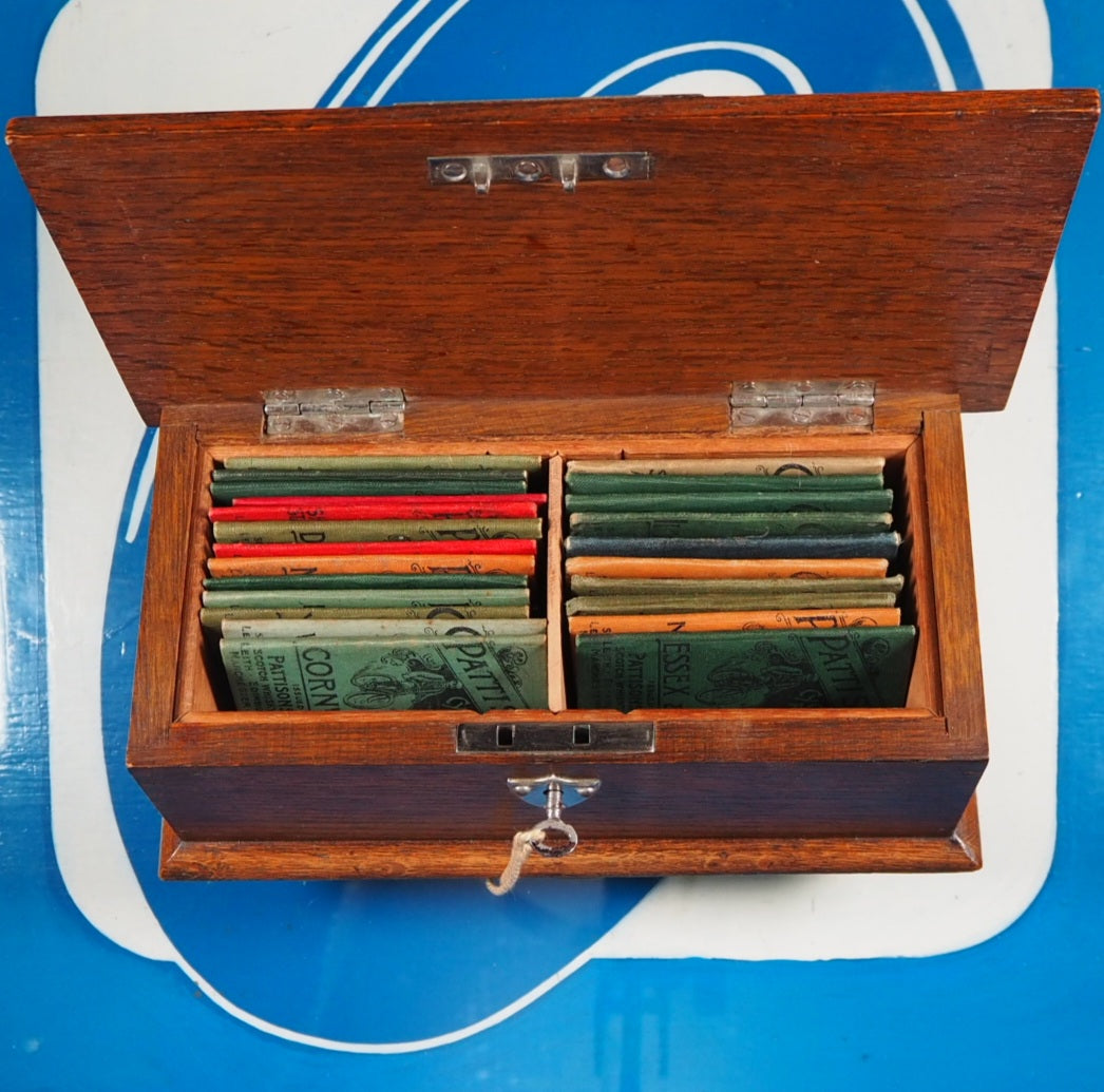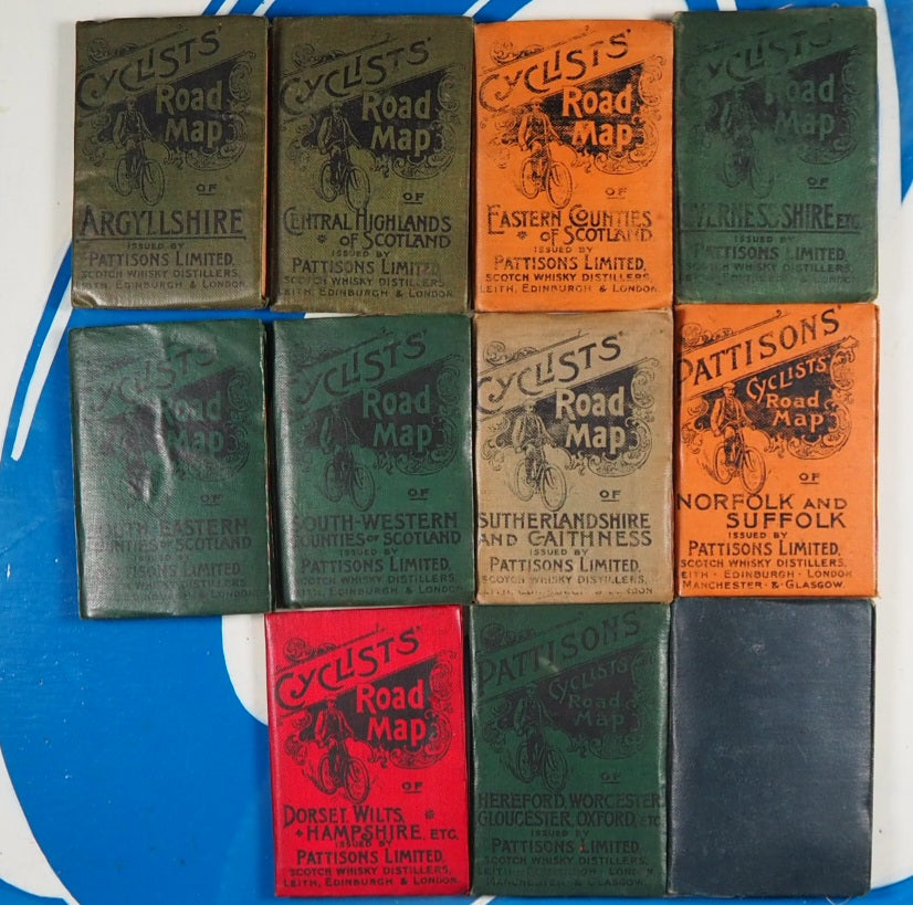 Complete or near complete set. Not dated, circa 1890, 23 paper maps, some with contemporary ownership signature of Will Robertson (all are in very good condition, with just a hint of wear) of: 1. - Hereford, Worcester, Gloucester, Oxford 2. - North Wales 3. - Northumberland & Durham 4. - Devonshire 5. - Shropshire, Cheshire, Staffordshire & Derbyshire 6. - Counties round London 7. - Dorset, Wilts + Hampshire etc. 8. - East Central Counties. 9. - Cumberland, Westmorland etc. 10. -South Wales. 11. Yorkshire. 12. - Lancashire and Isle of Man. 13. Cornwall. 14. - Essex & Kent. 15. -Norfolk and Suffolk. SCOTLAND: 1.-Argyllshire. 2.-Central Highlands . 3.-Eastern Counties. 4.-Invernessshire. 5.-North Eastern Counties. 6.-South Eastern Counties. 7.-South Western Counites. 8.-Sutherlandshire and Caithness. 2" x 3.5"; folding out to 10" x 12" with Pattisons' advert verso and in original Harlequin buckram covers (slightly rubbed in places, North Eastern Counties with old rebind in blue) . Back covers read: Pattisons Limited, Highland Distillers. Glenfarclas-Glenlivet Distillery, BALLINDALLOCH, N.B. Aultmore-Glenlivet Distillery, KEITH, N.B. Head Offices, LEITH. Housed in a contemporary fitted oak box with original, functioning key and silver metal fittings, including four mounted cartouches without any engraving available for added engraving if required (green baize on bottom replaced). This collection of 23 Pattisons Cyclists Road Maps, issued by Pattisons Limited, Scotch Whisky Distillers in the late 1800s, were little promotional gifts, promoting the Pattisons whisky blend, aimed specifically at sporting types (hunting, shooting, fishing, yachting, golfing, curling, coaching, and cycling!). In the late 19th century Pattisons was the largest whisky wholesaler and blender in Scotland. Pattisons was run by brothers Robert & Walter Pattison, who had inherited it from their father, and it enjoyed spectacular growth in the 'whisky boom' of the late 19th century. It ran into serious financial difficulites and collapsed in 1899 as a result of fraud and serious mismanagement by the two brothers, both of whom subsequently served prison sentences. Seller Inventory # 5290