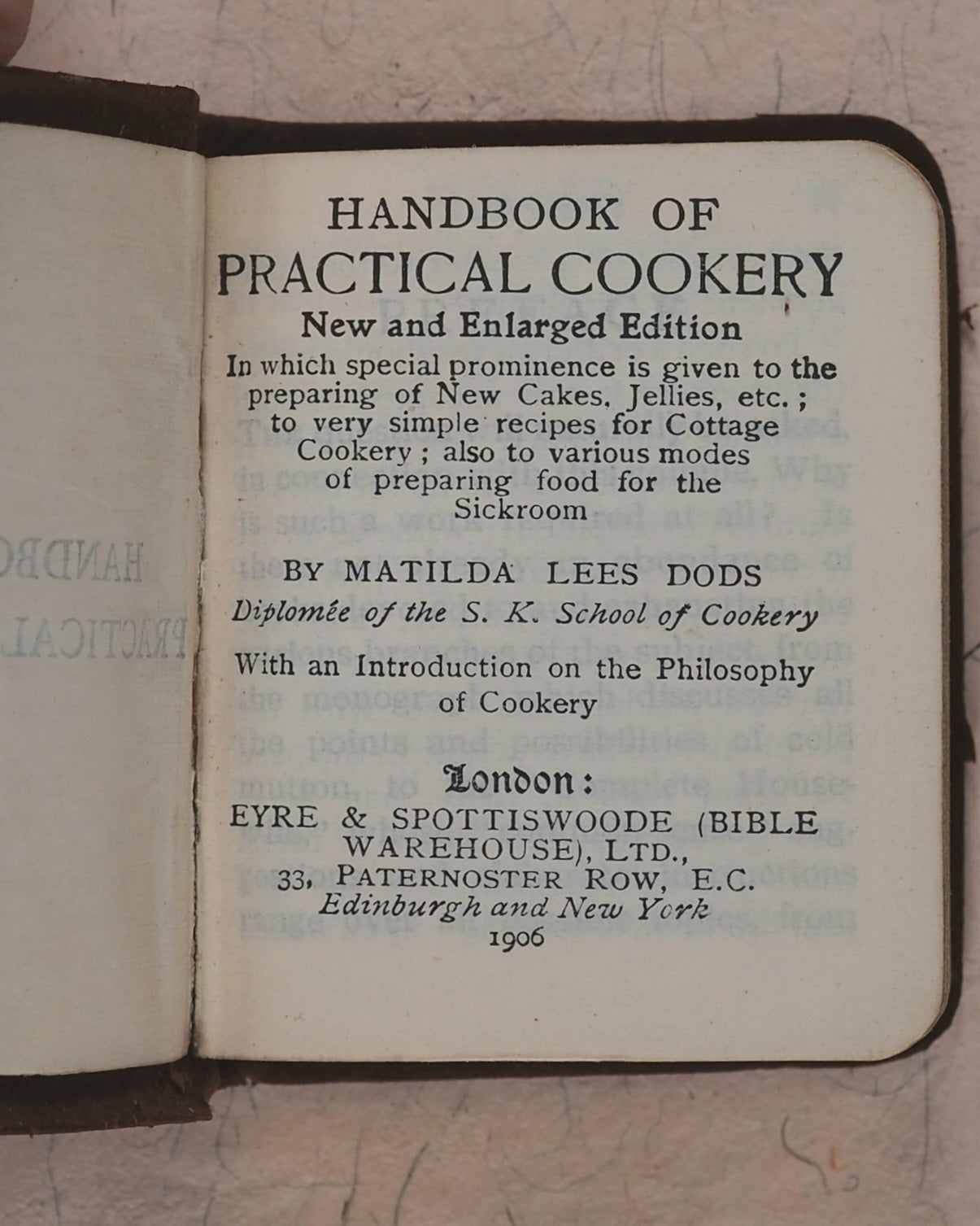Dods, Matilda Lees. Handbook of Practical Cookery. Eyre & Spottiswoode (Bible Warehouse), Limited. 33, paternoster Row, E.C. London, Edinburgh and New York. 1906.