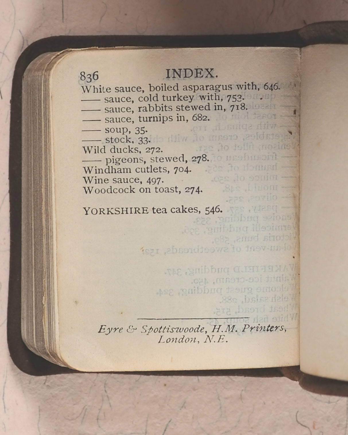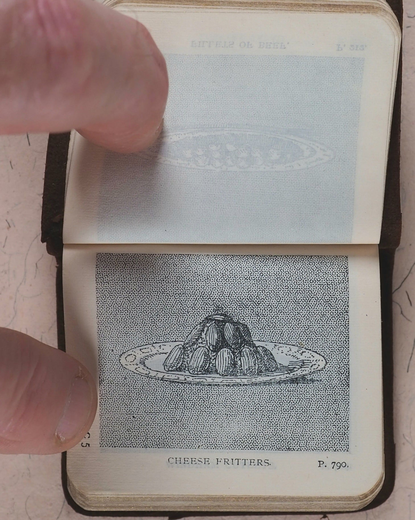 Dods, Matilda Lees. Handbook of Practical Cookery. New and Enlarged edition. In which special prominence is given to the preparing of new cakes, jellies, etc. ; to very simple recipes for cottage cookery ; also to various modes for preparing food for the sickroom. Eyre & Spottiswoode (Bible Warehouse), Limited. 33, paternoster Row, E.C. London, Edinburgh and New York. 1906.  India paper, 50 leaves of plates, pages: xix, 836.  Rounded corners. All edges gilt. Original marbled endpapers. Front endpapers glued together. 47 x 58 mm. Original full brown reverse calf; spine with titling in gilt and embossed horizontal lines. Extremely light handling wear, particularly at the foot of the spine. Matilda Lees Dods was one of the pseudonyms of Scottish author Christian Isobel Johnstone (1781-1857), a name originally used in Walter Scott's novel St Ronan's Well. Bondy, 139. Welsh, 2511. OCLC, 13987563. WorldCat locates 22 copies worldwide.
