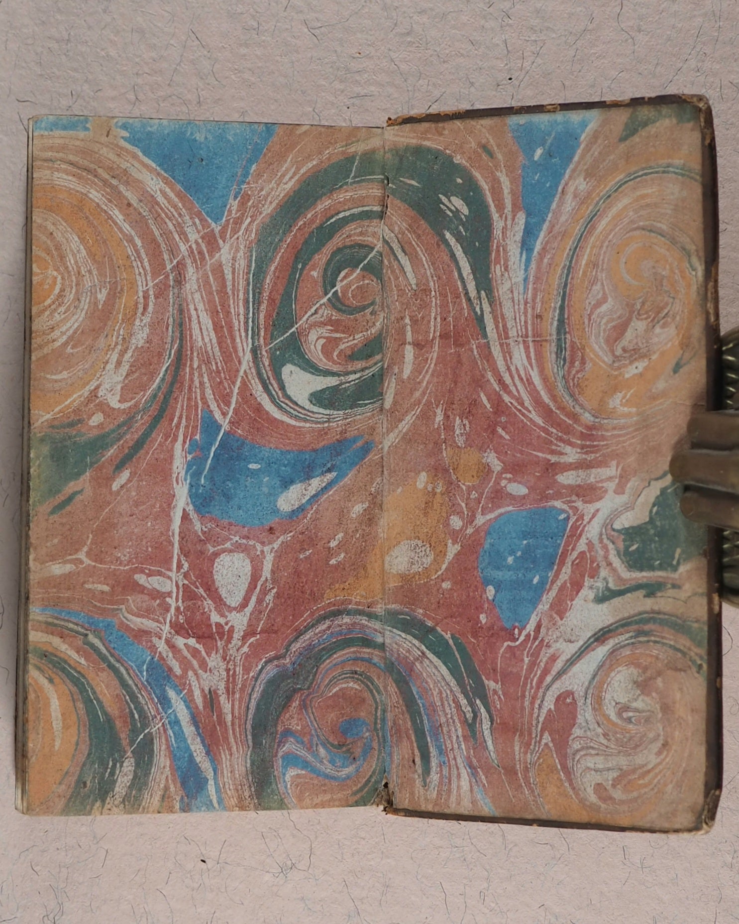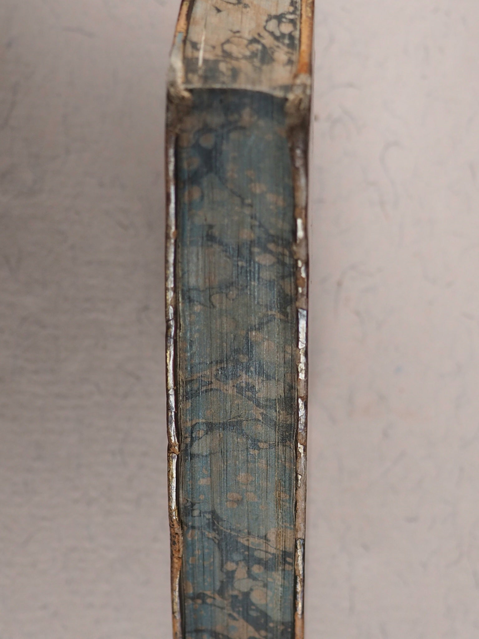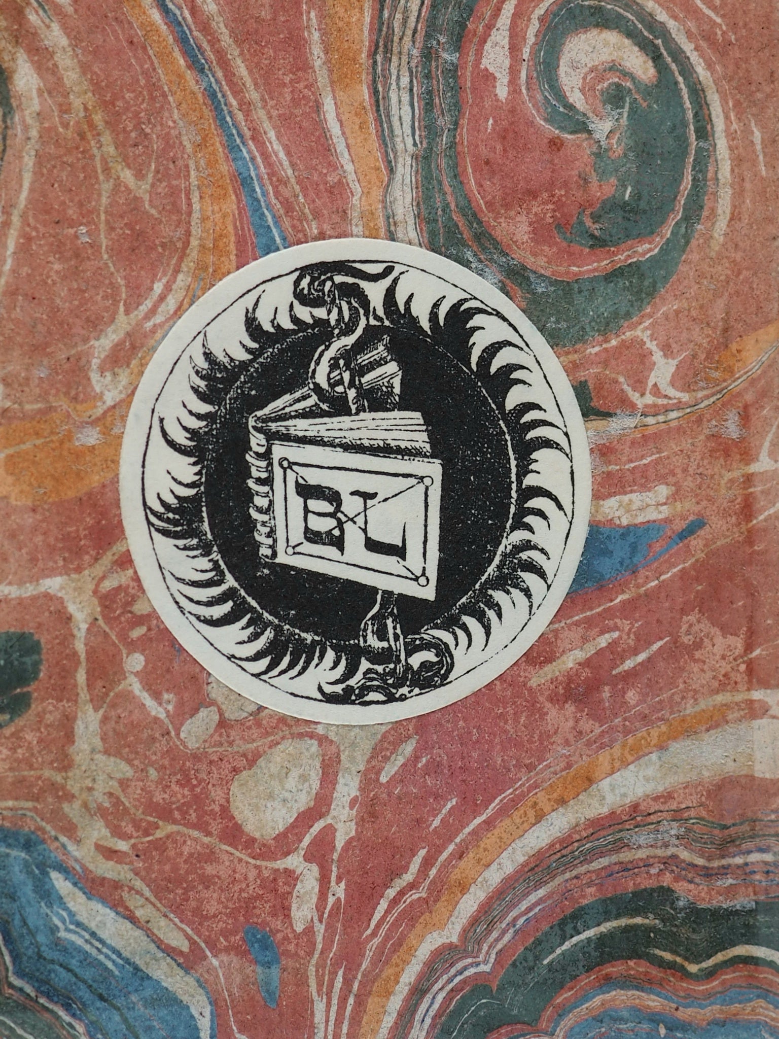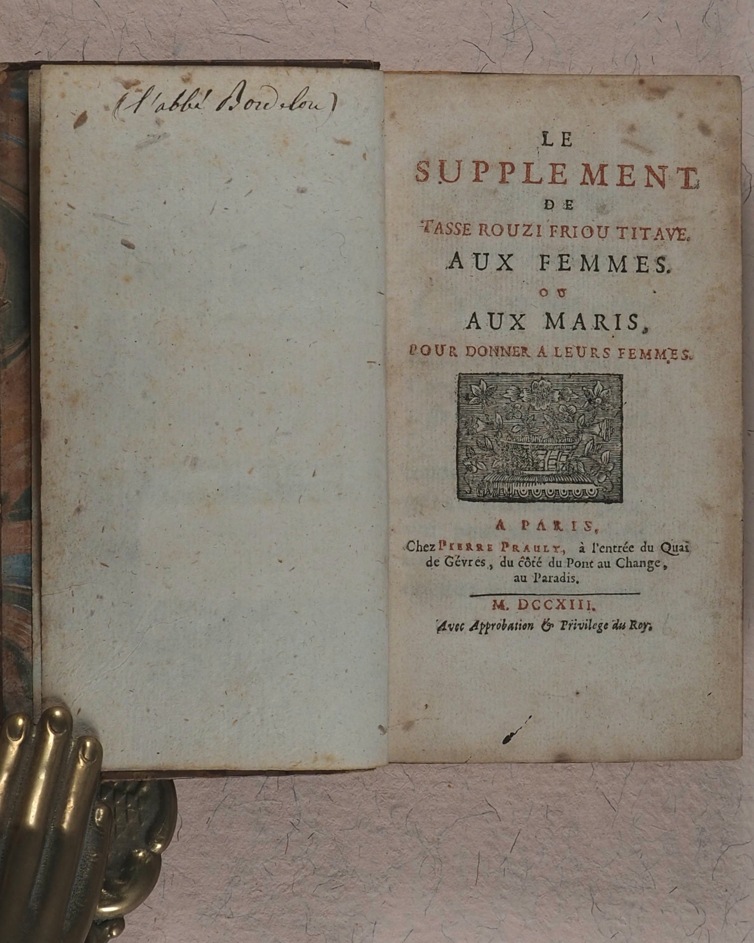 Bordelon, Laurent (1653-1730). Le supplément de Tasse rouzi friou titave. Aux Femmes ou aux Maris, pour donner à leurs Femmes. 1713, Pierre Prault, , à l'entrée du Quai de Gévres, du côté du Pont au Change, au Paradis, A Paris. 1 duodecimo volume. xxix, [3], 338 printed pages. Title page printed in red and black, with fleuron vignette. All edges hand 'gravel' marbled; slightly faded. 'Curl' or 'snail' hand marbled endpapers. Circular wood engraved Ex libris on front paste-down endpaper of Dutch Jewish doctor, Bob Luza (1893-1980) , a renowned antiquarian book collector whose library was auctioned in 1981 by A.L.van Gendt. 95 x 160mm. Contemporary full sheepskin binding called a run marble binding, inspired by the striations of rock formations, sometimes also called Prussian marble or Spanish marble. The style flourished in the 1820s and 1830s and this is an early example. Spine in six compartments with raised bands, gilded spine fleurons ad gilt titling. Corners worn, edges slightly chipped and front hinge beginning to split. Bordelon, Laurent (1653-1730) was a French abbot, doctor in theology, playwright, polygraph and progressive utopian: "it is claimed that blows with a stick, well applied to the back of a woman, at the same time as one pronounces these words, tasse Rouzi Friou Titave , have, by an admirable property, the power to make her gentle, wise, and faithful to her obligations. But, I have often said to myself, could we not find some expedient less violent and more worthy of conjugal society? For finally the stick is not at all suitable in this regard in the hand of an honest man". OCLC, 13476131. WorldCat locates 16 copies. Barbier, iv, 597. "livre curieux"(Gay). GAY 111,1159; QUÉRARD. France Iittéraire.I, 415; CONLON. Prélude .IV, 16719; LAPORTE. Bib. Clérico-galante. P.28