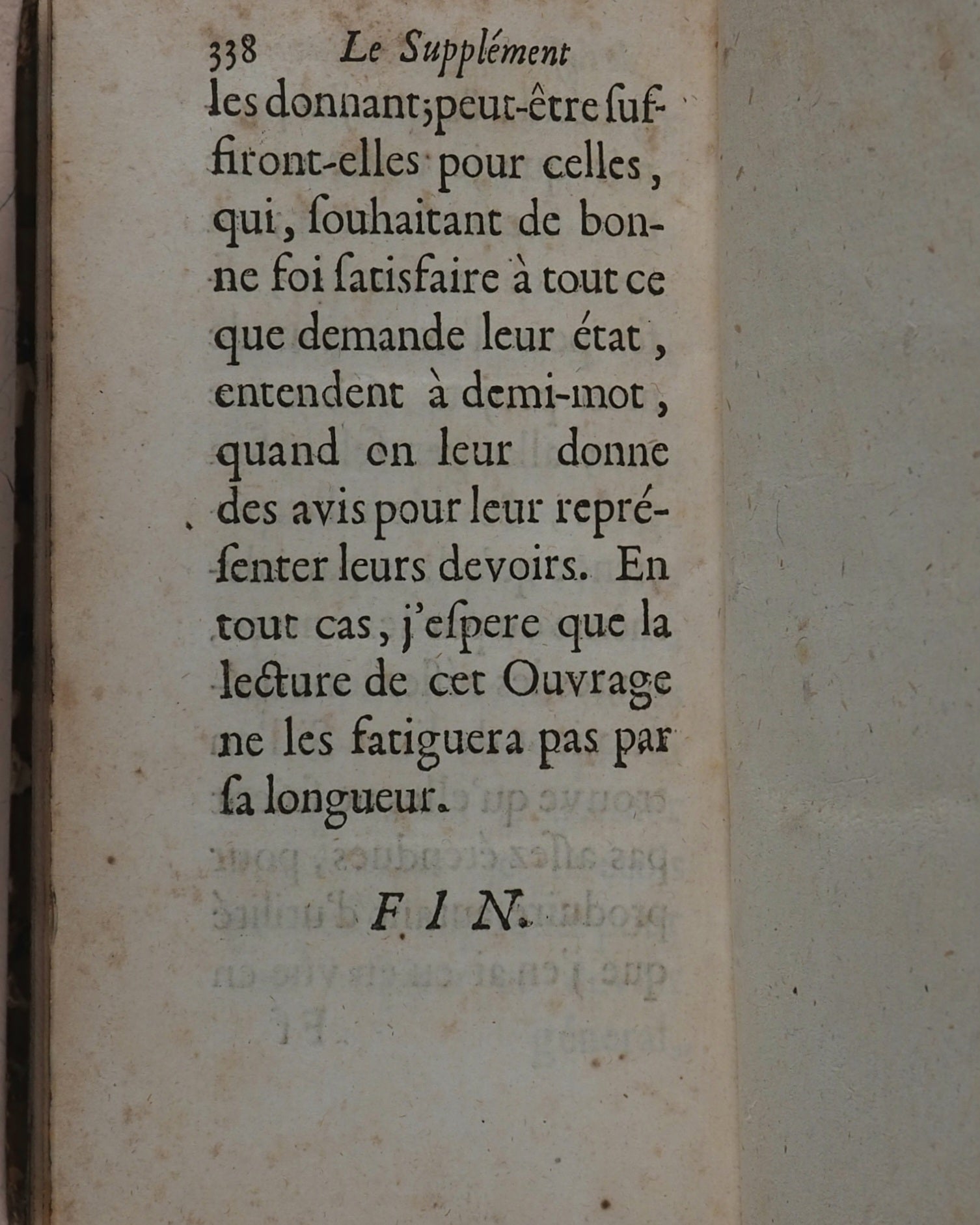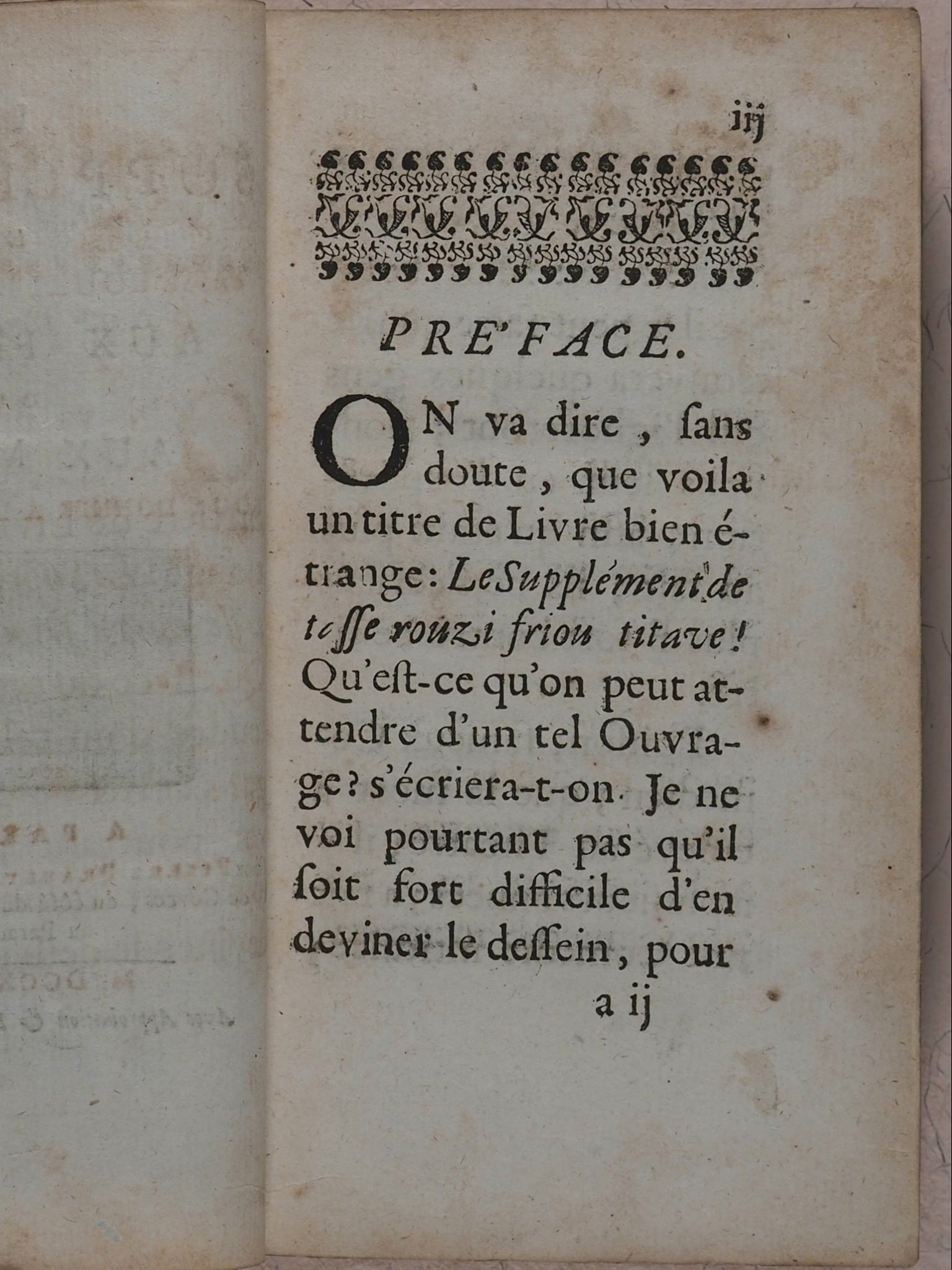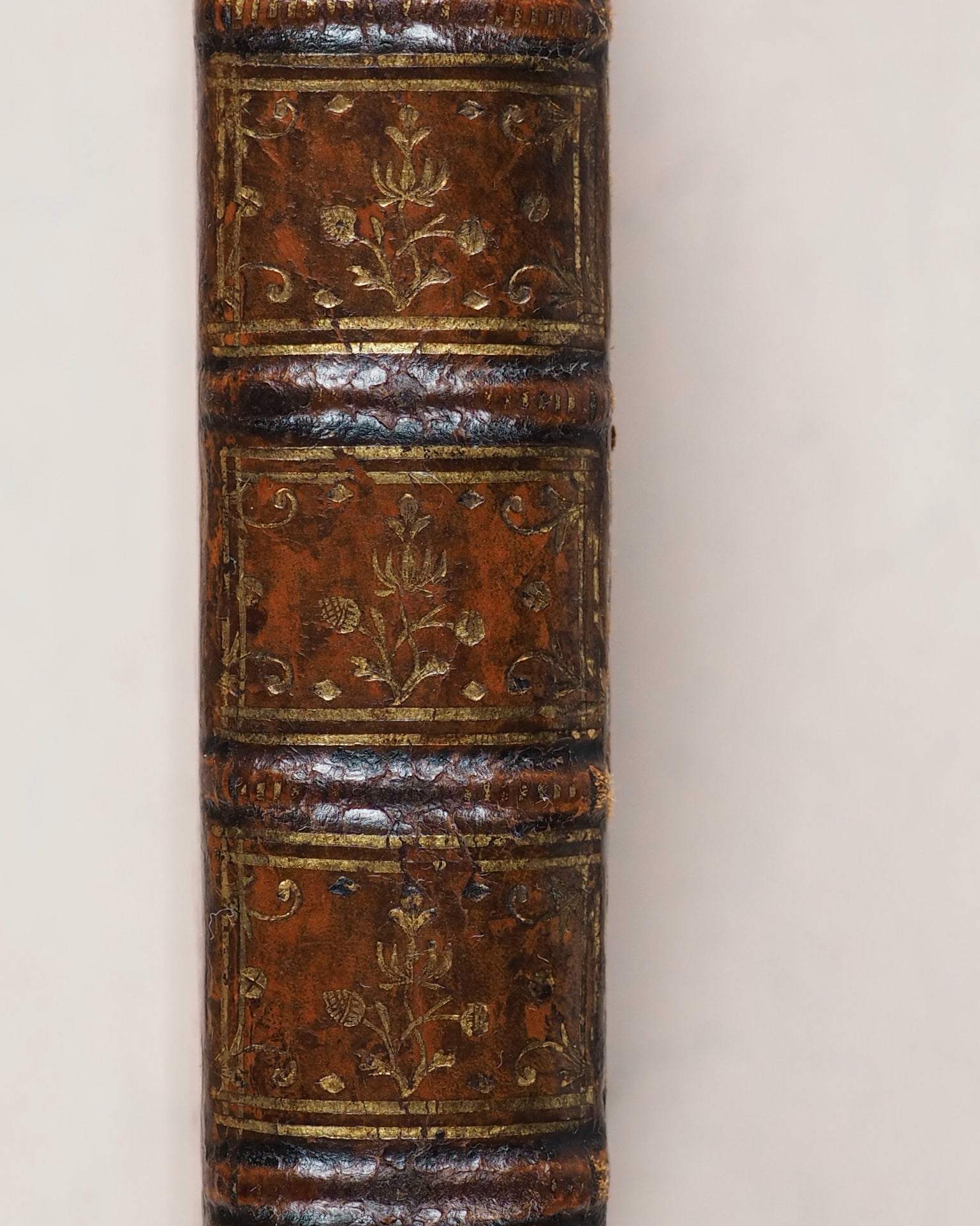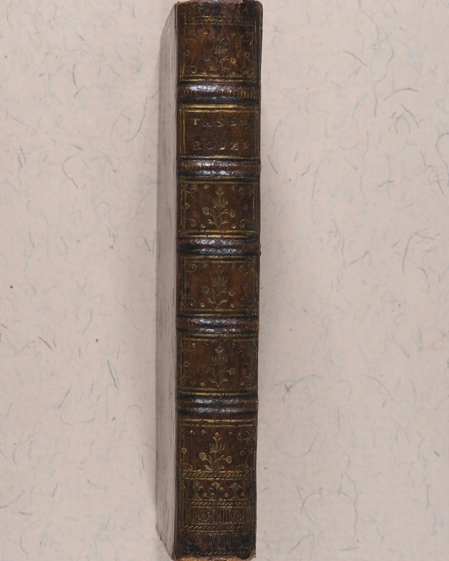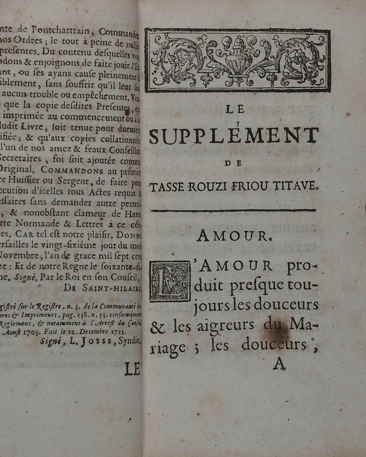 Bordelon, Laurent (1653-1730). Le supplément de Tasse rouzi friou titave. Aux Femmes ou aux Maris, pour donner à leurs Femmes. 1713, Pierre Prault, , à l'entrée du Quai de Gévres, du côté du Pont au Change, au Paradis, A Paris. 1 duodecimo volume. xxix, [3], 338 printed pages. Title page printed in red and black, with fleuron vignette. All edges hand 'gravel' marbled; slightly faded. 'Curl' or 'snail' hand marbled endpapers. Circular wood engraved Ex libris on front paste-down endpaper of Dutch Jewish doctor, Bob Luza (1893-1980) , a renowned antiquarian book collector whose library was auctioned in 1981 by A.L.van Gendt. 95 x 160mm. Contemporary full sheepskin binding called a run marble binding, inspired by the striations of rock formations, sometimes also called Prussian marble or Spanish marble. The style flourished in the 1820s and 1830s and this is an early example. Spine in six compartments with raised bands, gilded spine fleurons ad gilt titling. Corners worn, edges slightly chipped and front hinge beginning to split. Bordelon, Laurent (1653-1730) was a French abbot, doctor in theology, playwright, polygraph and progressive utopian: "it is claimed that blows with a stick, well applied to the back of a woman, at the same time as one pronounces these words, tasse Rouzi Friou Titave , have, by an admirable property, the power to make her gentle, wise, and faithful to her obligations. But, I have often said to myself, could we not find some expedient less violent and more worthy of conjugal society? For finally the stick is not at all suitable in this regard in the hand of an honest man". OCLC, 13476131. WorldCat locates 16 copies. Barbier, iv, 597. "livre curieux"(Gay). GAY 111,1159; QUÉRARD. France Iittéraire.I, 415; CONLON. Prélude .IV, 16719; LAPORTE. Bib. Clérico-galante. P.28