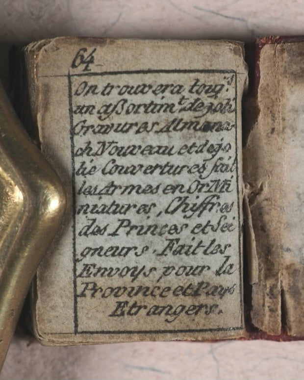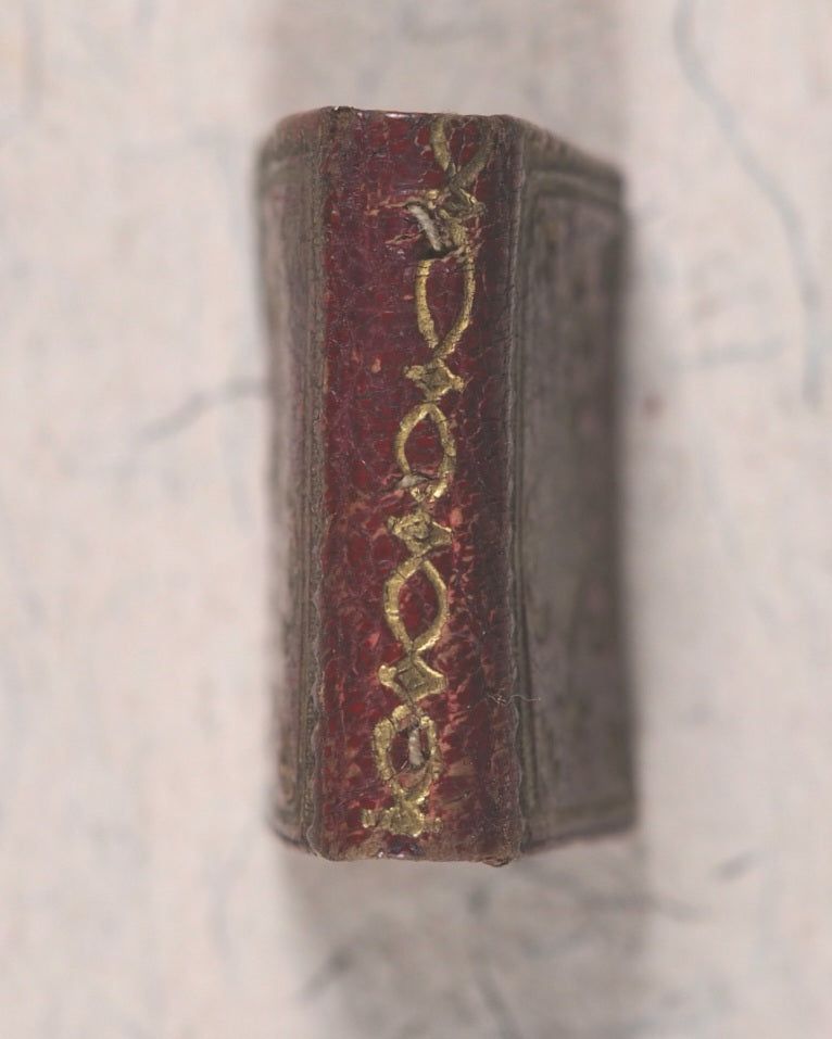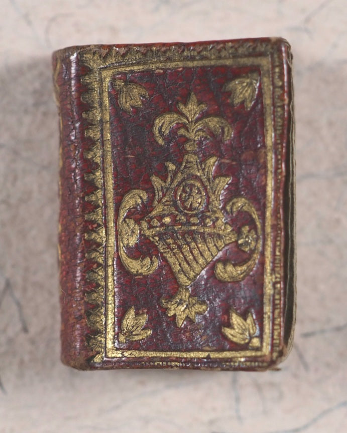64 printed pages in French, engraved throughout with 8 full-page engravings. Age-toned pages. Indistinct pencil marks on rear paste-down endpaper. Inner hinge split but still holding firm. All edges gilt. 17 x 22 mm. Original full ruby morocco; spine with geometric hand tooling in gilt; covers with gilt central rhombus decorated with flowers and leaves, flower corner-pieces within chevron tooled borders. Very minimal wear. Binding stays slightly open. Grolier, 145. Welsh, 5475. OCLC, 244788429. WorldCat locates one copy worldwide (Grolier Club).