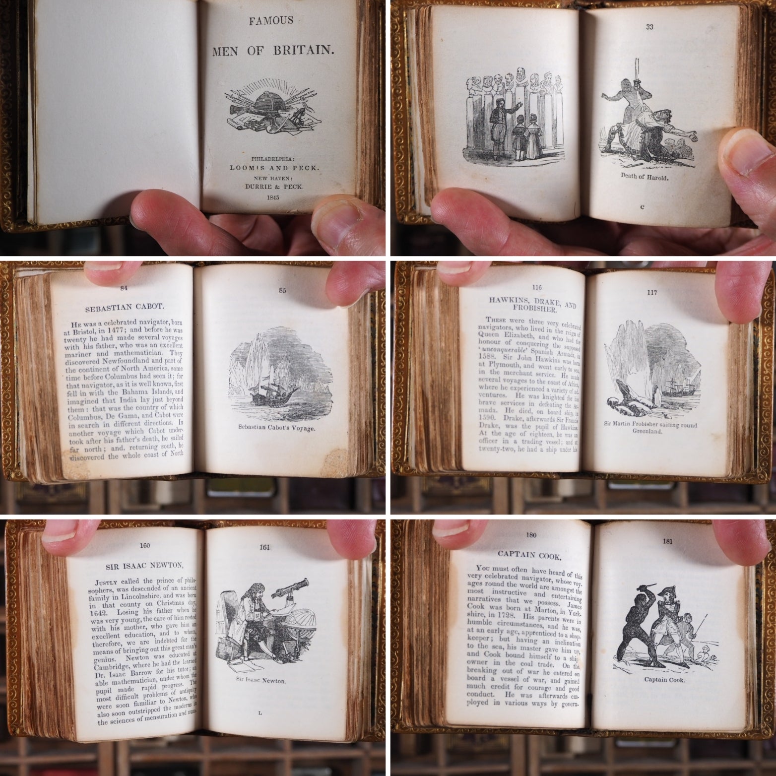 191 printed pages (some light age toning). Last page publisher's advert: "Miniature juveniles. Each containing 48 plates, and uniform with this volume.". 48 Illustrations, wood cuts; last page 1/5 missing at bottom (replaced with archival tissue). B.M. Dusenbery, stereotyper. Kay & Brothers, printers. Marbled endpapers. Inner gilt dentelles. All edges gilt (somewhat worn). Rounded corners. 66 x 82mm. Full new calf (a trifle rubbed). Spine with two blind stamped, raised bands; covers with gilt decoration and lettering on front. The same title was published in England by Tilt and Bogue circa 1841. It includes biographies of the Venerable Bede, Bacon, Robert Boyle, James Watt, Captain Cook, &c. Bondy, 67. Not in Spielmann. Welsh, 2773. Seller Inventory # 5318