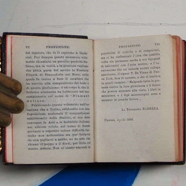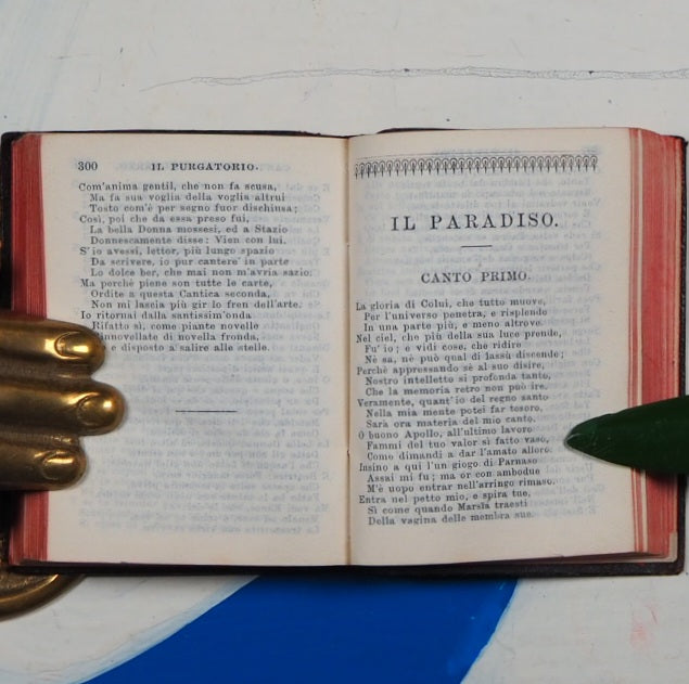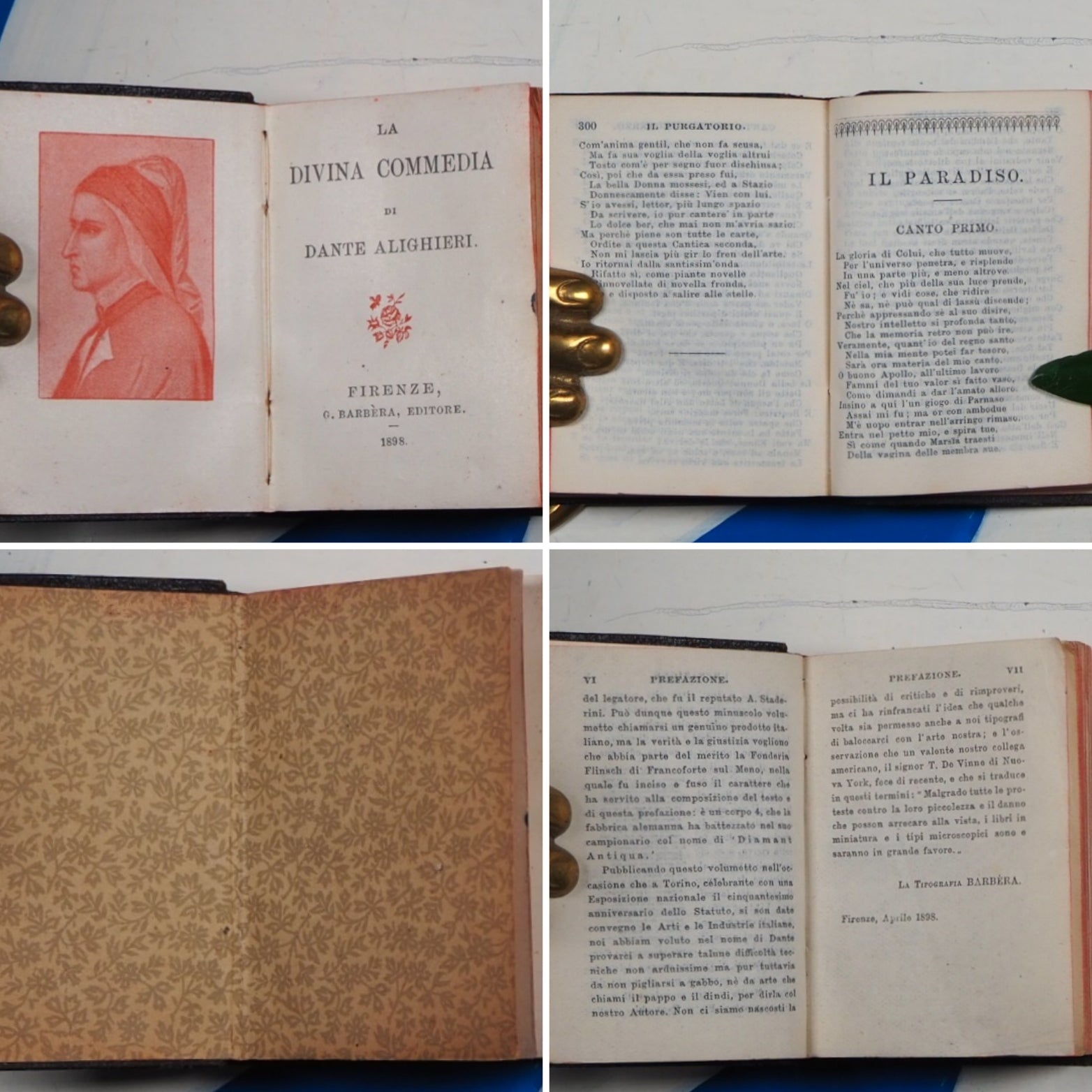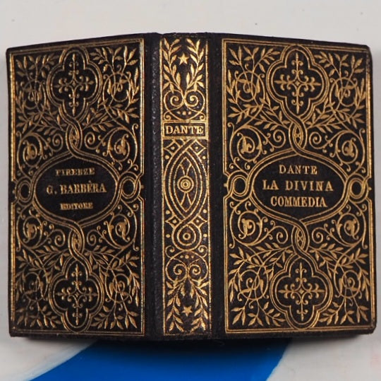 vii, 455 printed pages. Colour portrait frontispiece. Title page in black with red central rose decoration. Floral decorated endpapers. Later ink ownership signature on verso of front free endpaper. All edges red (little faded and with tiny black spot). A few corners slightly creased. 48 x 65 mm. Original black morocco with ornate stamped design. Spine with gilt titling above mandala motif with scrolling hearts and laurel leaf boughs above and below (slightly rubbed). Boards with central titling cartouche of strapwork and with scrolling feuron cornerpieces with laurel boughs, all within double linned gilt borders (corners a little worn). Dante was born in Florence in 1265. The Alighieri family came from a branch of the house of Elisei, founded by the wife of Cacciaguida, a warrior who died in the Second Crusade. Dante's parents (Alighiero di Bellincione Alighieri and Bella di Abati) were minor nobility, so he grew up among the aristocracy. Florence was utterly central to his life, but he ended up in exile & Dante died prematurely in Ravenna. However, it was during his exile that he began writing his great work The Divine Comedy. Dante chose the title because even though it begins tragically (Inferno), it ends pleasantly (Paradiso). The three-part epic poem was first published in 1320. Welsh, 2170. Seller Inventory # 5202