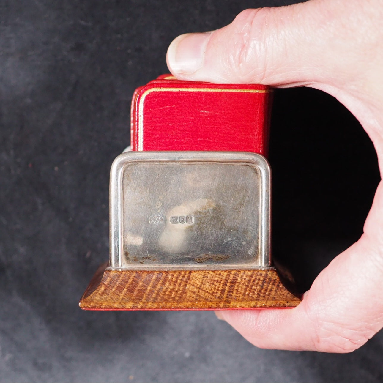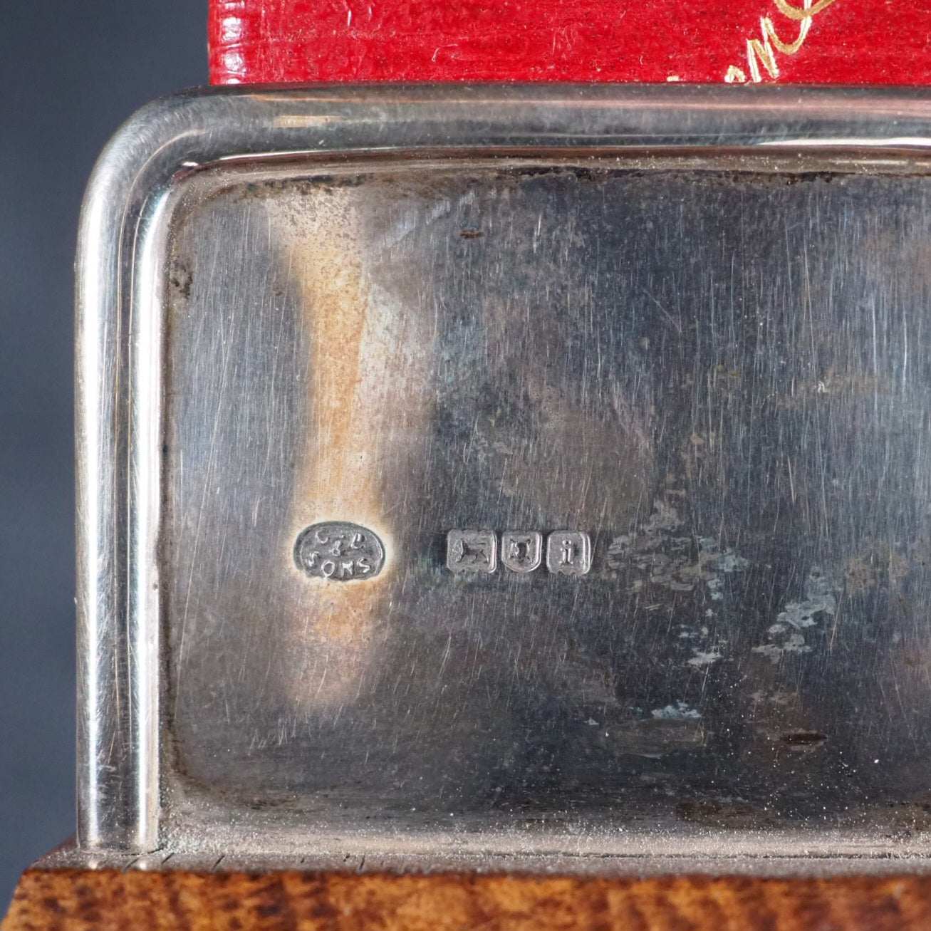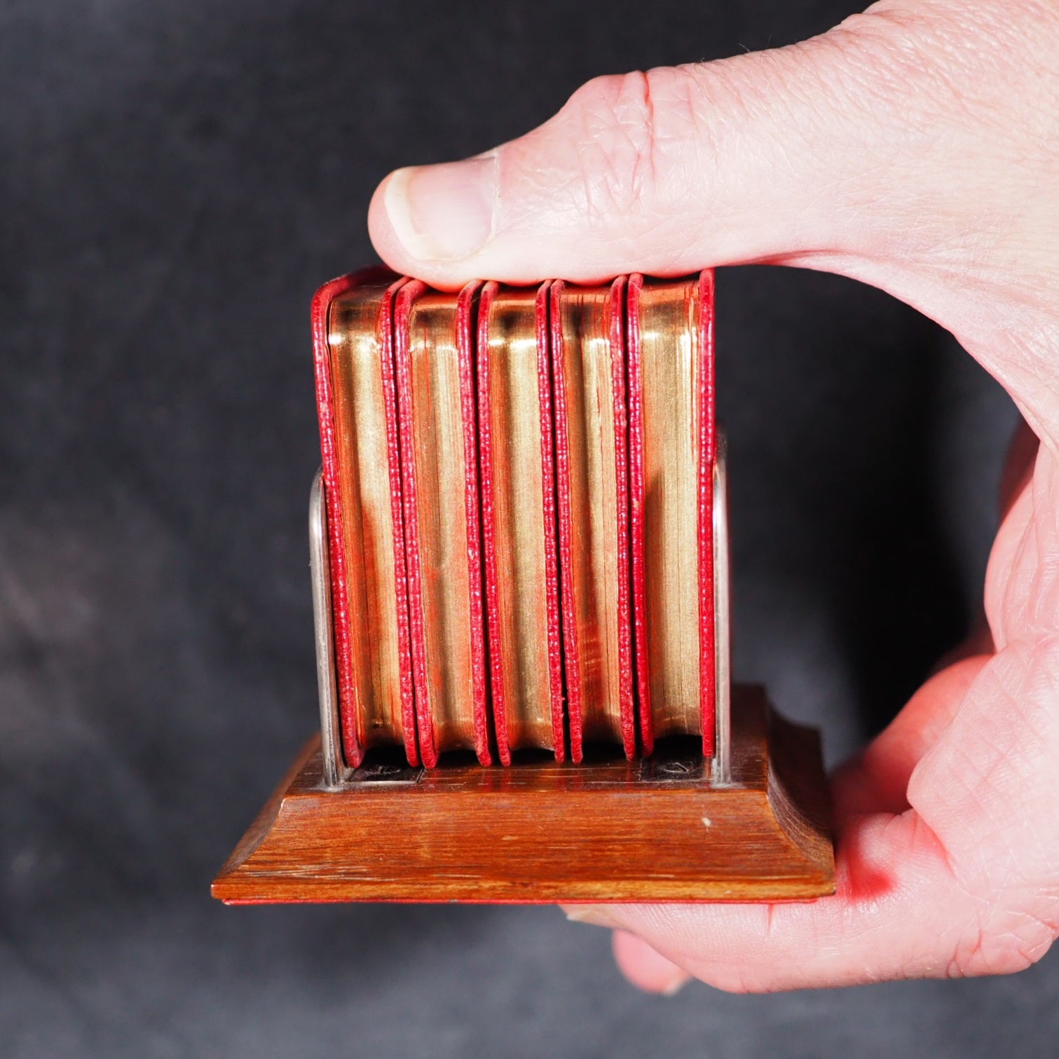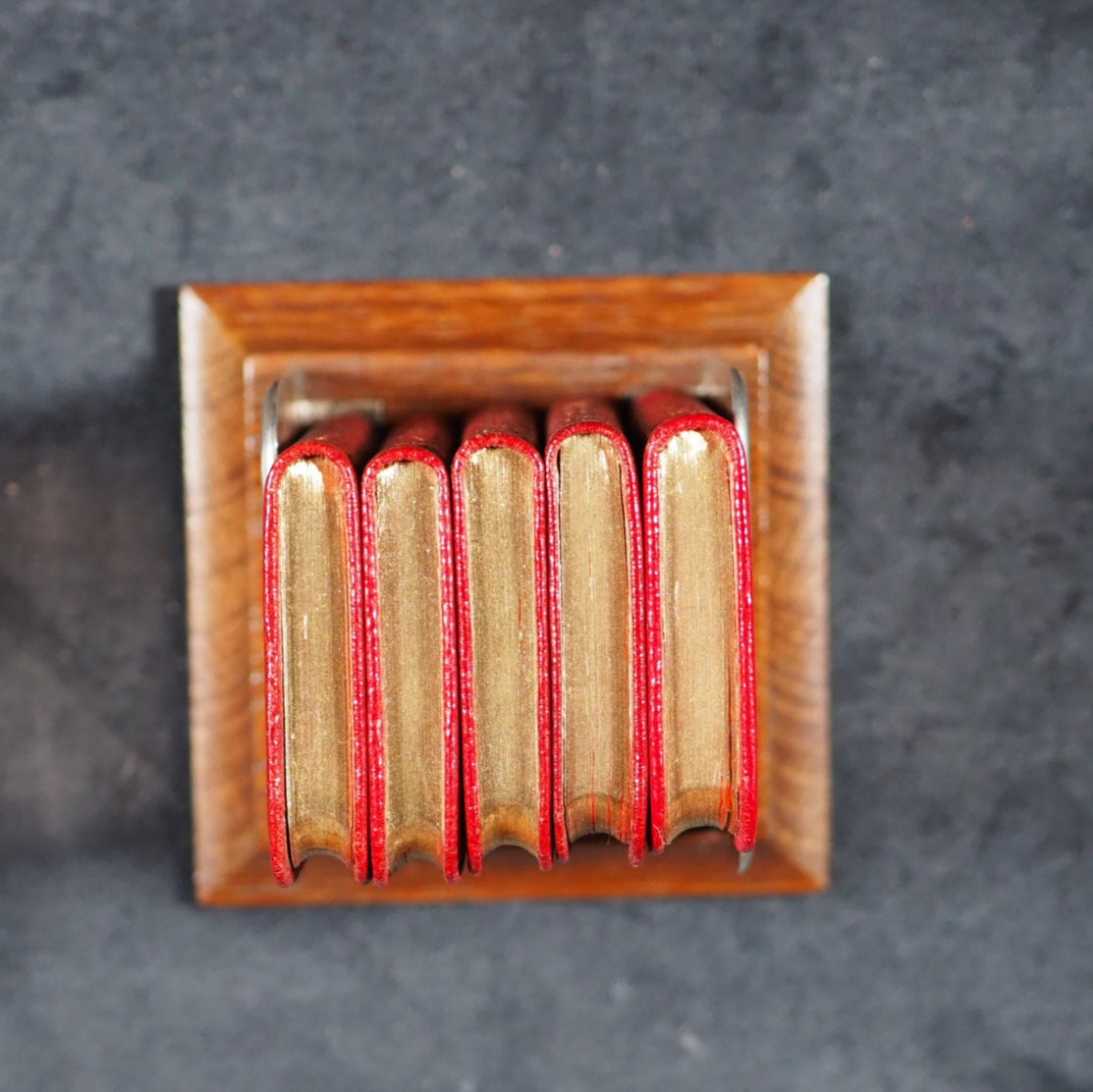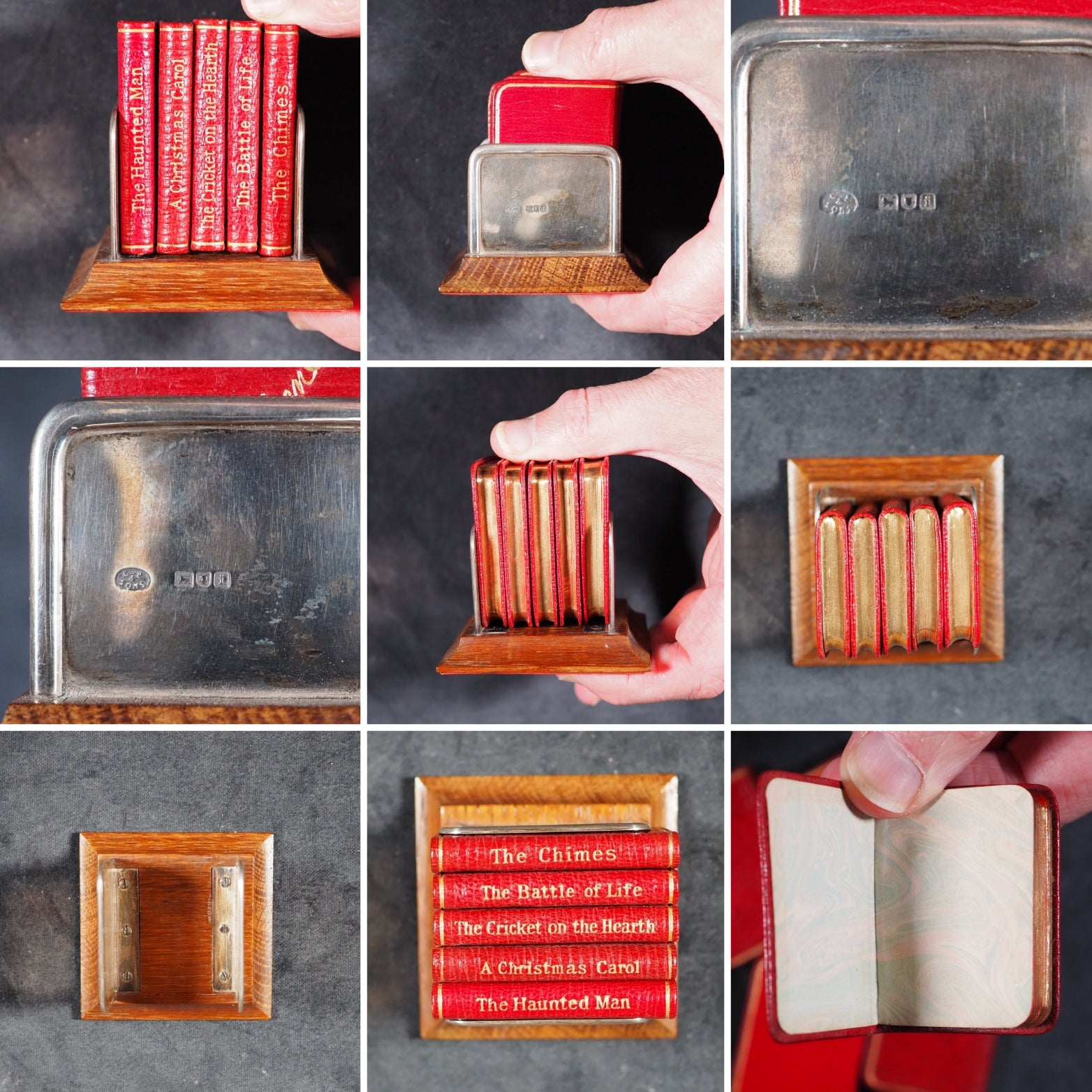 Dickens, Charles. Christmas Books [set of 5]. Frowde, Henry, London, Edinburgh, Glasgow, New York and Toronto. 1904. India Paper. Five volumes complete with oak mounted contemporary hallmarked silver stand for London 1904-5. Maker's mark G & B Sons. George Betjemann & Sons, Pentonville Road, London N1. Company purchased by Puddefoot, Bowers & Simonett Ltd, 1938. 1/ The Battle of life. 2/ The Chimes. 3/ A Christmas carol. 4/ The Cricket on the hearth. 5/The Haunted man; and, The Ghost's bargain. Rounded corners. Original marbled endpapers. All edges gilt over red. 40 x 52 mm. Original straight-grained red morocco. Facsimile Dickens signatures in gilt with single gilt ruled borders on front covers. Very good condition and unusual in contemporary hallmarked silver stand. Bondy, 118. Spielmann, 124. Welsh, 2358. OCLC, 58906020. WorldCat locates 7 copies worldwide. 61 firsts2024