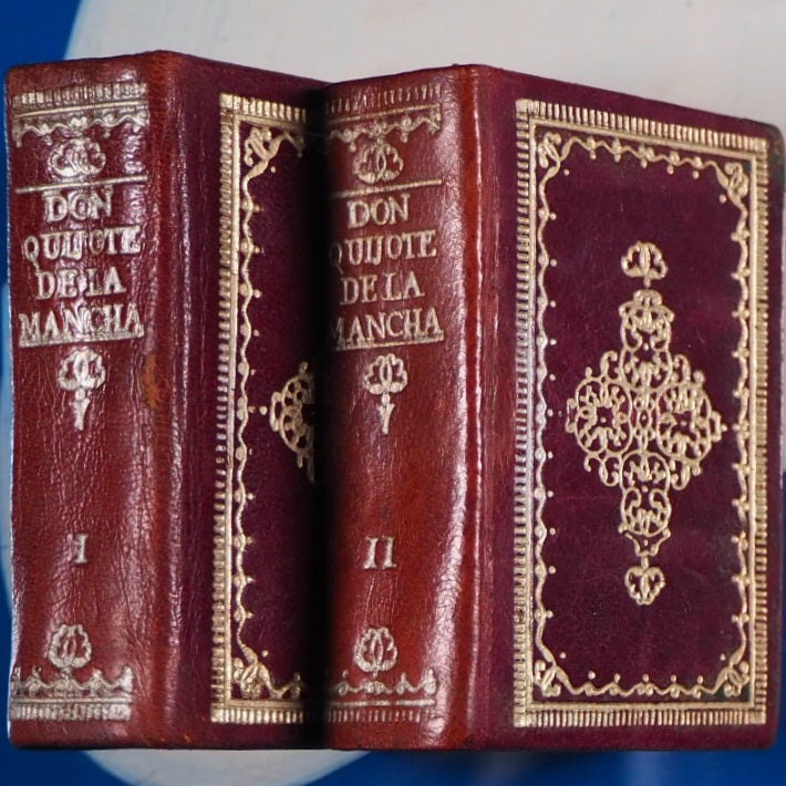 2 volumes in Spanish. 714, (1); 734 printed pages on very thin paper (leaves slightly wrinkled, 1st volume title page offset, frontispiece adhered to front paste down endpaper & lacking front free endpaper). 40 x 60 mm. Original chocolate brown leather (very slight wear to upper hinge of volume 1). Spines with silver decoration, volume numbers and titling. Boards with elaborately silver stamped fleurons within scrolling and dog-tooth borders. Complete with original slipcase, sprayed in gold over a re-brown underlay. Produced by photo-lithographic reduction. "A Spanish book which used to be encountered quite frequently but has now become scarce" (Bondy, 178 in 1981). Spielmann, 85. Welsh, 1707. Normally found in a green binding with gilt decoration, this is an uncommon variant of a complete and well-produced edition of the greatest Spanish classic, in charmingly small format. Seller Inventory # 5234