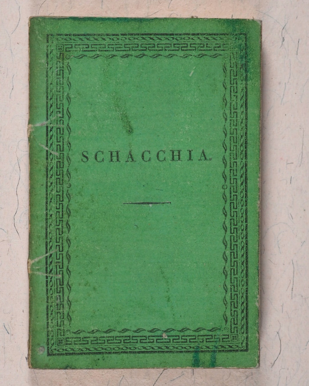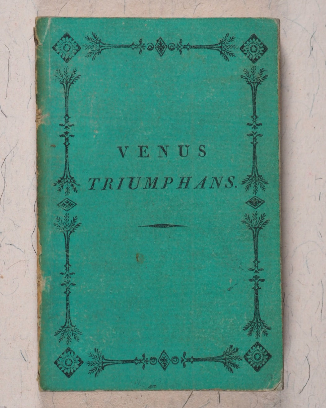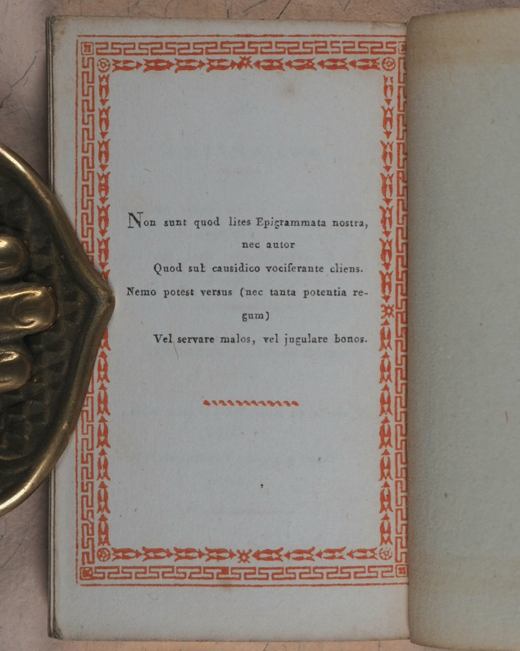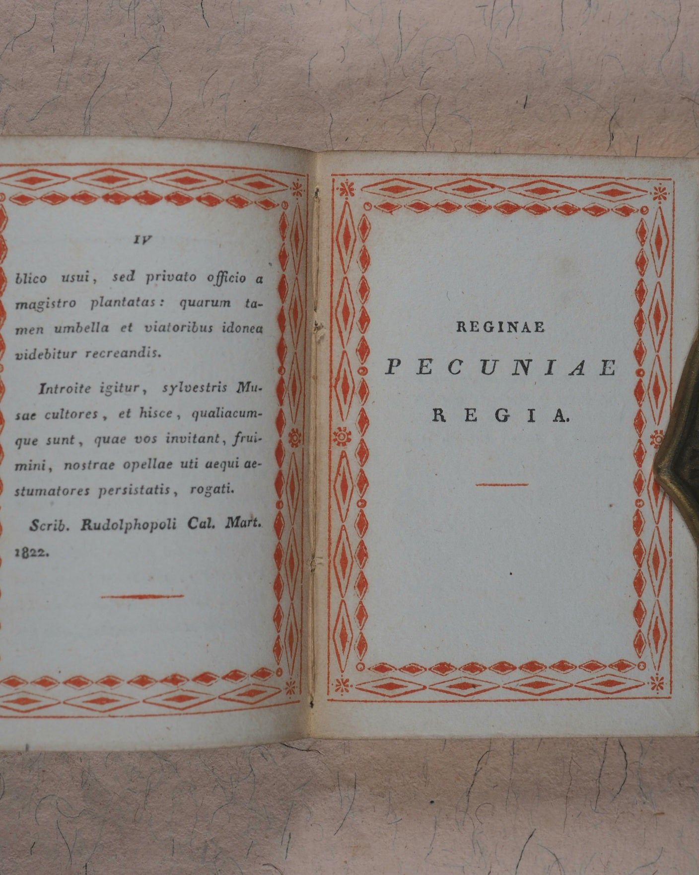 8 volume complete harlequin set of miniature editions with Latin texts. Published by Carl Poppo Fröbel, 1786-1824; black printed text in red borders, individually designed for each volume (minimally spotted; some corners creased; clean copies). The eight books are: 1/ Kaspar van Baerle, aka Caspar Barlaeus, 1584-1648. Virgo Androphoros cum Sponso Eginardo , 1821. vi, half-title, 72 pp. 2/ George Buchanan, 1506-1582. Varia , 1823. x, half-title, 100 pp. 3/ Jacob Cats, 1577-1660. Patriarcha Bigamoscui Hugonis Grotii Historiam Ionae , 1821. iv, 91 [1] pp. 4/ Helius Eobanus Hessus, 1488-1540. Venus Triumphans de qua Joa. Camerarius questus ab Eobano ad Thalamum ducitur et in Hispaniam abiens carmine celebrator , 1822. vi, 98 pp. 5/ John Owen, 1560-1622. Epigrammatum , 1820. vi, 89, [1] pp. 6/ Joannes Nicolai Secundus, 1511-1536. Basia Elegantiae Studiosis , 1821. [2], 60 pp. 7/ Joannes Nicolai Secundus, 1511-1536. Sylvae Deambulaturis Patefactae , 1822. vi, 89 pp. 8/ Marco Girolamo Vida, 1485-1566. Schacchia ludus [on the game of chess ] quem ludendi peritis una cum Iac. Balde Ludo Palamedis , 1820. iv, half-title, [1], 98 pp. All edges gilt. 92 x 61 mm. Elegant green, blue & cream printed card binding with ornamental borders (slightly rubbed). Housed in custom slipcase of brown card with ex-libris printed label on one side. Provenance: Adolf Fischer. Each of these editions were considered to be pre-eminent texts - individual volumes were also published in parallel in small octavo editions. After the eighth volume of the miniature edition, published in 1823, and finally with Froebel's death in 1824, the series finally came to an end. Froebel had resigned from his schoolmasters position in 1815 to purchase the Hofbuchdruckerei in Rudolstadt from Caspar Freyschmidt. His diligently printed volumes displayed elegant type, good quality paper and correct impressions. Froebel's knowledge of ancient and modern languages was also an advantage, because he was able to do the proofreading carefully, even correcting the authors. The Hofbuchdruckerei was censorship- free. The Prussian chamberlain Johann Georg Scheffner had his memoirs, which had been abridged by the censor Ernst Karl Wieland , reprinted by Froebel in Rudolstadt, with an appendix containing the passages that had fallen victim to censorship. He also printed the Katzensprung von Frankfurt a. M. to Munich , in the autumn of 1820 , in which Christian August Fischer attacked the Bavarian Minister Maximilian Emanuel von Lerchenfeld, causing the publisher Georg Hartknoch to receive 8 days in prison & fine of 20 thalers and the author 3 years in prison, but Carl Poppo Fröbel remained unpunished because he was under foreign jurisdiction. No copies of the 8 books in WorldCat apart from Schacchia ludus -7 copies. Not in Bondy, nor Spielmann. Welsh, 1687, 3299, 5437, 6221, 6223, 6946. Nauroy, 75-6. E.O.B., 1840, Jenaische Allgemeine Zeitung (36, 225ff). Very uncommon complete.