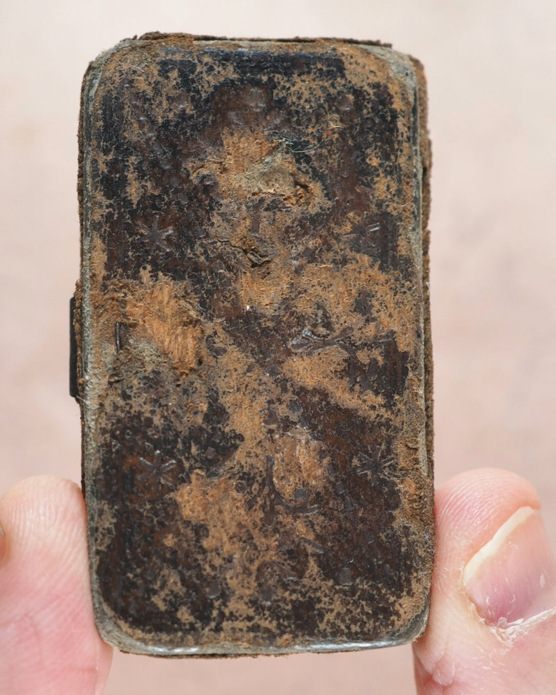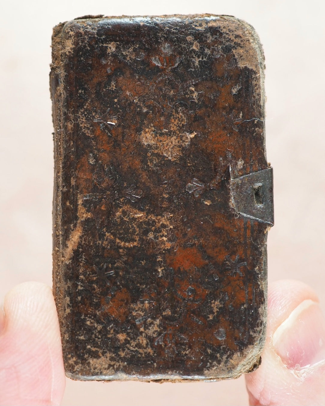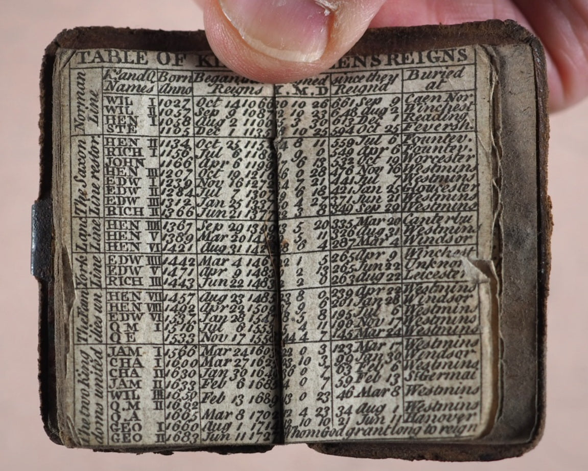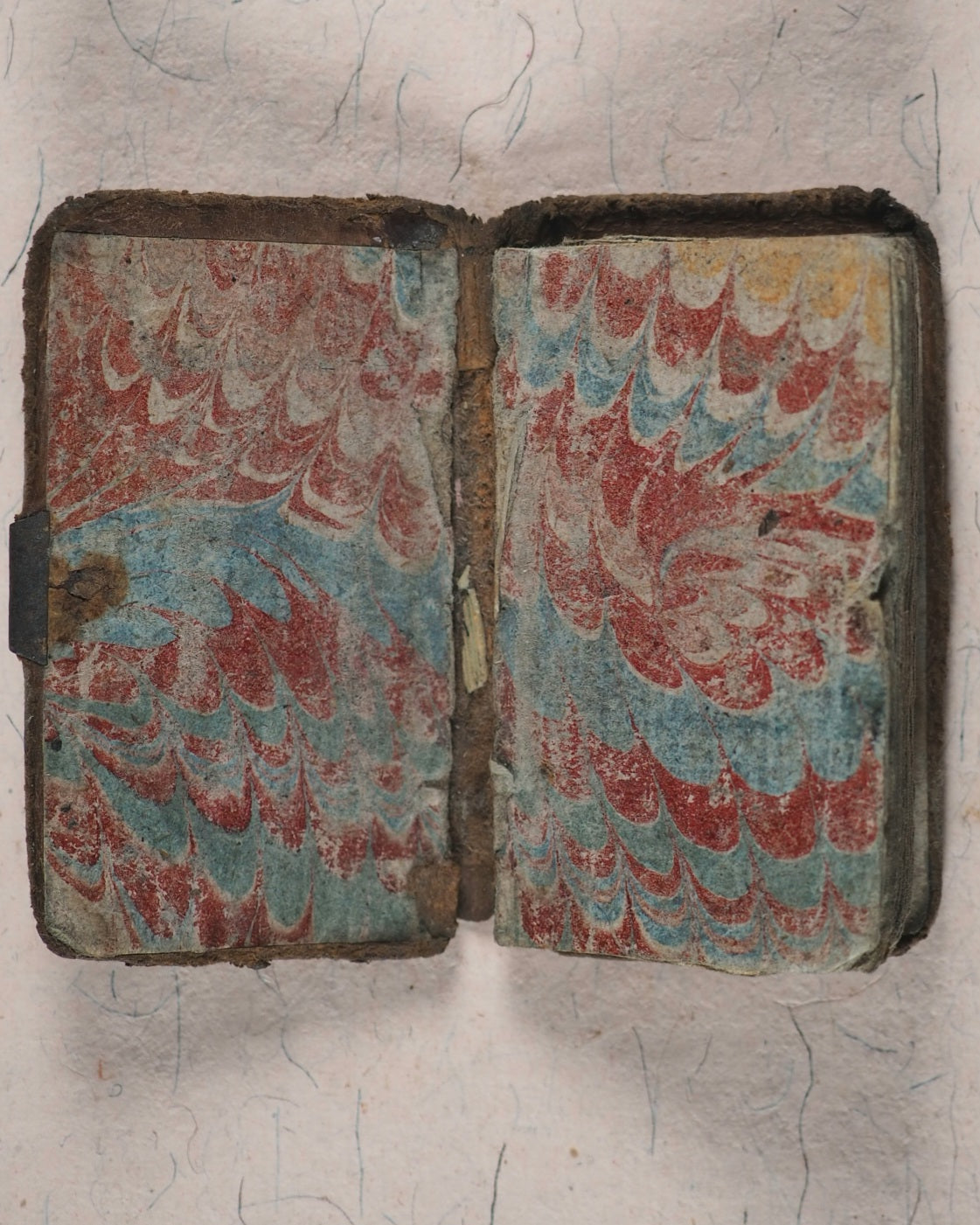 20 unnumbered leaves. Table of King's & Queen's reigns, Lord Mayors & Sheriffs, interest tables.  Folding copper engraving of Christ's Hospital (London views were not incorporated until about 1736).  An exceptionally early and very uncommon London Almanack. Doris Welsh only mentions Ruth Adomeit's copy and no others. The calendar shows changes of the moon, days of the month, saints days; includes an engraving on a folded leaf of a panoramic view of "Christ's Hospital," "Table of Kings & Queens reigns," list of "Lord mayors and sheriffs from the year 1723 to the year 1748," and "A Table exhibiting at one View the Value of Portugal Pieces in English Pounds, Shillings, and Pence". Engraved throughout; printed on one side only.  A similar edition from a different year is in the Queen Mary's Dolls' House in Windsor Castle. Title page with tear at top corner leaving small loss. Some leaves slightly worn due to the clasp. Age-toning throughout. Original marbled endpapers. Near contemporary ownerhip inscriptions dated 1757 and 1807. Provenance: Isaac Pendlebury. 32 x 57 mm. Contemporary brown calf with blind embossed floral and pointillé decorative covers. Wonderful patina. Slightly rubbed with areas of wear particularly at the corners , missing  brass clasp, and defective lower hinge - still holding.  Not in Spielmann. Welsh, 4548. OCLC, 767599075. WorldCat locates one copy worldwide (Indiana University Library).
