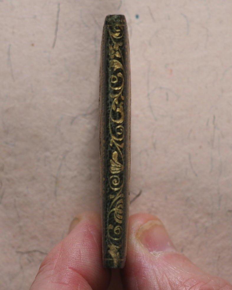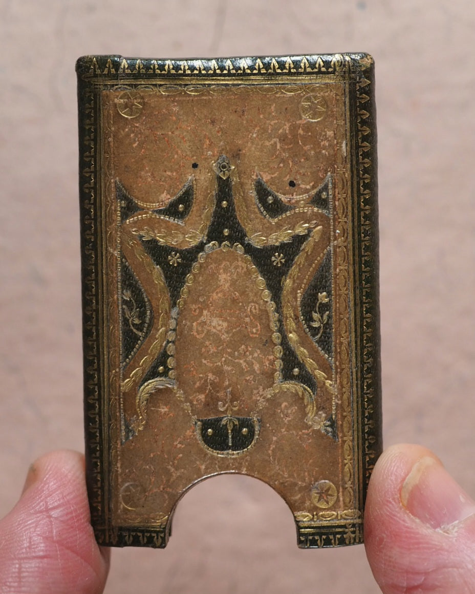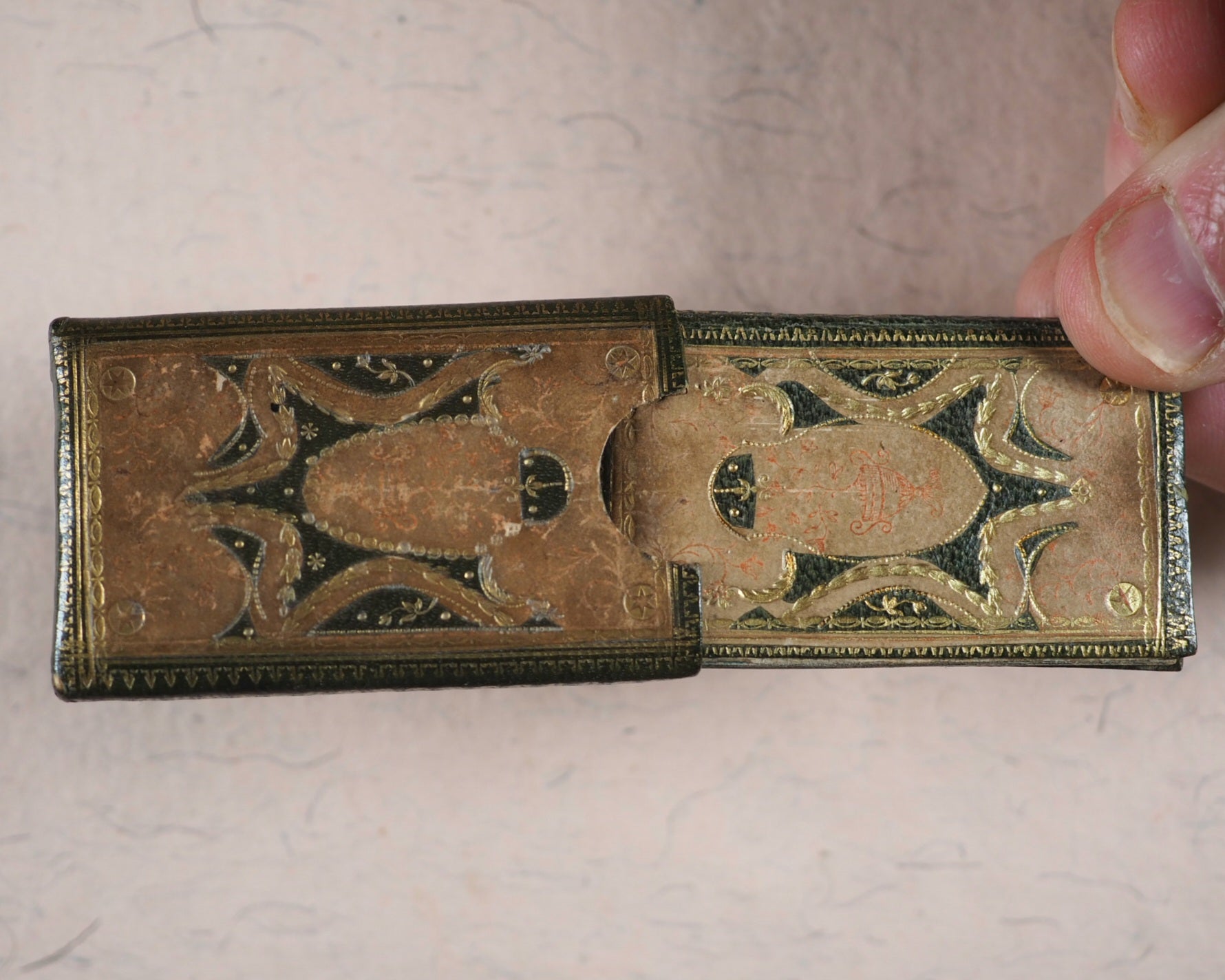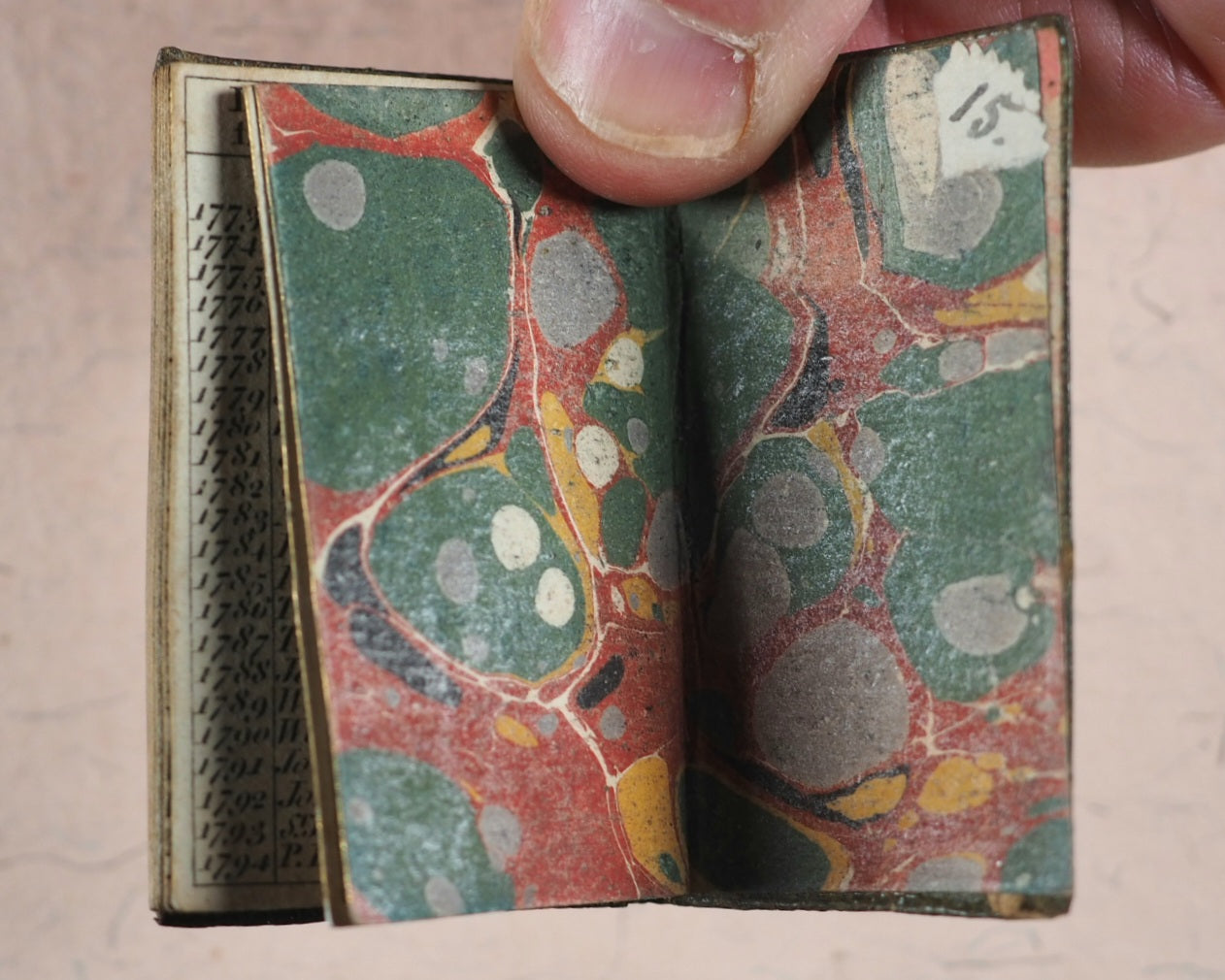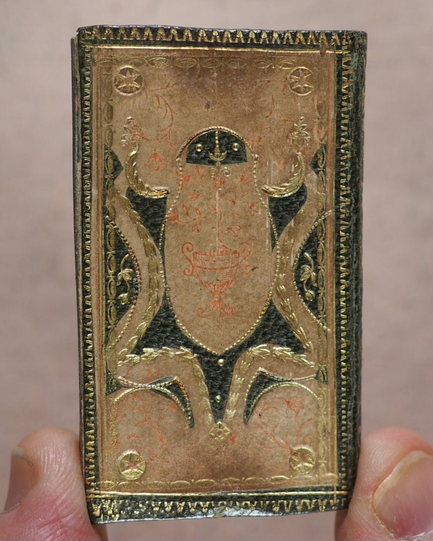 London Almanac for the year of Christ 1794. Matching slipcase, 22 unnumbered printed pages, duty stamp, including saints days, calendar, table of Kings and Queens, Lord mayors & sheriffs, holidays and current coins. Engraved full-page illustrations of the Coal Exchange, Thames Street. All edges gilt. Original marbled endpapers. 30 x 60 mm. Original green leather venetian mosaic binding with decorative motifs in gilt and cream overlays in the central panels. Matching vertical slipcase. Slipcase and covers very slightly rubbed. First produced in 1749 -that first edition survivng in a unique copy at the British Library - the London Almanac continued annually until 1889. A similar edition is in the Queen Mary's Dolls' House in Windsor Castle. Bondy, 39 and 164. Neelands/Joffe, 34. Not in Spielmann. Welsh, 4587. OCLC, 37853937. WorldCat locates 4 copies worldwide (British Library, Huntington, Baylor, and Washington St. Louis).