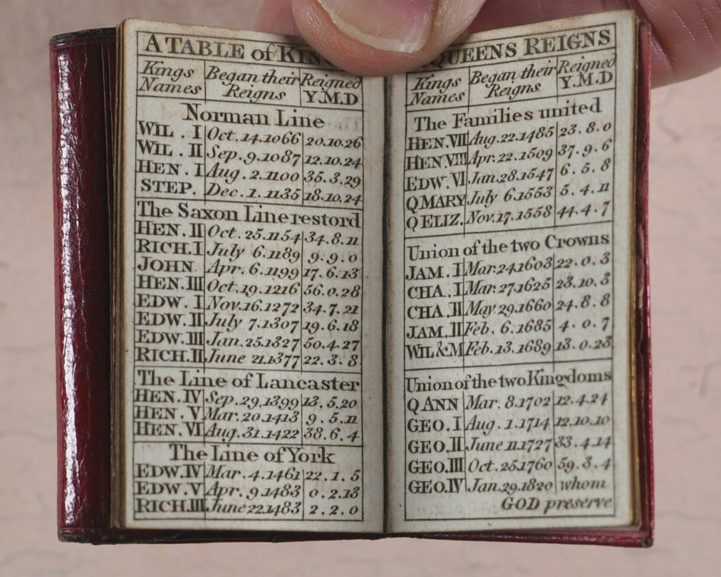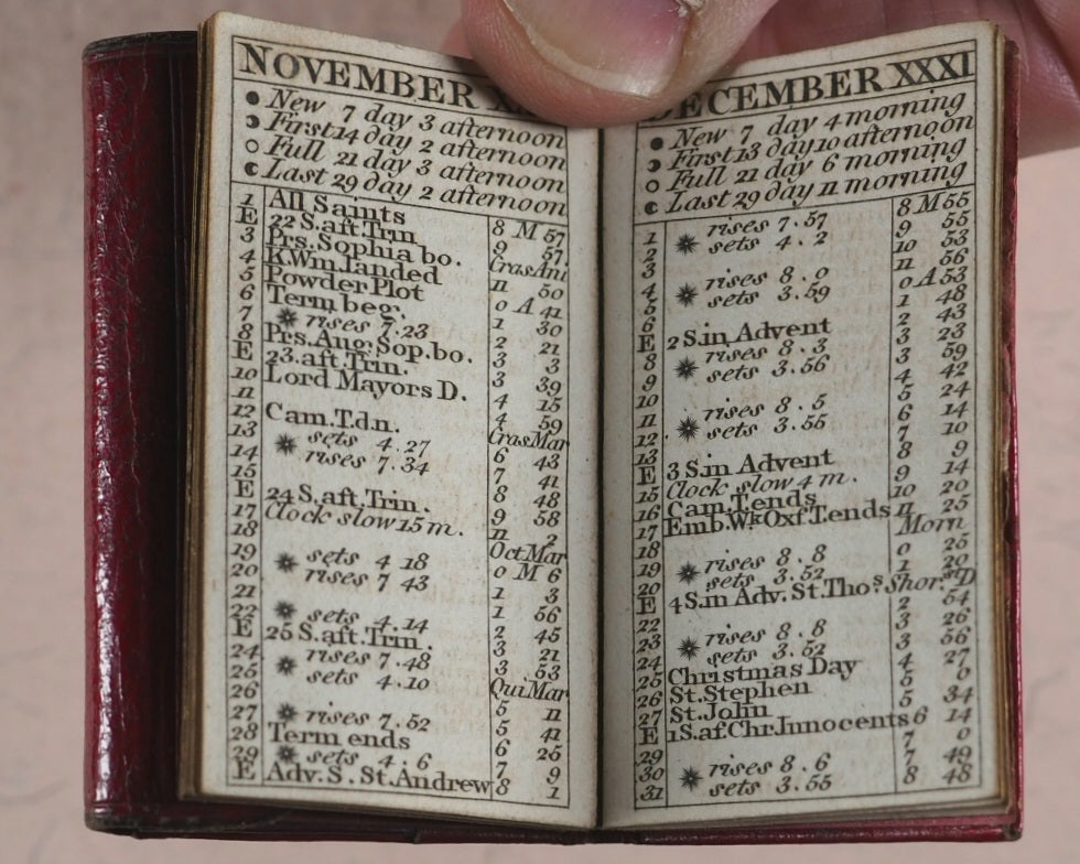 London Almanac for the year of Christ 1828. 38 printed pages, duty stamp, including saints days, calendar, table of Kings and Queens, Lord mayors & sheriffs, holidays and current coins. The Grand Entrance of Hyde Park and the Lodge of the King. All edges gilt. Original rose endpapers. 35 x 32mm. Wallet style binding.  Original maroon leather with original silver clasp, internal pocket, and button operated catch. Very slight edge wear. A similar example of this book can be found in Her Majesty Queen Mary's Dolls' House at Windsor Castle. Not in Spielmann. Welsh, 4631. OCLC, 1100791584. WorldCat locates 2 copies worldwide (British Library and Vassar College).