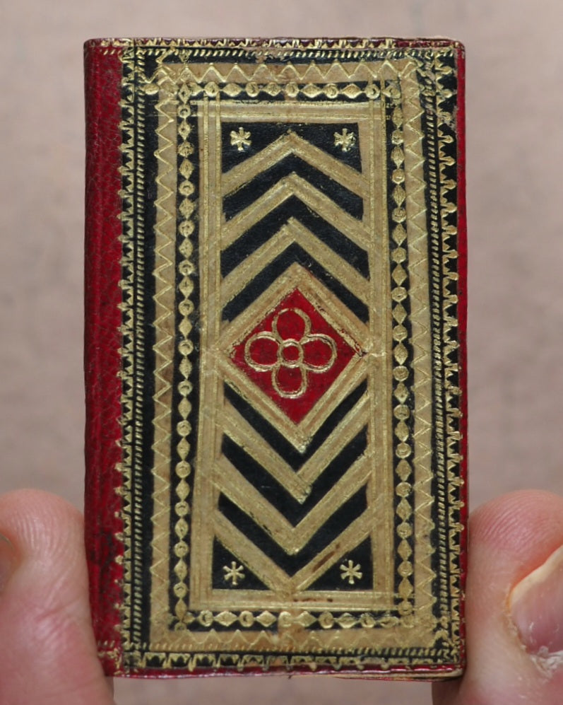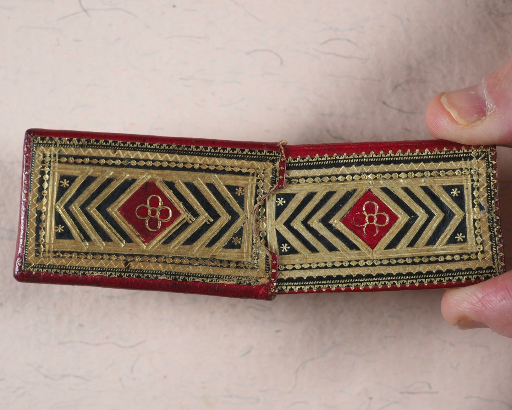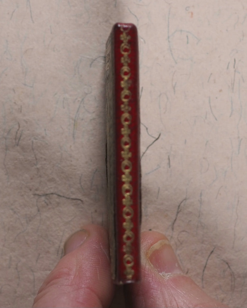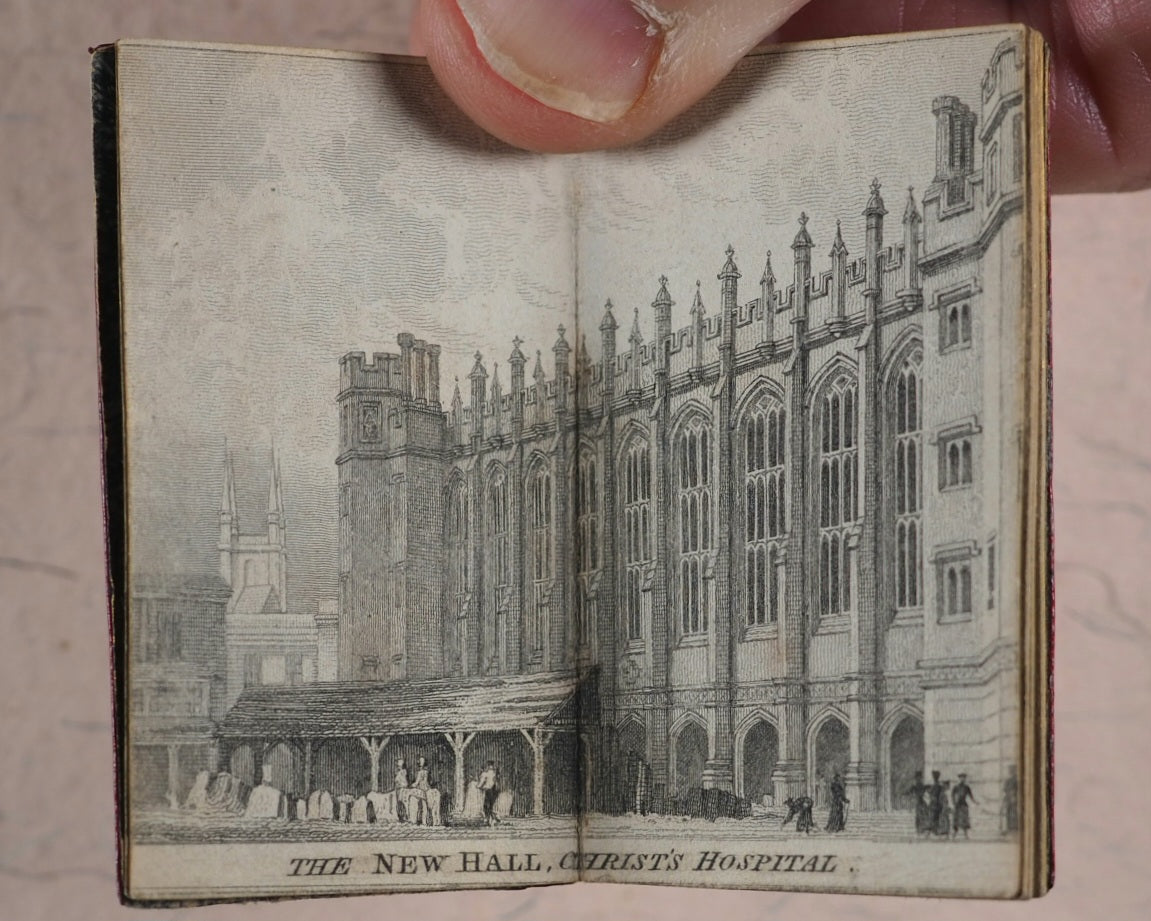 London Almanac for the year of Christ 1829. Matching slipcase, 22 unnumbered printed pages, duty stamp, including saints days, calendar, table of Kings and Queens, Lord mayors & sheriffs, holidays and current coins. Engraved full-page illustrations of the New Hall, Christ's Hospital. All edges gilt. Original marbled endpapers. 30 x 60 mm. Original red leather venetian mosaic binding with stylised chevron and flower motifs in gilt in the central panels. Matching vertical slipcase. Slipcase very slightly rubbed. First produced in 1749 -that first edition survivng in a unique copy at the British Library - the London Almanac continued annually until 1889. A similar edition is in the Queen Mary's Dolls' House in Windsor Castle. Bondy, 39 and 164. Not in Spielmann in this format. Welsh, 4633. WorldCat locates no copies of this format and this edition, worldwide.