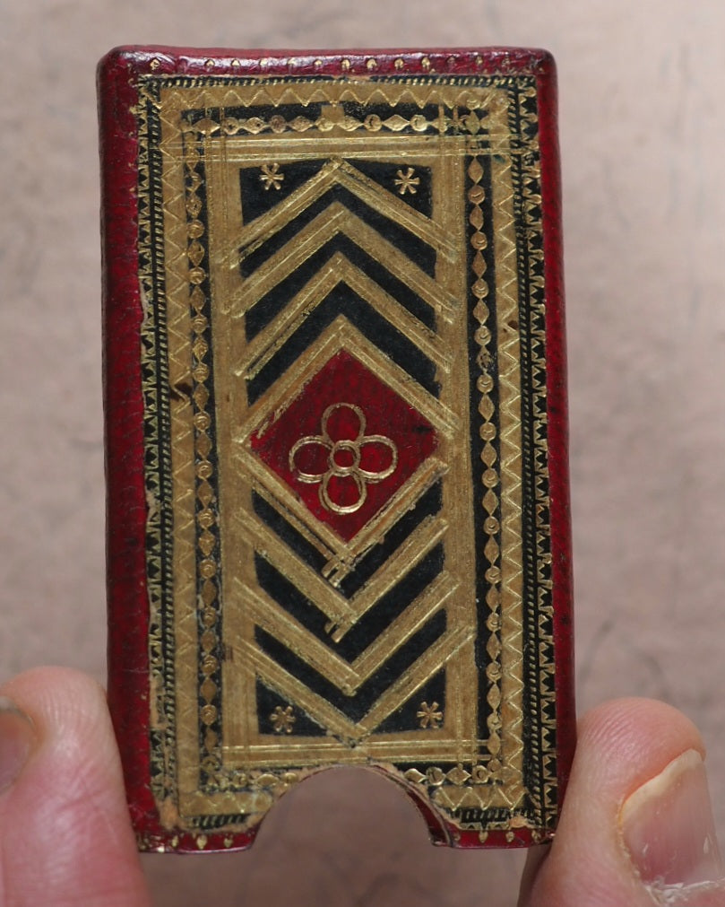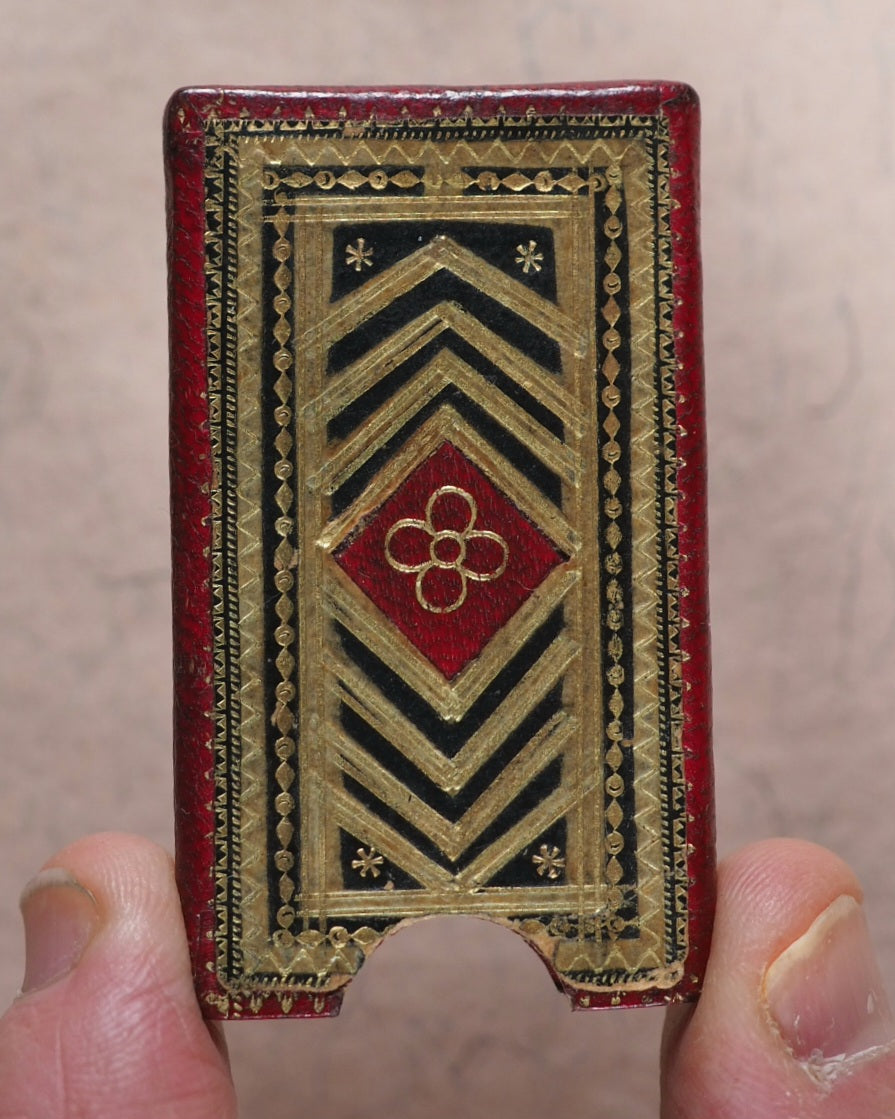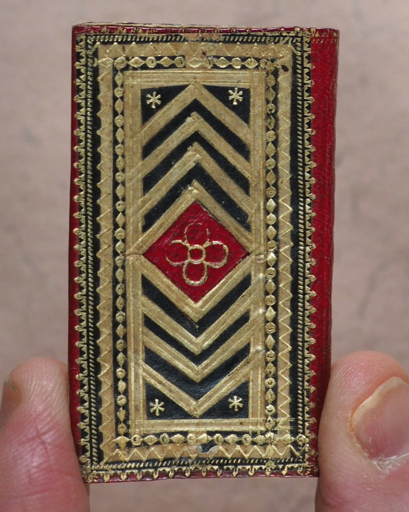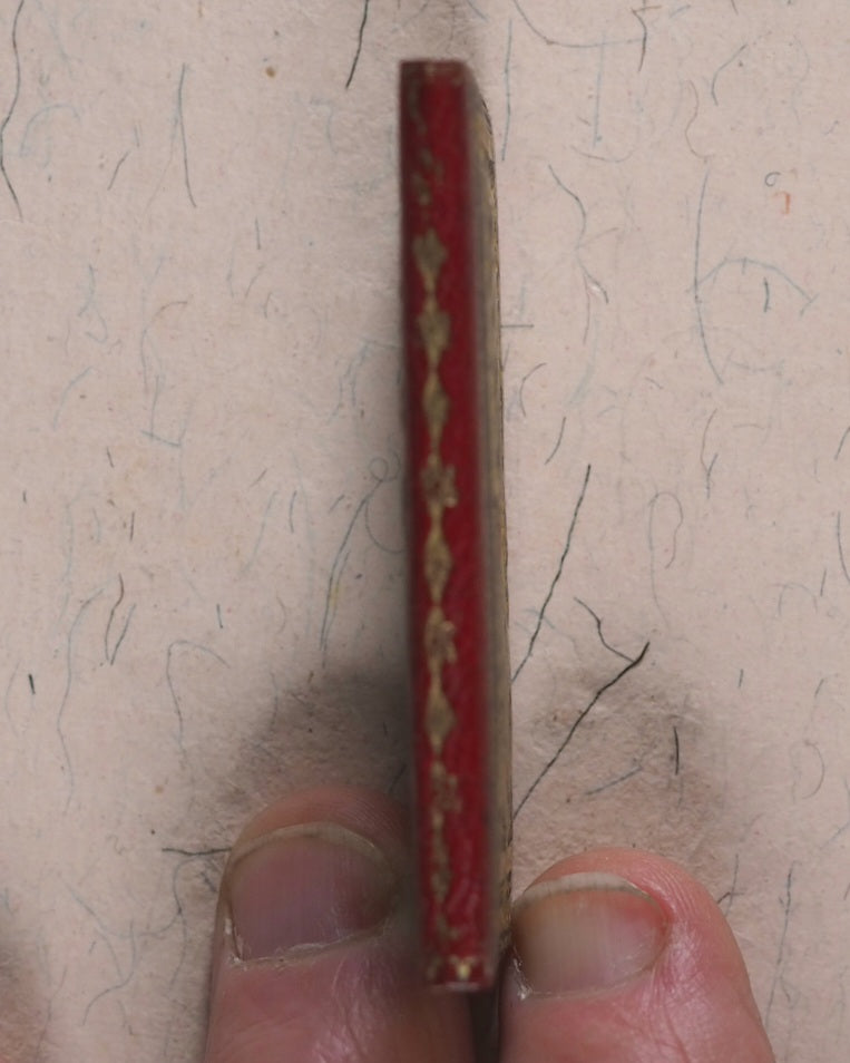 London Almanac for the year of Christ 1829. Matching slipcase, 22 unnumbered printed pages, duty stamp, including saints days, calendar, table of Kings and Queens, Lord mayors & sheriffs, holidays and current coins. Engraved full-page illustrations of the New Hall, Christ's Hospital. All edges gilt. Original marbled endpapers. 30 x 60 mm. Original red leather venetian mosaic binding with stylised chevron and flower motifs in gilt in the central panels. Matching vertical slipcase. Slipcase very slightly rubbed. First produced in 1749 -that first edition survivng in a unique copy at the British Library - the London Almanac continued annually until 1889. A similar edition is in the Queen Mary's Dolls' House in Windsor Castle. Bondy, 39 and 164. Not in Spielmann in this format. Welsh, 4633. WorldCat locates no copies of this format and this edition, worldwide.