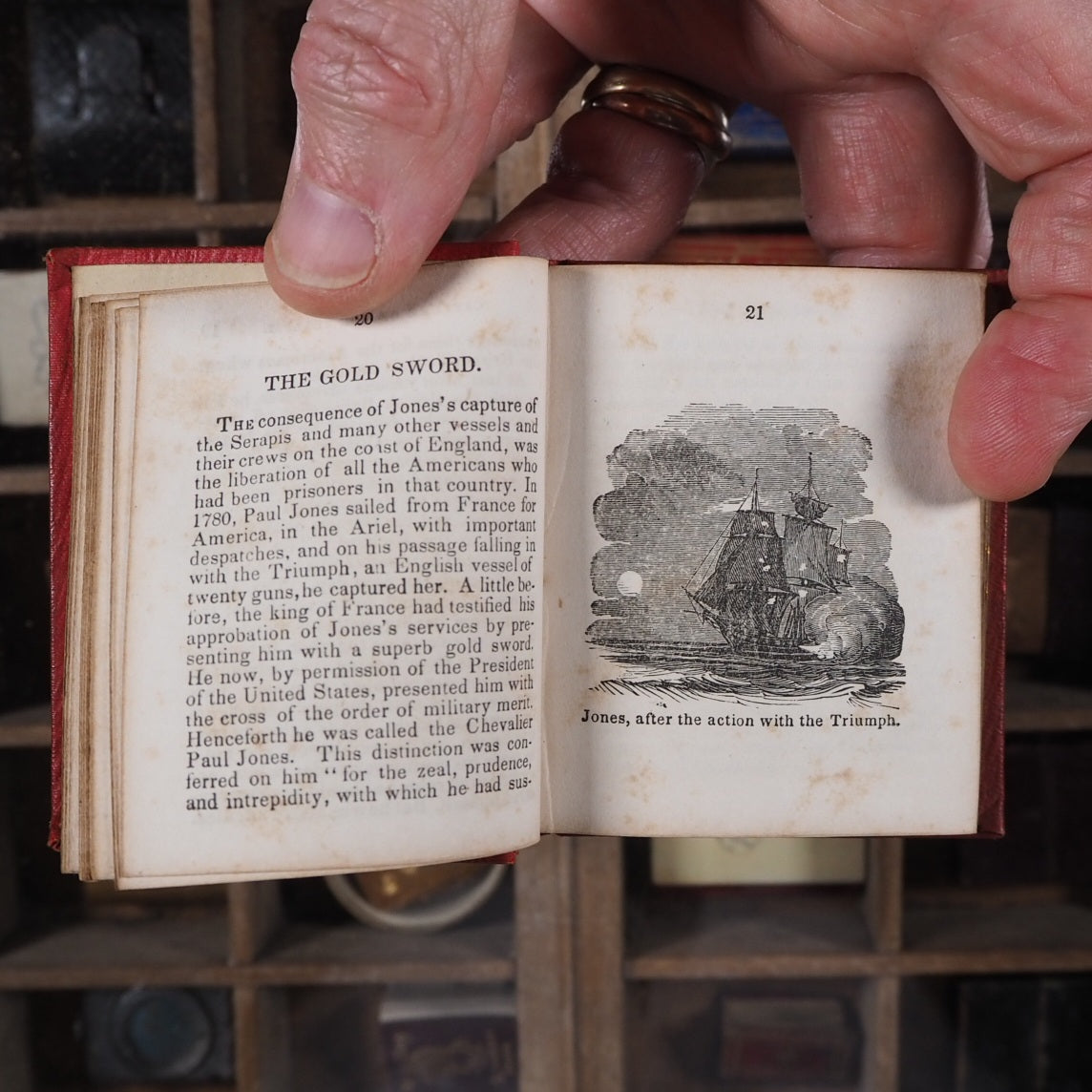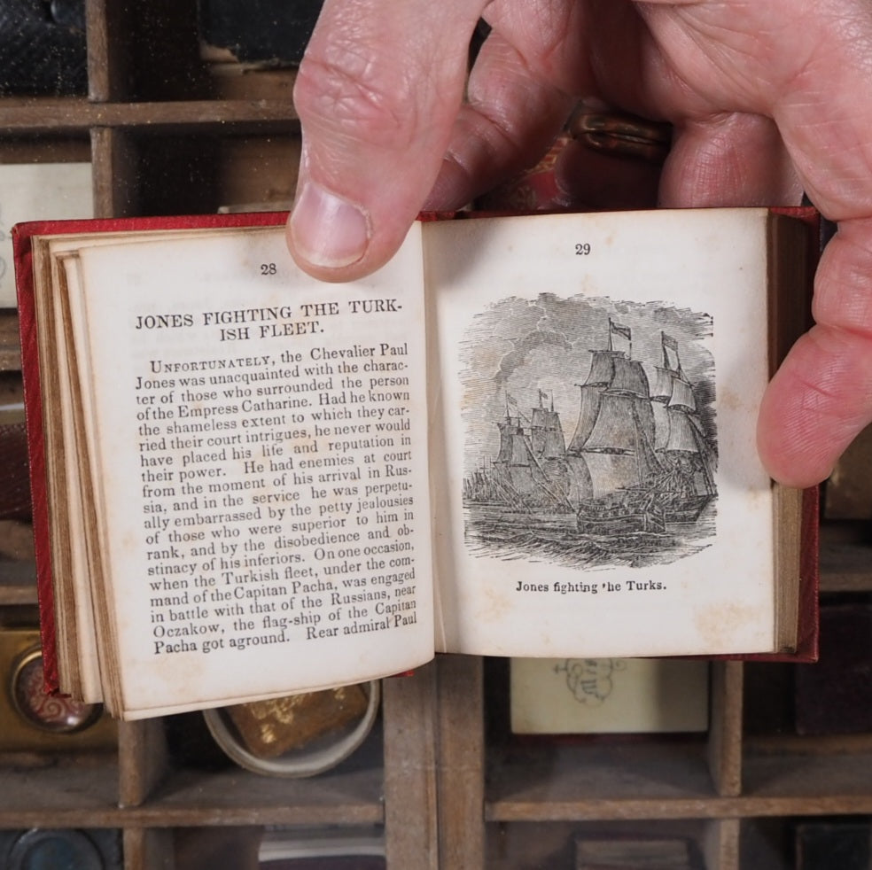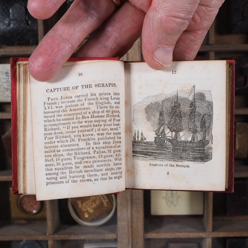 189 printed pages including 48 woodcut full-page illustrations. Contemporary pencil owners' inscription on verso of blank preliminary, dated 1854. All edges gilt. 2.7 x 3.1 inches. Original embossed red cloth (slightly rubbed). Cover with half profile portrait of John Paul Jones in gilt within embossed border; gilt spine with scrolling floral decoration, title and eagle (small area of spine missing). Provenance: Everett A. Roys, 1842-1920 of Sheffield, Berkshire County, Massachusetts, USA. Not in Bondy nor Spielmann nor Welsh. WorldCat locates just 11 copies, all in the USA. Seller Inventory # 5306