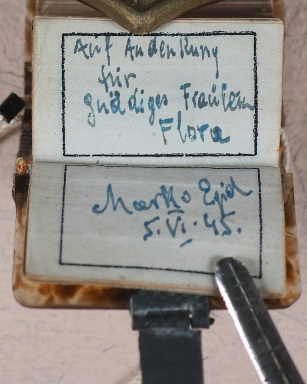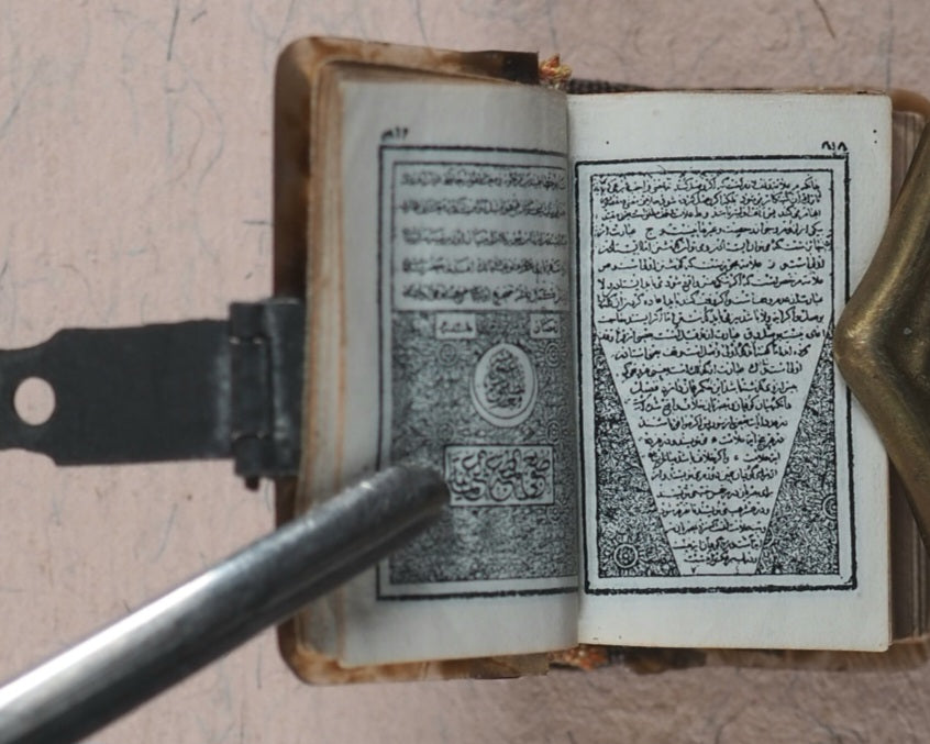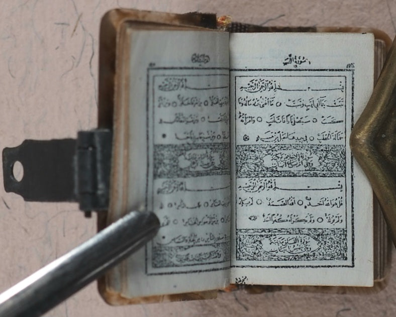 Koran or Qu'ran.  About 800 printed pages in Arabic. Fine 'India' paper. Lithographed text and marginal decoration within ruled borders. Miniature Koran with richly decorated opening double page frontispiece. Fully vocalized text set in a frame, verse separators, sura headings and section markers in the margins printed in black throughout. Printed at the press of Hans Steinbrener since the early 1900s; with the new millennium, the shop closed down and ceased production. Complete with original matching magnifier attached by a silk woven thread.  Original black and gilt patterned endpapers.  Near contemporary ink inscription on rear free emdpaper in German, and dated Eid 5.6.1945. 24 x 34 mm. Original tortoise-shell binding with brass clasp and catch; rounded corners; green, red, black and gilt quatrefoil decoration down centre of front cover. Cover decoration with minuscule wear near bottom edge.  OCLC,  1056953795. WorldCat locates 2 copies worldwide.