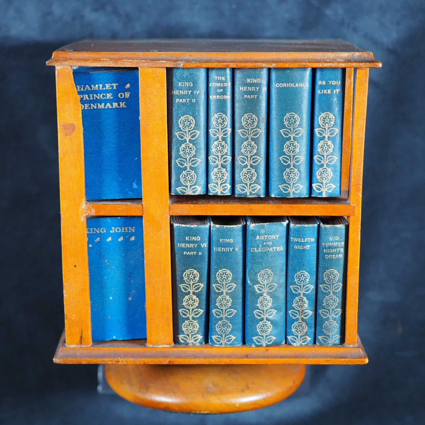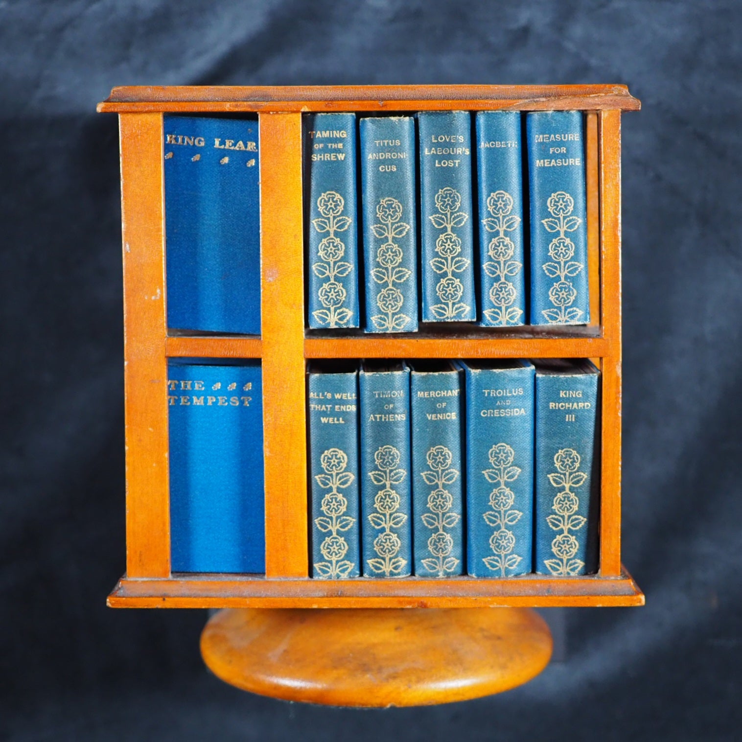 This is a complete 40-volume miniature book set of Shakespeare's works. Complete with frontispieces and portraits. Edited by J.Talfourd Blair. Dedicated to the actress Ellen Terry and printed in 1904 in Glasgow by David Bryce and Son and published jointly in New York by Frederick A. Stokes Company. Red silk place markers. Original black endpapers. All edges red. Contemporary ink inscrip[tion on verso of front free endpaper, dated 1906. The books measure 38 x 55 mm. Original royal blue cloth with gilt triple rose motif decoration on the spines (some minor rubbing to the edges of the spine and some cover edges. A couple of the books have front hinges starting to crack or a small crack in the text block, but still holding firmly). Housed in the original light stained 8-compartment revolving wooden sycamore bookcase - four sides with two compartments in each side, each holding 5 books (minor slight chipping to some edges). It is on a matching small wooden pedestal and rotates to imitate a full-size version of such a bookcase. Of the Ellen Terry series, Louis Bondy wrote that these volumes are "Bryce's greatest achievement as a leading promoter of miniature books," and, in particular, he describes the Shakespeare as "the most prodigious of these sets" (Bondy, p.114). Most of the sets were printed in 1904. Included are all the plays, the sonnets, a biographical sketch, and glossary. A beautiful and sought after Shakespeare set that is more commonly found in reverse calf or ivorine bindings. Bromer, 51. Garbett, 41. Spielmann, 459. Welsh, 6264. American Art Association, 182. This is an uncommon complete miniature book set, meticulously printed and bound for the David Bryce Company in Glasgow, noted for their miniature book production. Bromer, 51.Garbett41. Spielmann, 459. Welsh, 6264. OCLC, . WorldCat locates copies worldwide. 8 firsts2024