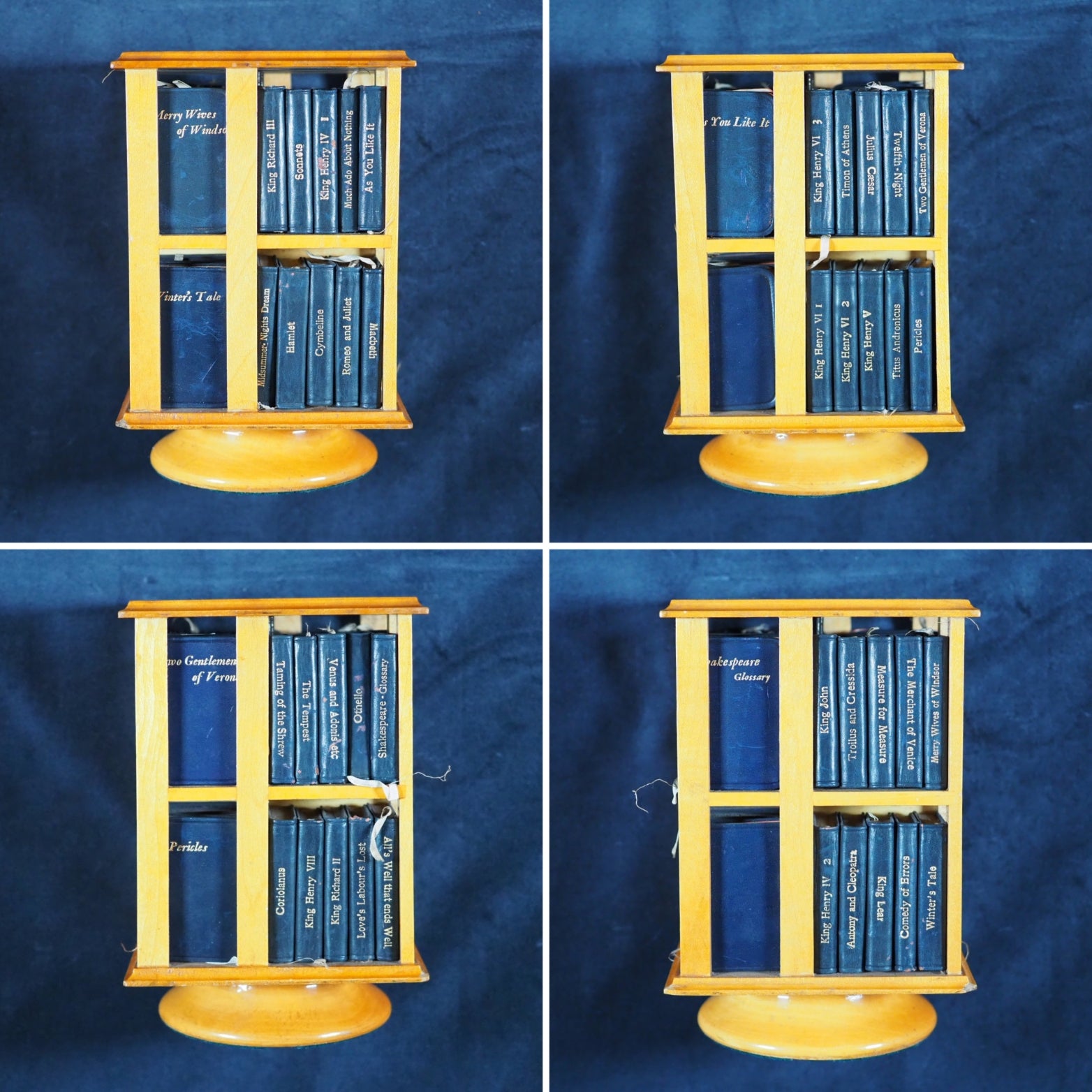 Shakespeare, William. Ellen Terry Complete Works of William Shakespeare, in 40 volumes. Bryce, David & Son. Glasgow. 1904. Complete Works. [Slimmer revolving bookcase].Complete 40-volume miniature book set of Shakespeare's works. Complete with frontispieces and portraits. Edited by J.Talfourd Blair. Dedicated to the actress Ellen Terry and printed in 1904 in Glasgow by David Bryce and Son and published jointly with Henry Frowde, Oxford University Press Warehouse, Amen Corner. Rounded corners. Marbled endpapers. All edges gilt over red. Original ivory silk place-markers. The books measure 38 x 55 mm. The bookcase is 100 x 100x 160 mm. Original full dark blue calf with gilt titling on the spines (minusculee amount of rubbing to the edges of the spines and some cover edges). Housed in the original light stained 8-compartment revolving wooden sycamore bookcase (four sides with two compartments in each side, each holding 5 books; no obvious chipping to edges). It is on a matching small wooden pedestal and rotates to imitate a full-size version of such a bookcase but the books have finer India paper, are slimmer and the bookcase is also the slimmer version of two sizes issued for Bryce Shakespeare sets. Of the Ellen Terry series, Louis Bondy wrote that these volumes are "Bryce's greatest achievement as a leading promoter of miniature books," and, in particular, he describes the Shakespeare as "the most prodigious of these sets" (Bondy, p.114). Most of the sets were printed in 1904. Included are all the plays, the sonnets, a biographical sketch, and glossary. A beautiful and sought after Shakespeare set that is more commonly found in reverse calf or ivorine bindings. Bromer, 51. Garbett, 41. Spielmann, 459. Welsh, 6264. American Art Association, 182. This is an uncommon complete miniature book set, meticulously printed and bound for the David Bryce Company in Glasgow, noted for their miniature book production. Bromer, 51.Garbett41. Spielmann, 459. Welsh, 6264. OCLC, . WorldCat locates copies worldwide. 124 firsts2024