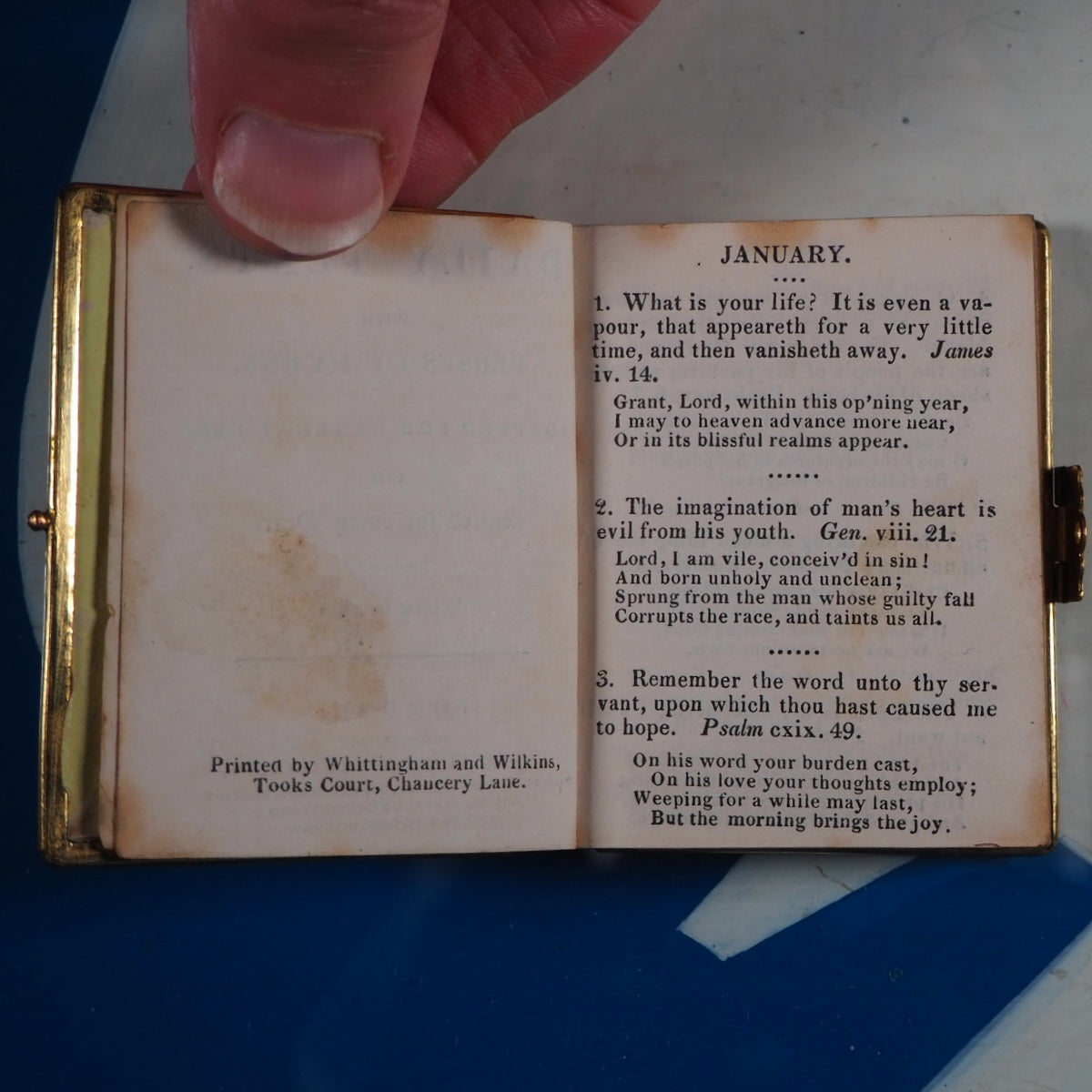 40th edition. [124, unnumbered] printed pages. Contemporary ink gift inscription on front free endpaper. All edges gilt. Printed by Whittingham and Wilkins, London. Original yellow endpapers (slight staining). 54 x 68 mm. Contemporary blind stamped and gilt titled blue cloth. Decorative brass clasp & edges (very slightly rubbed). Provenance: James Maden Holt (1829-1911), for 12 years Conservative Member of Parliament for North East Lancashire -in opposition, under Disraeli-, to Margaret Jane Peel (from the marriage of Ann Jane Steers and William Peel there were several sons and two twin daughters. The elder twin, Margaret Jane Peel, married the Rev. Weston Brocklesby Davis, Vicar of Ramsbury, Wilts, I5th April, 1857, and their daughter, Margaret, married Colonel Chaloner, sometime Member of Parliament for the Abercromby Division of Liverpool, and now Lord Gisborough of Cleveland) on July 29th 1870. This is a very simiar publication to Small Rain Upon the Tender Herb (same printers and publishers) though less coommon (fewer copies printed, almost certainly). Welsh, 2140 (for second edition, only). Not in Bondy. Not in Spielmann. This is one of the top quality available bindings for this publication. Seller Inventory # 5230