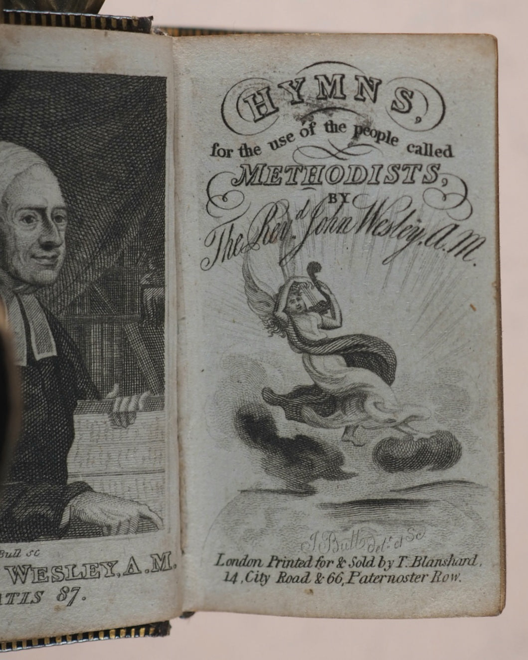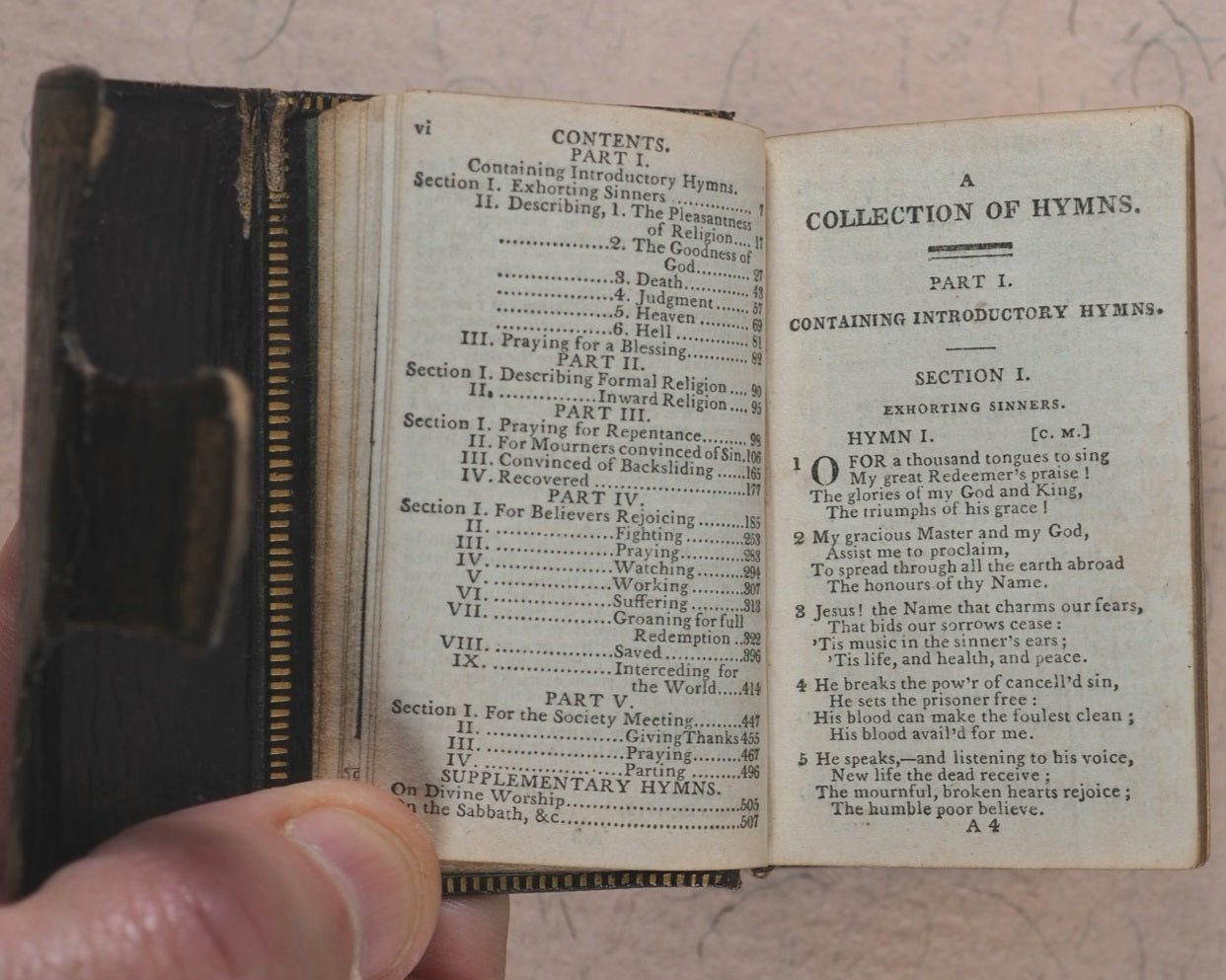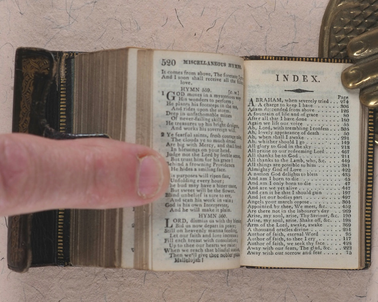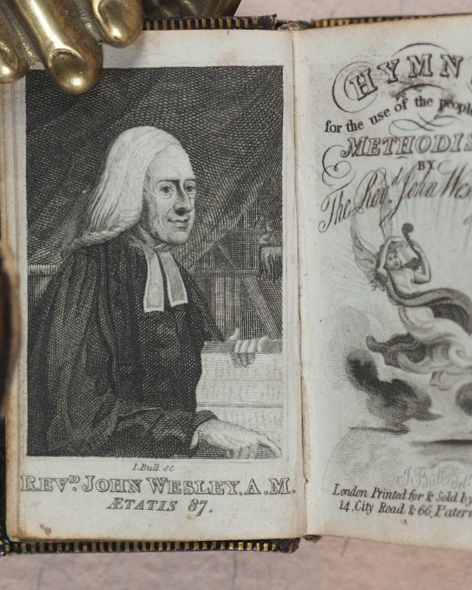 602 printed pages. Engraved frontispiece by I. Bull of John Wesley at the age of 87 - a year before his death. All edges gilt. original grey endpapers. Contemporary ink ownership signature on verso of front free endpaper, dated 1823. Provenance: Louisa Hitchens. 45 x 70mm. Contemporary black morocco in a wallet style binding. Spine with gilt block lettering "WESLEY'S HYMNS", and three hand-tooled binder's decorative flourishes within tripe horizontal rules (slightly rubbed). Front an back covers with hand-tooled scrolling decorative gilt borders. Contains 559 hymns written mostly by John's brother Charles. An interesting variant of an edition of this much reprinted title, first published in 1780 & extolled by B.L. Manning as comparable with the Book of Psalms, the Book of Common Prayer and the Canon of the Mass. Wesley began work on it in September 1773, when he was confined to the New Room, Bristol by a heavy cold, and took it up again at Tullamore during his Irish tour in 1778. His Preface explains that it was published because of the number of earlier books in use; the most important of these, Hymns and Spiritual Songs (1753) being too small (only 84 hymns). Spielmann, 511. Welsh, 4932. WorldCat locates only 4 copies (British Library, Oxford Brookes, National Library of Scotland and Ohio Wesleyan University). OCLC, 314889792.