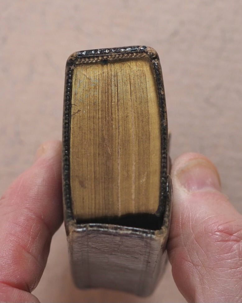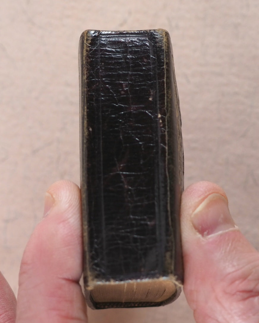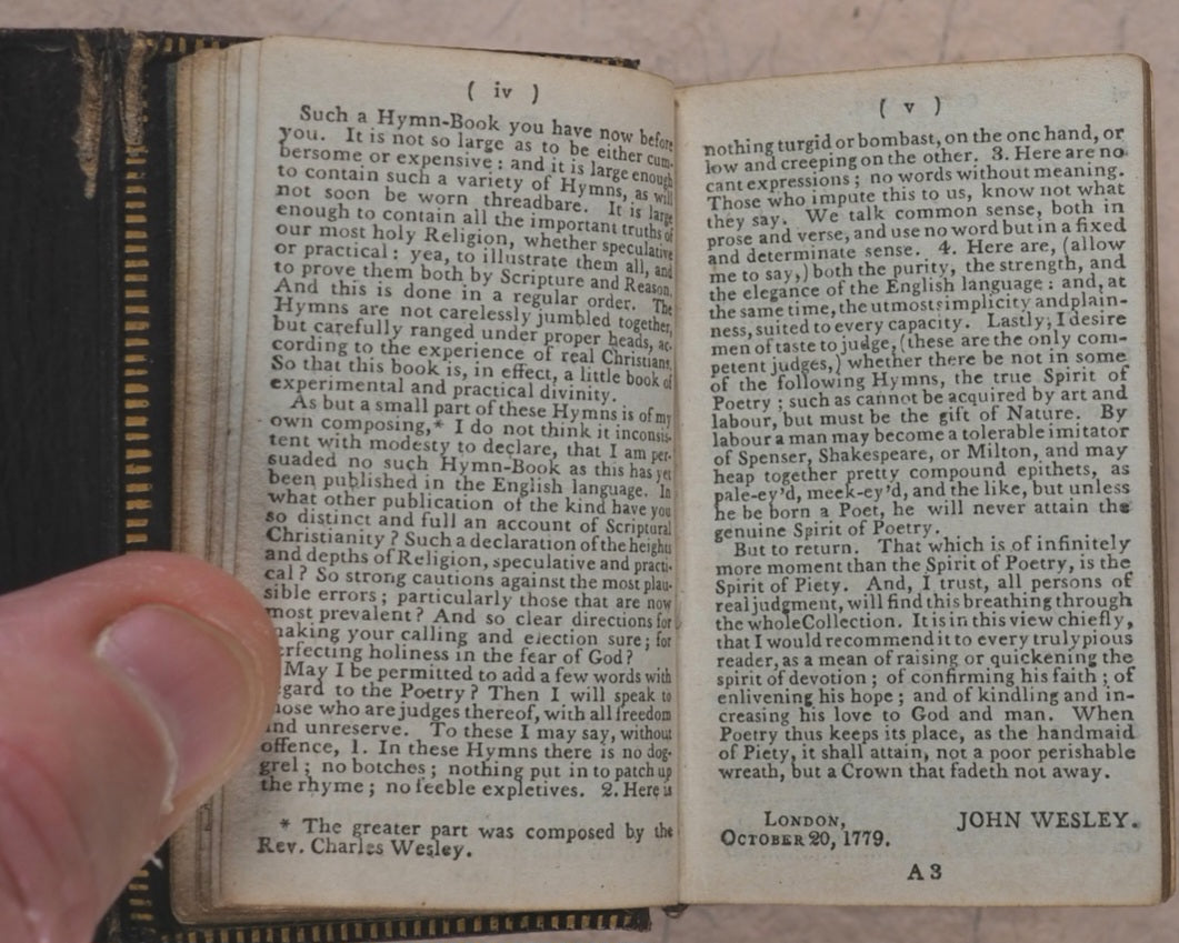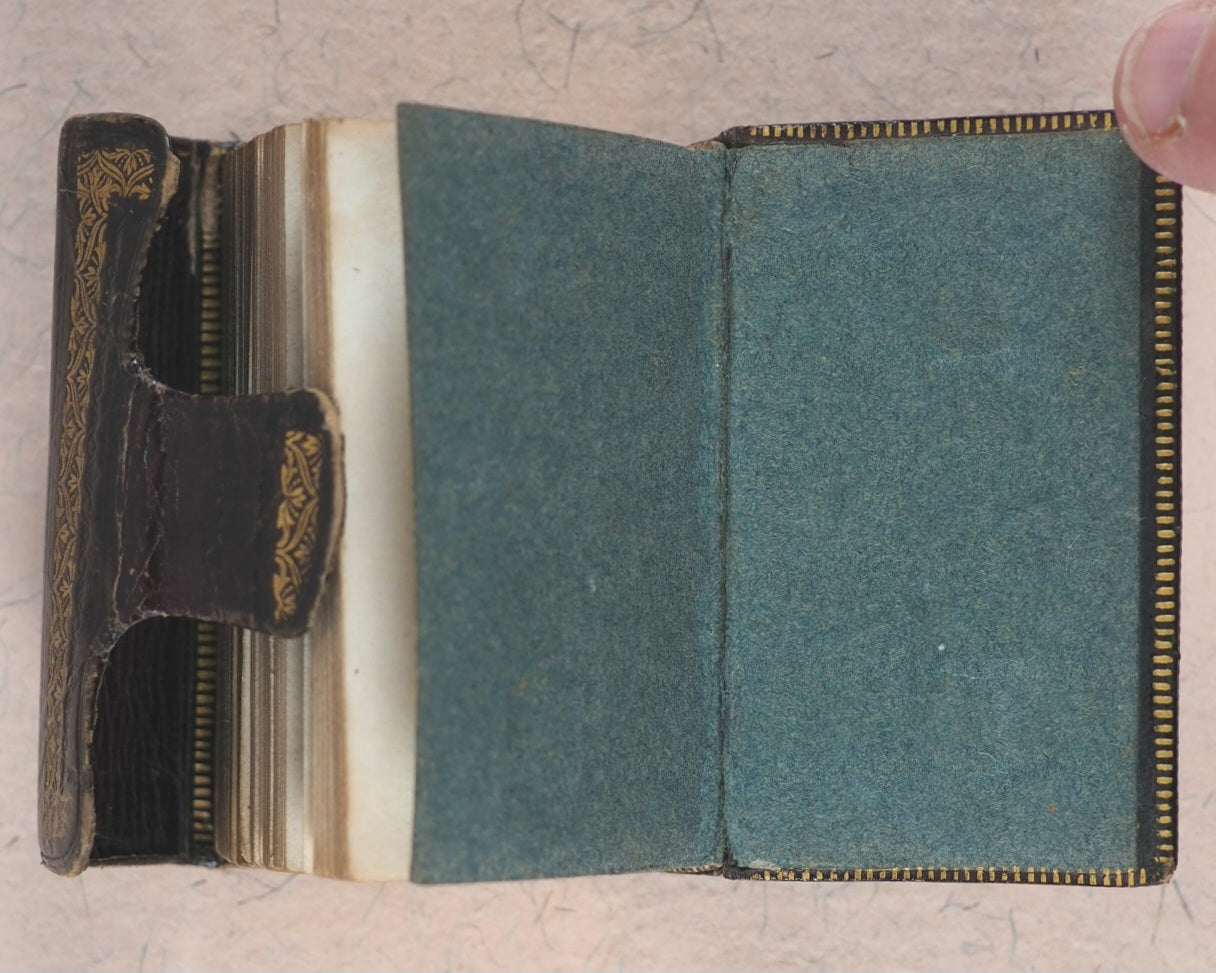 602 printed pages. Engraved frontispiece by I. Bull of John Wesley at the age of 87 - a year before his death. All edges gilt. original grey endpapers. Contemporary ink ownership signature on verso of front free endpaper, dated 1823. Provenance: Louisa Hitchens. 45 x 70mm. Contemporary black morocco in a wallet style binding. Spine with gilt block lettering "WESLEY'S HYMNS", and three hand-tooled binder's decorative flourishes within tripe horizontal rules (slightly rubbed). Front an back covers with hand-tooled scrolling decorative gilt borders. Contains 559 hymns written mostly by John's brother Charles. An interesting variant of an edition of this much reprinted title, first published in 1780 & extolled by B.L. Manning as comparable with the Book of Psalms, the Book of Common Prayer and the Canon of the Mass. Wesley began work on it in September 1773, when he was confined to the New Room, Bristol by a heavy cold, and took it up again at Tullamore during his Irish tour in 1778. His Preface explains that it was published because of the number of earlier books in use; the most important of these, Hymns and Spiritual Songs (1753) being too small (only 84 hymns). Spielmann, 511. Welsh, 4932. WorldCat locates only 4 copies (British Library, Oxford Brookes, National Library of Scotland and Ohio Wesleyan University). OCLC, 314889792.