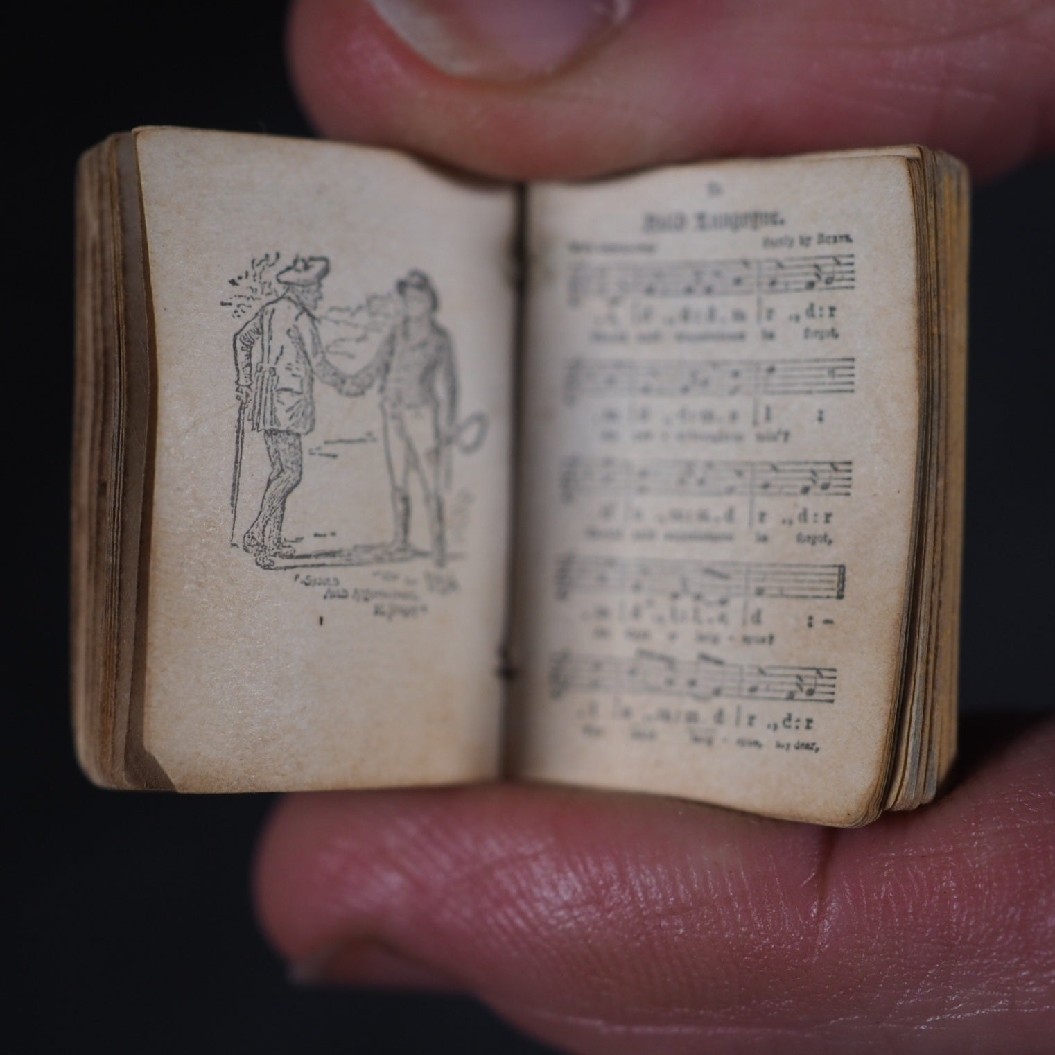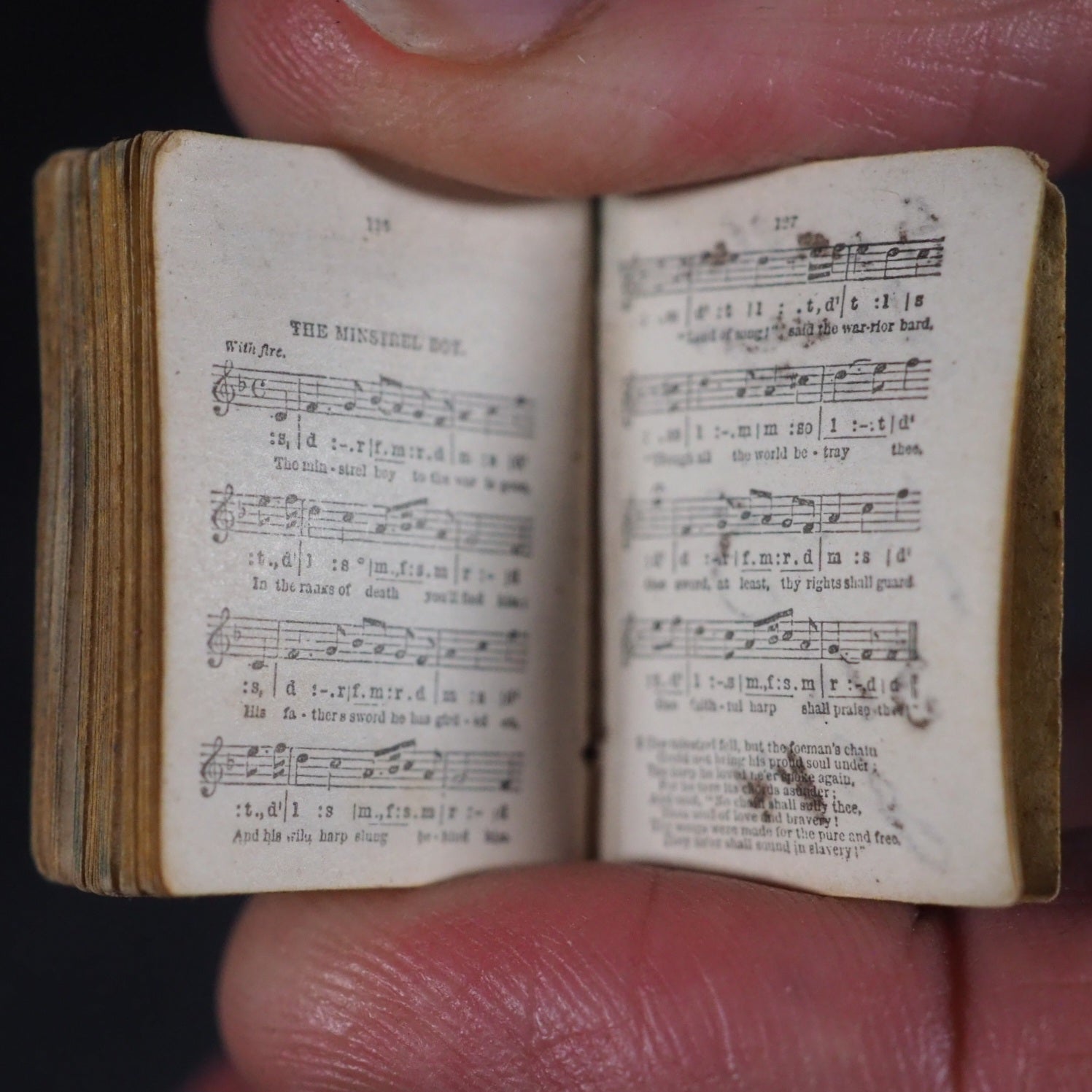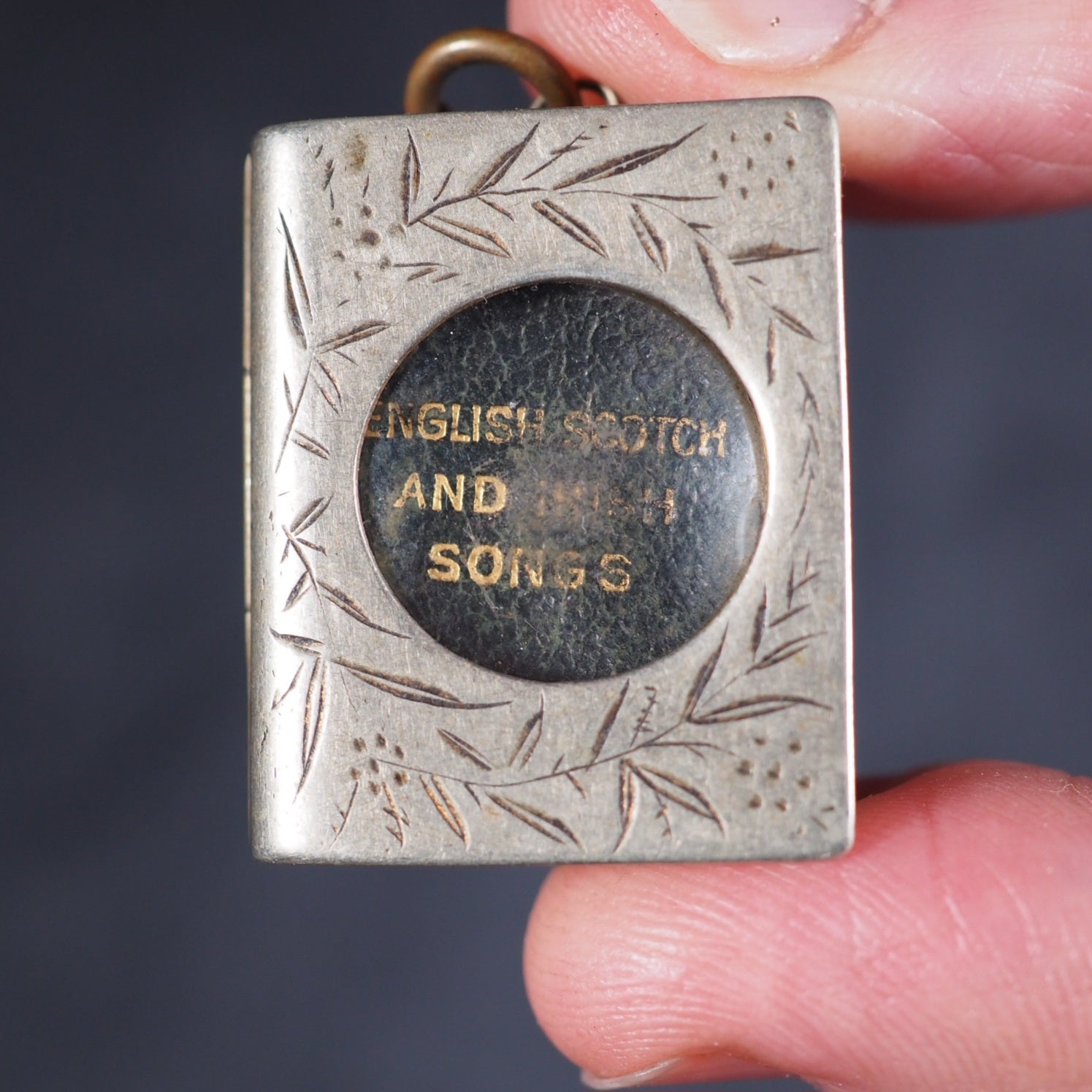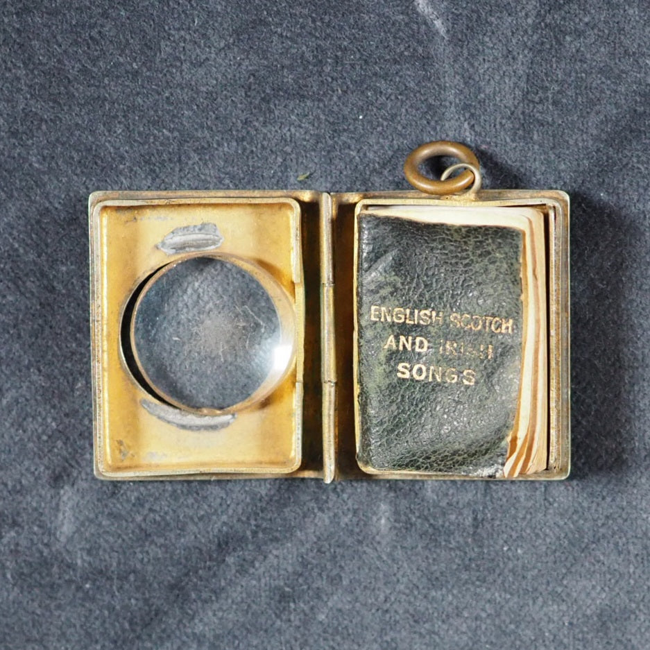 Moodie, William, editor. Old English, Scotch and Irish songs with music : a favourite selection with 24 sketches by A.S.Boyd. Bryce, David & Son. Glasgow. 1895. 127 printed pages including frontispiece and title. Yellow edges and endpapers (some browning; endpapers slightly stained; some corners slightly creased). Owner's inscription on rear endpaper dated 1895. 16 x 28mm. Uncommon original green morocco binding (spine rubbed, hinges partly split but holding firm; corners bumped; front cover abraded). Complete with engraved, silver gilt, book-shaped locket with loop on top and (loose) magnifier in front. Bondy, 113. Garbett, 27. Pistner, B233:3. Spielmann, 377. Welsh, 5113. OCLC, 270900229. WorldCat locates 5 copies worldwide. 111 firsts2024