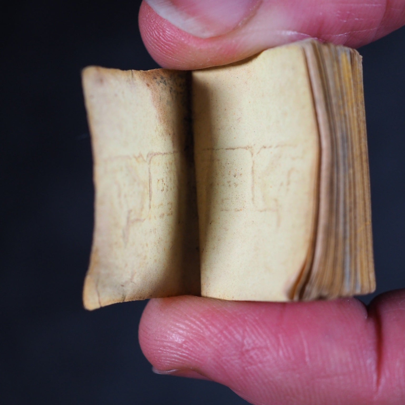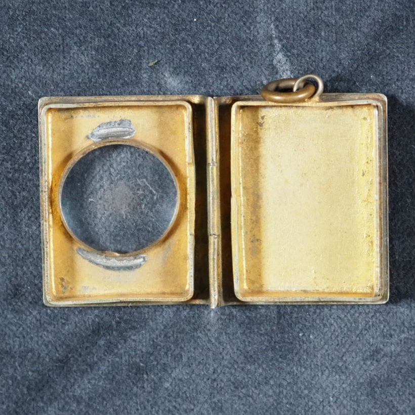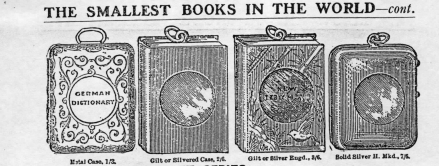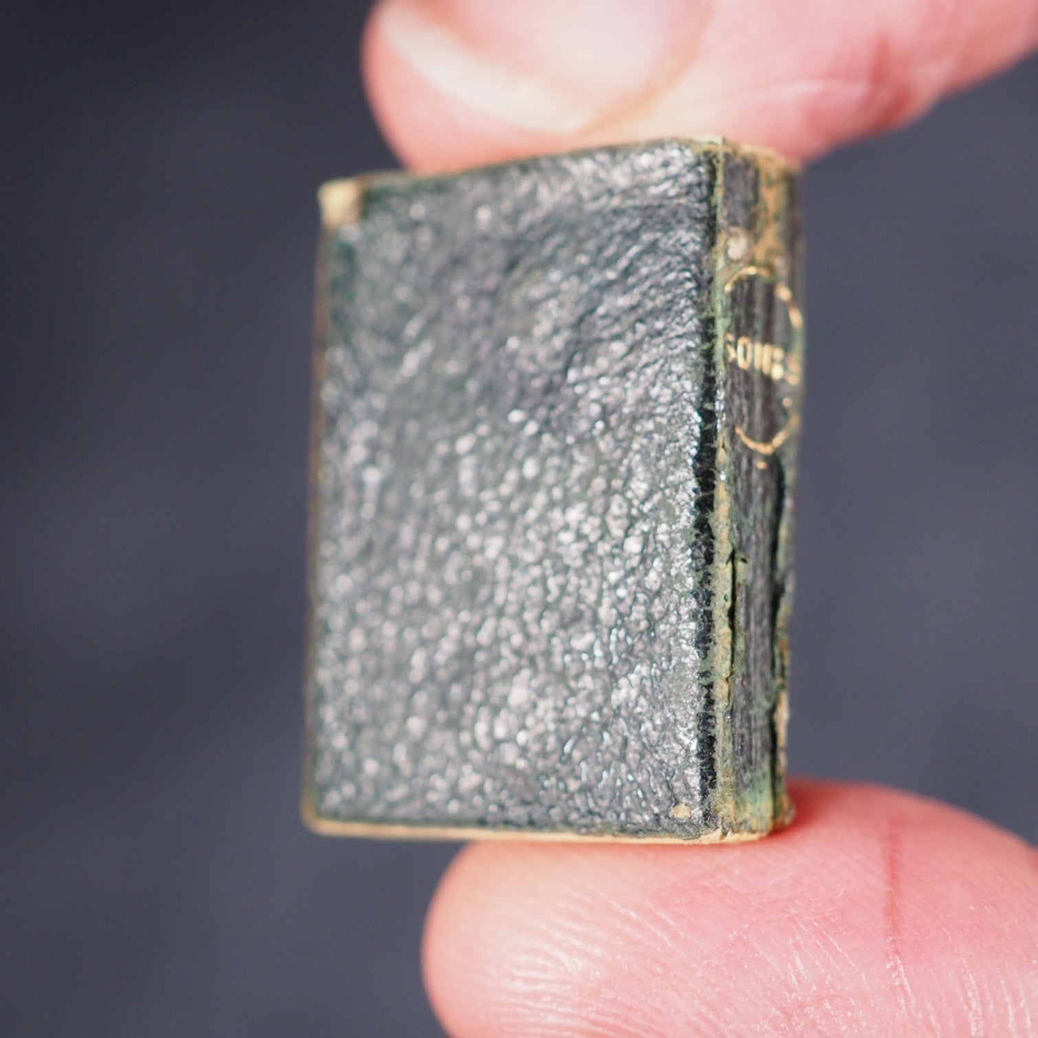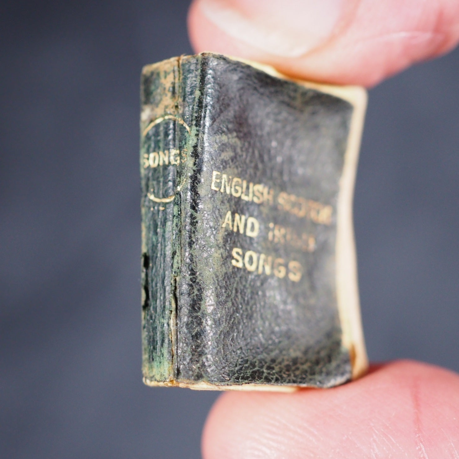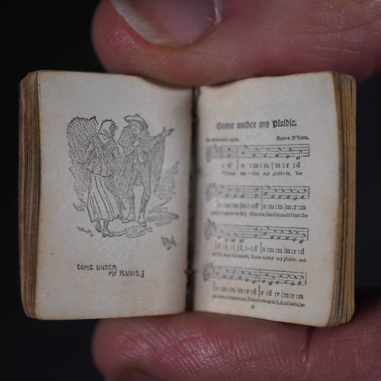 Moodie, William, editor. Old English, Scotch and Irish songs with music : a favourite selection with 24 sketches by A.S.Boyd. Bryce, David & Son. Glasgow. 1895. 127 printed pages including frontispiece and title. Yellow edges and endpapers (some browning; endpapers slightly stained; some corners slightly creased). Owner's inscription on rear endpaper dated 1895. 16 x 28mm. Uncommon original green morocco binding (spine rubbed, hinges partly split but holding firm; corners bumped; front cover abraded). Complete with engraved, silver gilt, book-shaped locket with loop on top and (loose) magnifier in front. Bondy, 113. Garbett, 27. Pistner, B233:3. Spielmann, 377. Welsh, 5113. OCLC, 270900229. WorldCat locates 5 copies worldwide. 111 firsts2024