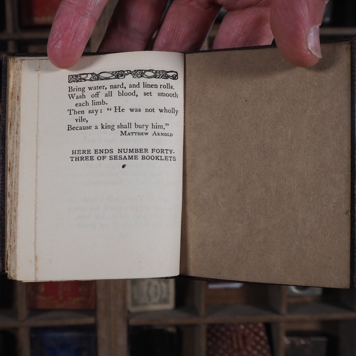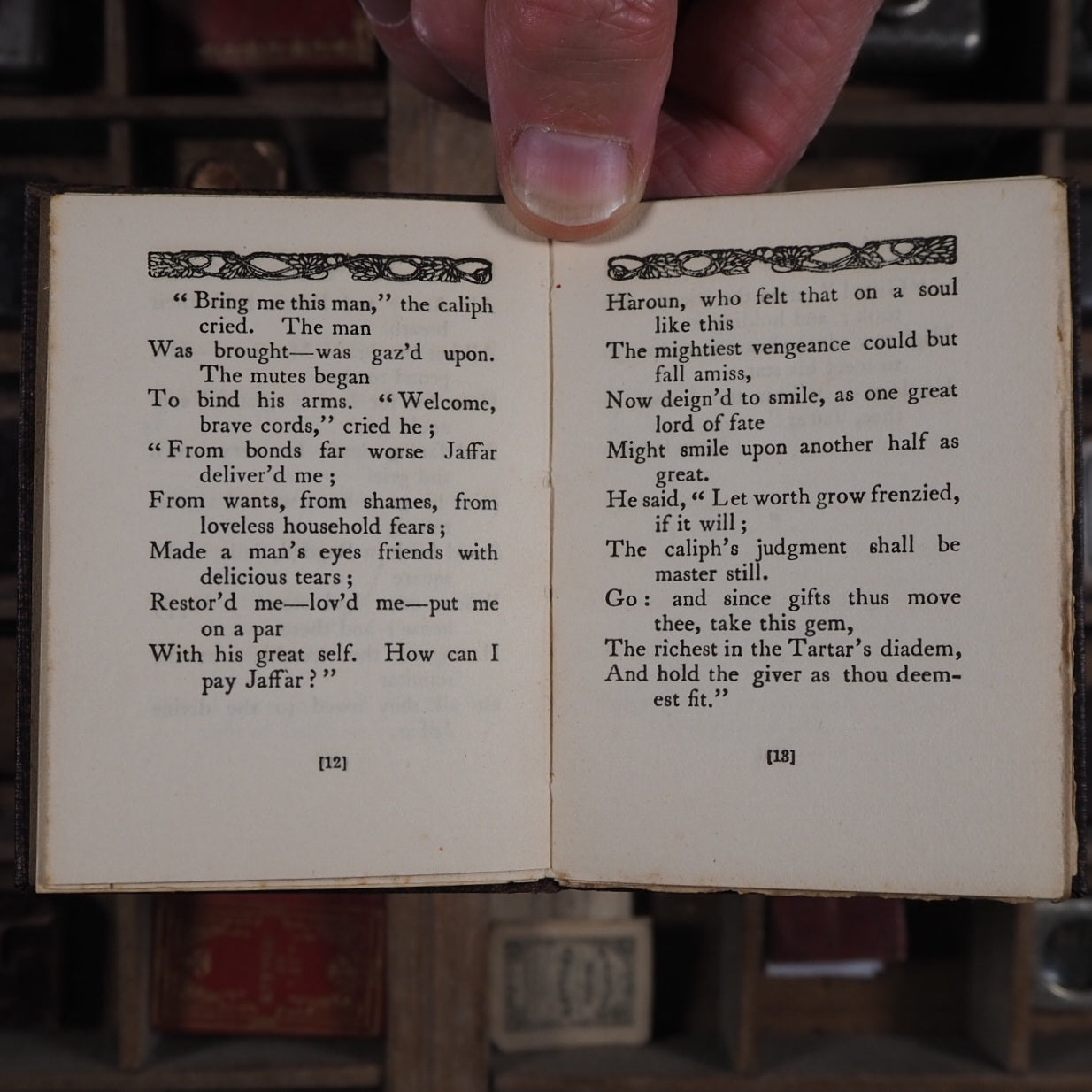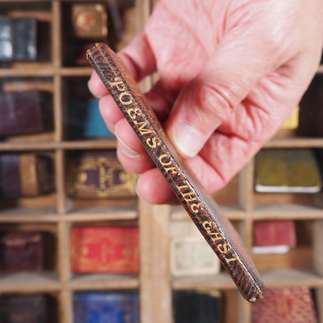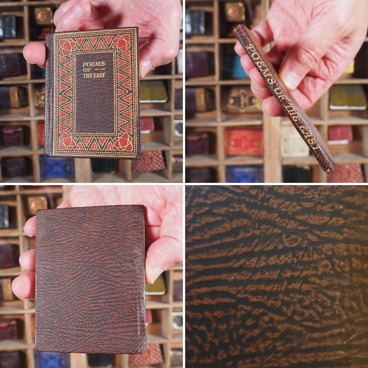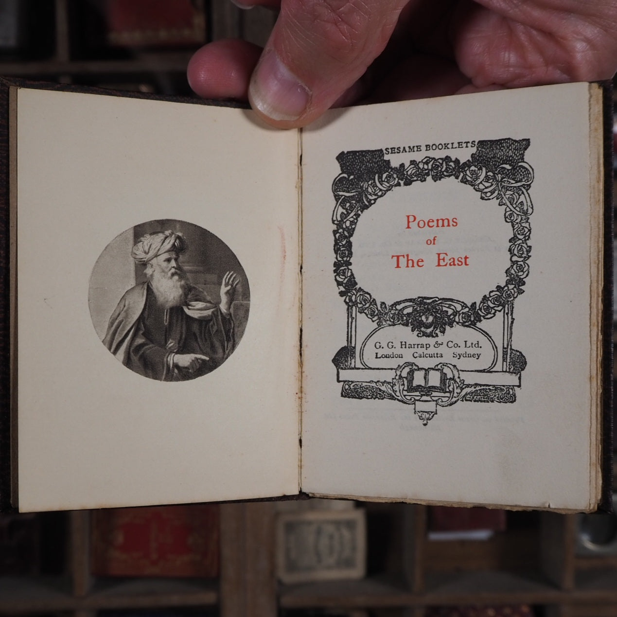 63, [1] printed pages. Title page printed in red and black with printed decorative flower wreath surrounding title; "Sesame Booklets" printed at head of title. Includes portrait of bearded man wearing a headwrap as frontispiece. Includes poems by Leigh Hunt, James Russell Lowell, R.C. Trench, and Matthew Arnold. Sesame Booklets, number 38. Untrimmed leaves. Art nouveau style headpieces at the top of each page. 70 x 97mm. Publisher's brown embossed oilskin cloth with black striations. Front cover with red and gilt art nouveau border and gilt block lettering, "Poems of the East" on the front and down the spine. Hunt was close friends with John Keats and Percy Shelley whose poems were characterized as being less philosophical than other Romantic poets, more light-hearted and uplifting. Lowell was an American Romantic poet, one of the New England fireside poets. Arnold was a major Victorian poet. Not in Welsh. OCLC, 1037948540. WorldCat locates 3 copies worldwide (Texas Tech, Iowa, & Adelaide University Libraries). Seller Inventory # 5407