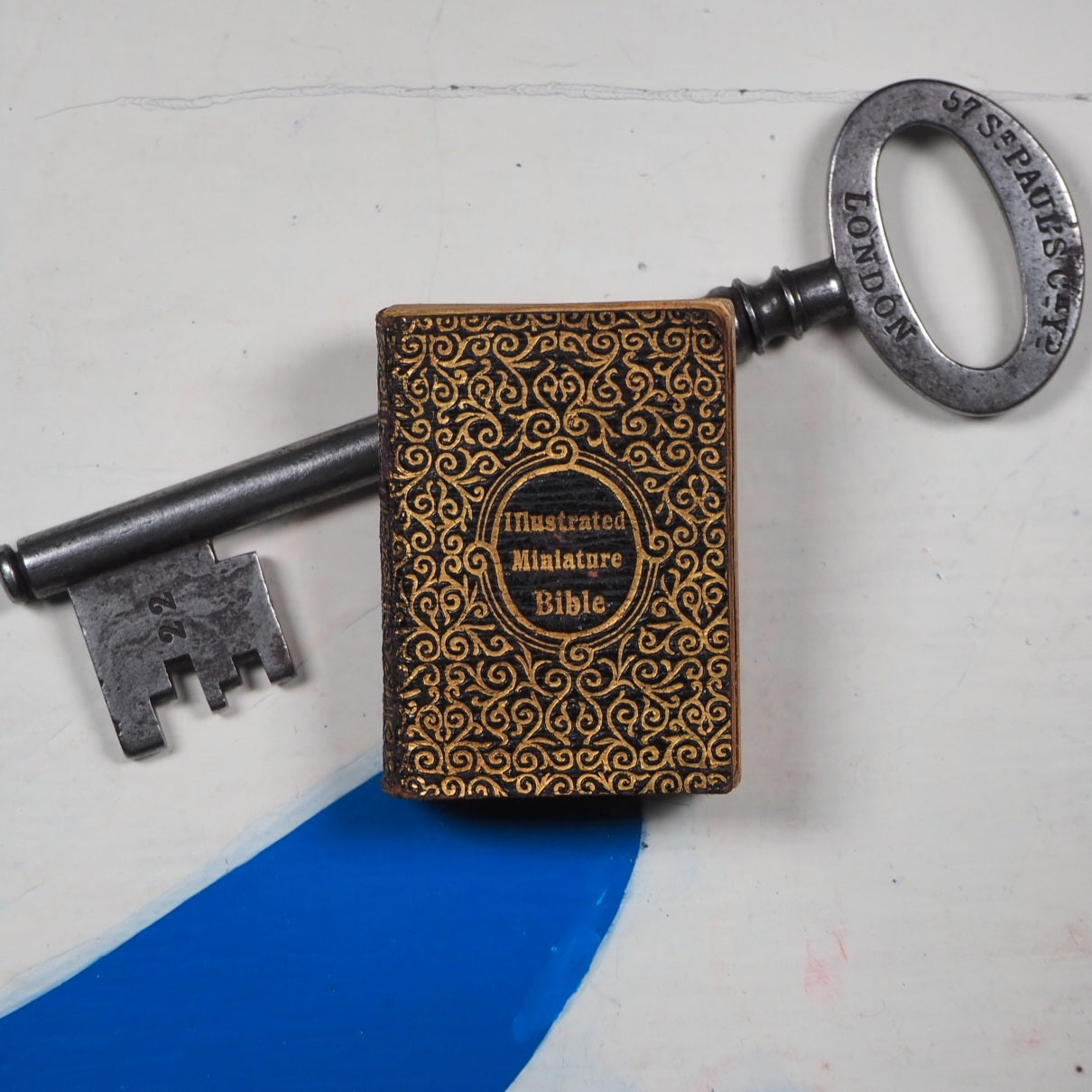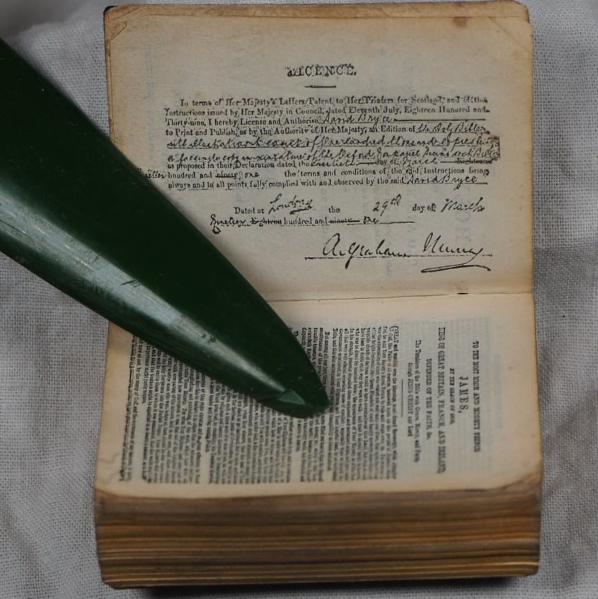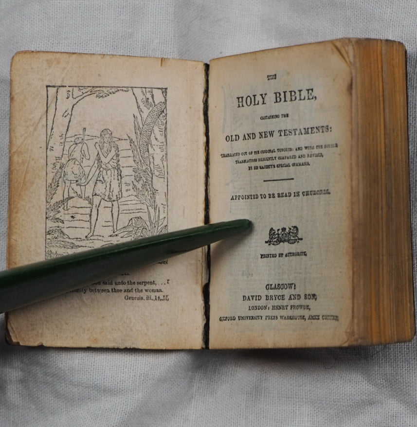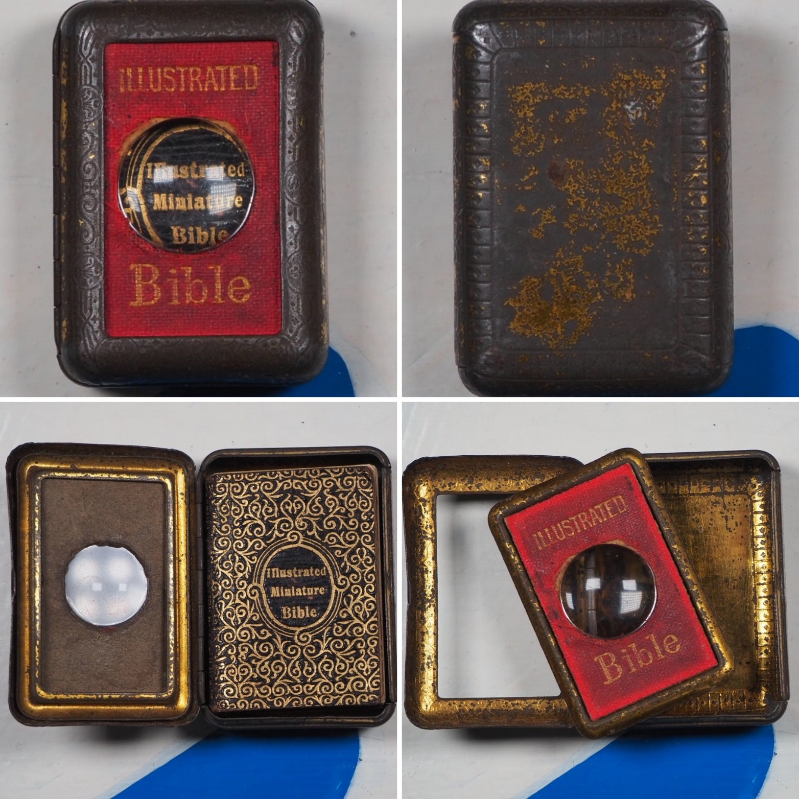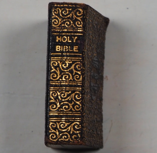 876 printed pages. Printed in two columns. With frontispiece & 27 engraved plates from drawings by Charles Bell Birch. The title bears the words "Printed by Authority"; and on verso is a copy of the licence granted to D. Bryce to publish this edition dated 1901, an edition of 100,000 copies. Printed upon the very thinnest Oxford India Paper ever made, and with twenty-eight full-page illustrations of biblical scenes by C. B. Birch, A.R.A. Inner hinge cracked but firm. Final leaf with marginal closed tear at bottom. Some pages mildly thumbed. The exact size of the page is 42mm x 28mm. Contemporary straight-grained, burgundy morocco, covers with ornamental scrolling gilt border surrounding a central gilt lozenge with gilt lettered center (Illustrated Miniature Bible ), spine gilt, all edges yellow (marginal edge wear); contemporary gold-painted metal copyright marked Jahncke's Patent Tin Prince of Wales feathers and Thistles with ornamental engraving of Jahncke's Patent Tin Prince of Wales feathers and Thistles (exterior gold layer rubbed away), upper cover with removable inlaid red cloth with gilt lettering surrounding a central magnifying glass loop (very slight wear, fading and handling). David Bryce (1845-1923) was one of the world's most prolific and successful makers of miniature books, entering the book trade at the age of 17 when he was made a partner in his father s publishing house. He later became the sole proprietor when his father died in 1870. It was shortly after this event that he started producing the miniature books that were to make him famous. David Bryce & Sons of Glasgow was active around the turn of the 19th century; & took an active interest in the latest technological advances in photolithography and electroplates to allow larger volumes to be reduced to the smallest imaginable size. The result is that their miniature publications are prized for the clarity and legibility of their texts. With the aid of Glasgow University Press, the firm issued the earliest complete miniature Bible in 1896, at the time the smallest complete bible ever printed; it comprised 876 pages printed on the finest India paper, measuring just over 1 inch square and was a reduced facsimile of the Oxford sextodecimo edition. David Bryce produced these tiny Bibles and many were presented to serving soldiers throughout the British Empire, easily carried on campaigns, including The Boer War which was being waged at that time with many later carried by soldiers in the First World War. They also published a 1901 reprint and also issued it in a specific binding as a souvenir of the Glasgow International Exhibition at Kelvingrove. All copies were sold with a small magnifying glass. Spielmann 24. Bondy, p. 108. Welsh 562. A scarce little marvel of bookmaking." WorldCat lists seven UK institutional library holders.