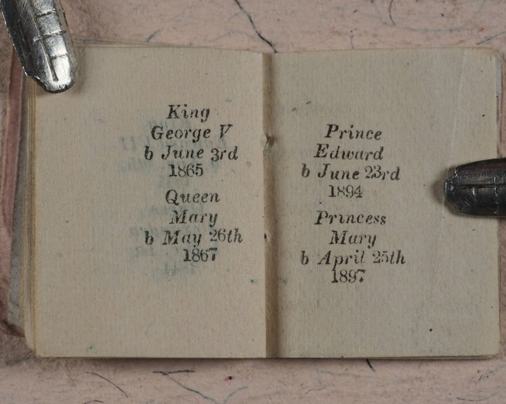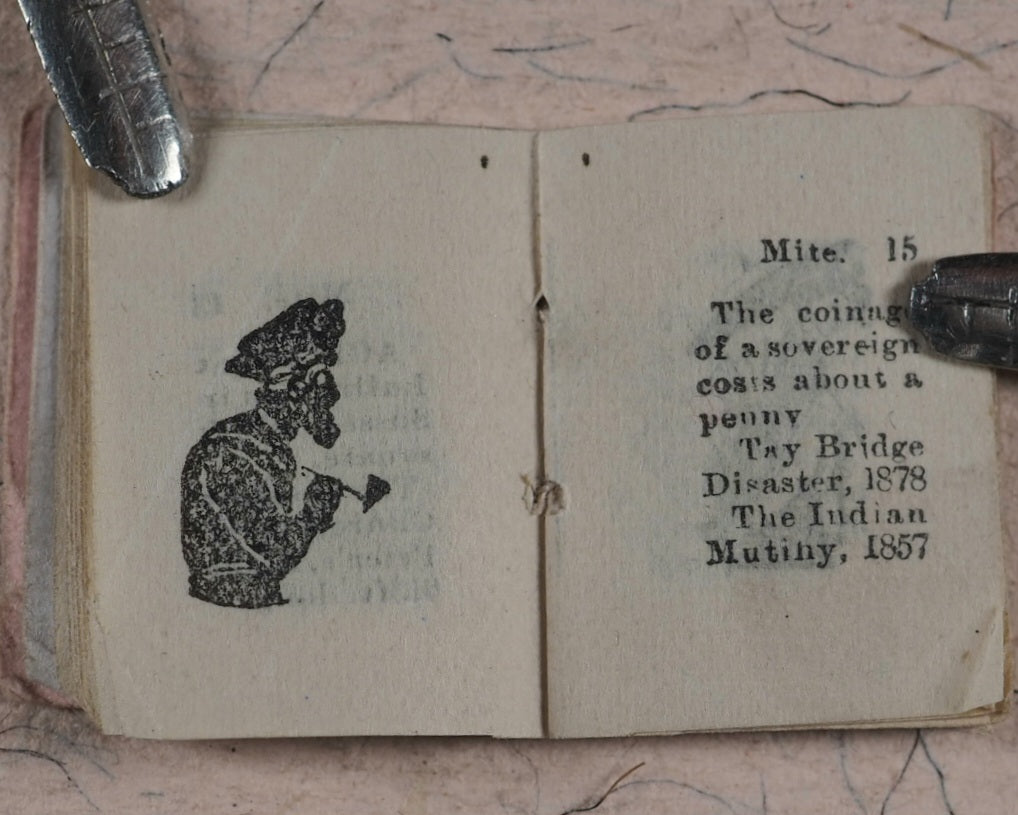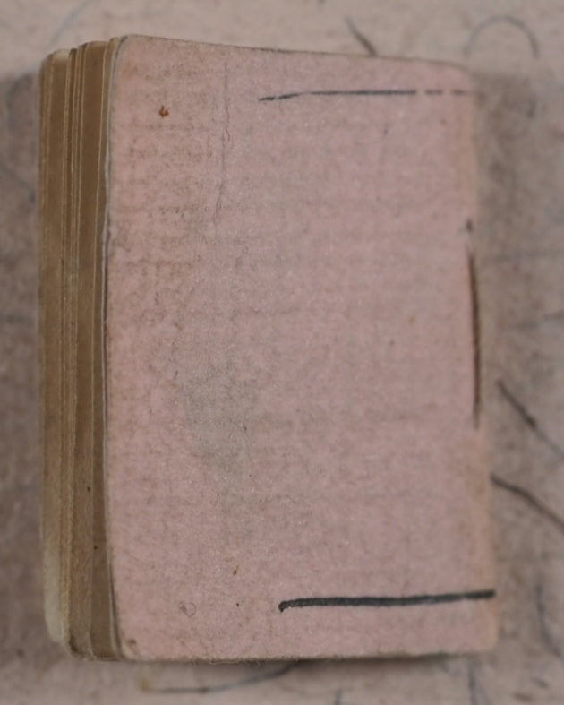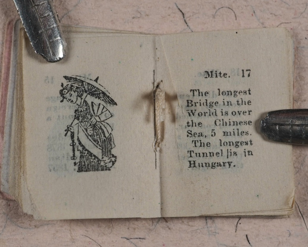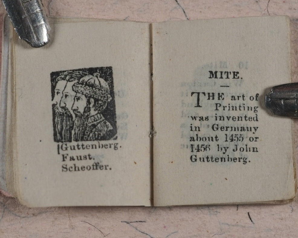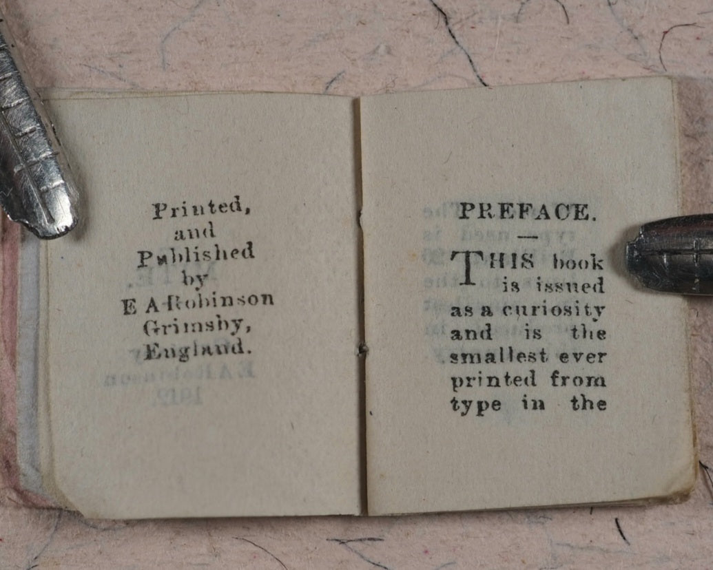 27 printed pages + 4 pages of births and deaths of British monarchs from Queen Victoria. 5 illustrations (including Gutenberg Fust and Schoeffer. It covers the invention of printing, the Eiffel Tower, the annual consumprtion of steel for pins, and various significant dates. 18 x 21 mm. Original red printed paper wrappers. A similar copy is in Queen Mary's Dolls' House Library (E.V. Lucas, 381). Originally published in 1891, "This book is issued as a curiosity and is the smallest ever printed from type in the world. The type used is Brilliant, 20 lines to the in. ..."-Preface. In 1981 Louis Bondy said" for many years the smallest English book printed from moveable type and may in fact still desrve that distinction". Ernest Albert Robinson was a very ordinary fish merchant / printer who lived in small, terraced house that still exists today. The 1911 Census credits him with producing and printing “The Mite”. Bondy, 99. Pistner, 92. Not in Spielmann, see 376 for 1891 edition. Not in Welsh, see 5069 for 1896 edition. WorldCat locates no copies of this 1912 edition worldwide.