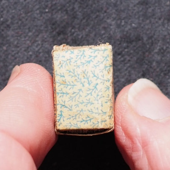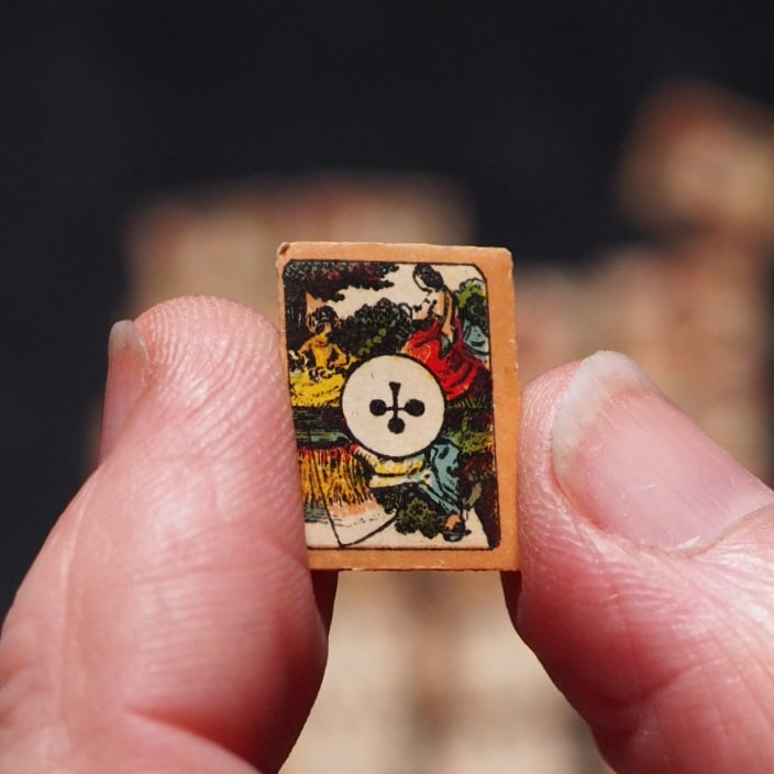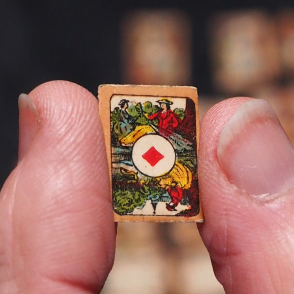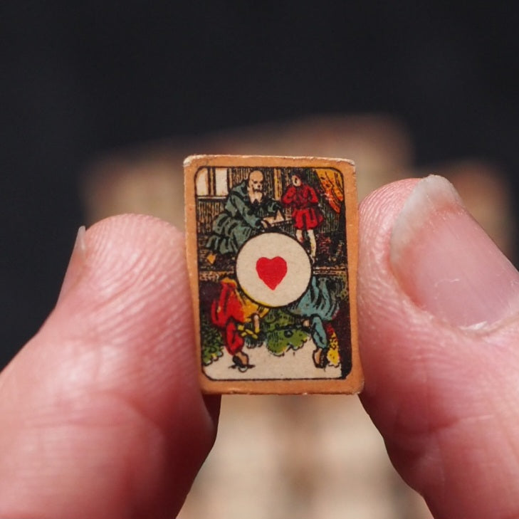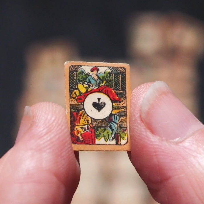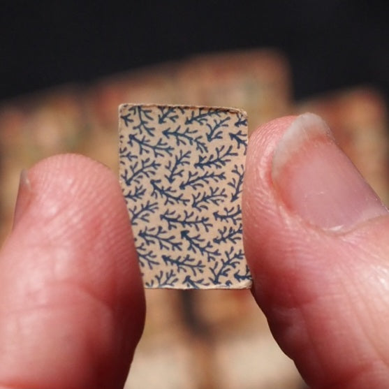 Playing cards. [Wust, C.L. Frankfurt]. Circa 1920. An exquisite and complete set of miniature playing cards. Each card measures approximately 12 x 17 mm. or 1/2" x 3/4". The set is complete, 52 in total. They are in very good condition. The matching box is original and in good condition, holding together well but a little scuffed on the corners. The design on the backs is reminiscent of a William Morris influence. This set have no makers mark but match similar sets made in Germany by card maker C.L. Wust of Frankfurt, maker of playing cards between 1811 and 1927 including four almost identical packs donated to Queen Mary's Dolls' House. Perhaps because the cards were given by a German relative of the Royal Princesses or because the manufacturer was German not British, or because they were not the correct 1/12 scale, the cards were removed from the House and are not in the Library contents in Appendix 1 of the 1924 'Book of the Queen's Dolls' House', nor in Lucinda Lambton's 2010 'Index of Artists, Craftsmen, and Manufacturers'. So almost identical packs of cards were once in the House but were not made specifically for it. 197 firsts2024