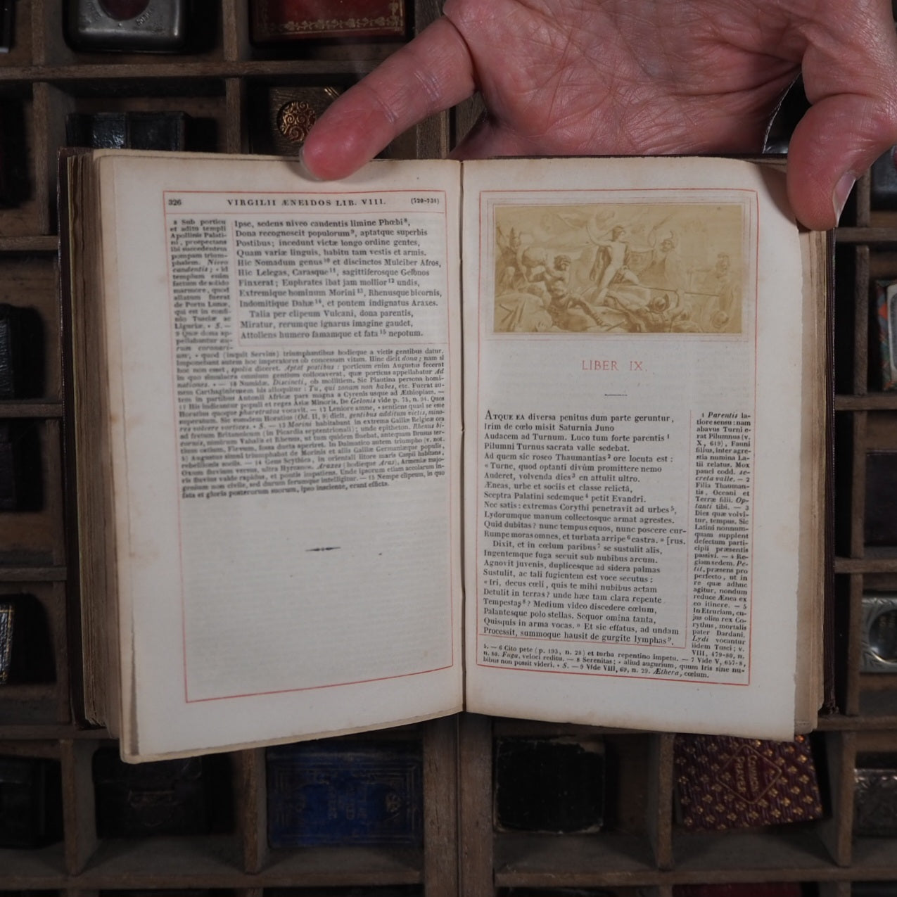 CARMINA OMNIA. Paris: F. Didot, 1858. 12mo. 90 x 145mm. Publisher's cloth.  xiv, 470 pages, 27 photographic plates. First edition.  The typography mimicks that of the 15th century habit of placing voluminous footnotes in an arrangement that was problematic for the printer- with text in a larger type being framed all round in red, with commentary printed in smaller type than the text, also framed in red. This is rare in printing of this era apart from Bibles, some theology and occasional legal texts.[Goldschmidt, The Truthful Lens, 179]. The  very slightly faded albumen photographs are among the first to reproduce paintings and engravings. Ambroise Didot, in a foreword to the companion work of 1855 by Horace, refers to the photograph as "the marvel of our century." Spine with gilt lettering and date, lower front hinge slightly split, partially unopened copy. Original pale yellow endpapers. Occasional slight foxing. Contemporary ink ownership inscription on front free endpaper and later printed sticker. Provenance: Michel Gfeller 13 , Rue de l'Hopital, Bienne.