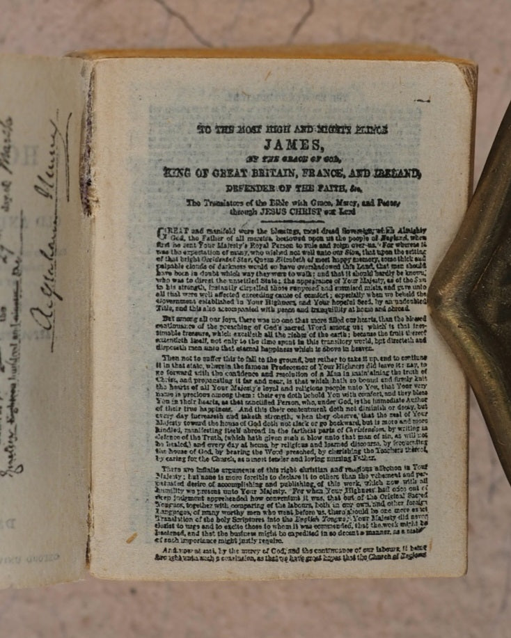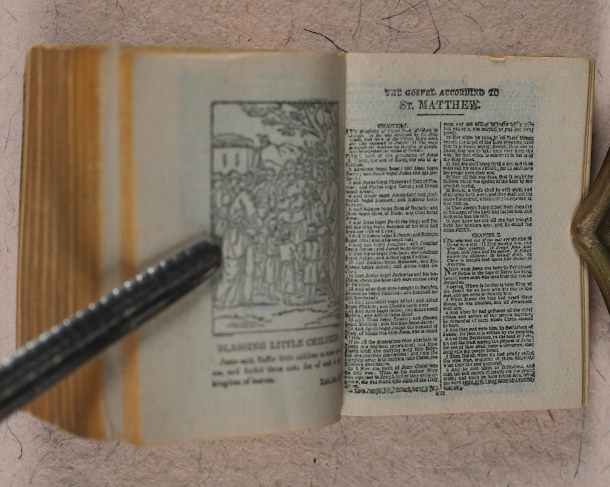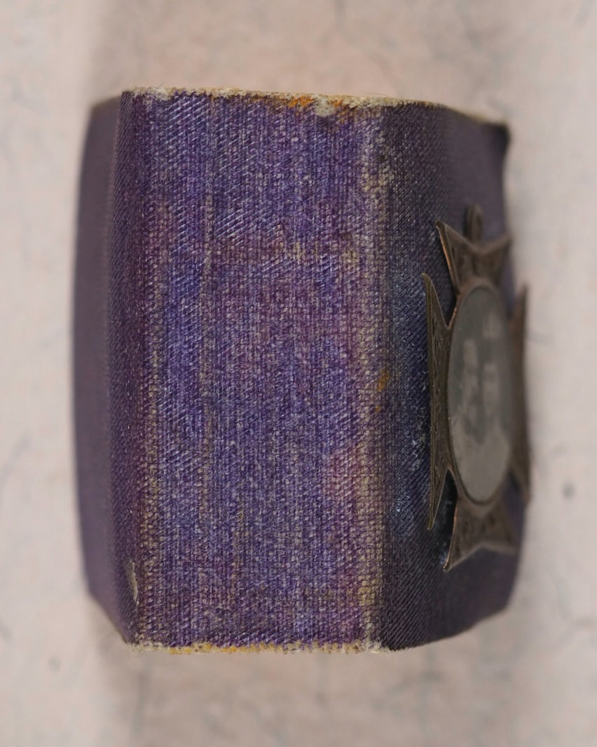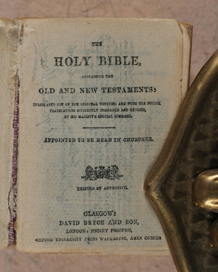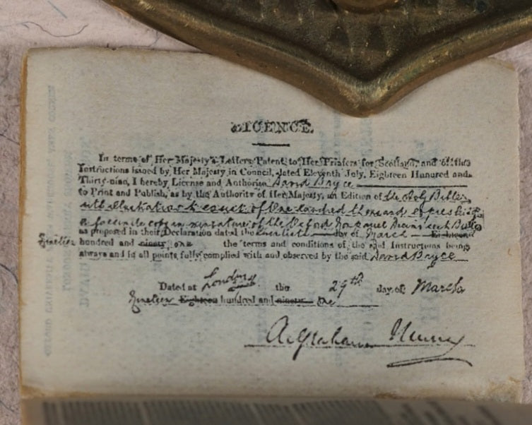 Coronation Bible for Edward vii & Queen Alexandra, 1902. 876 pages on India paper. 28 full-page illustrations reduced from designs by Charles Bell Birch (cf. Bondy, p. 111), 22 in O.T., 6 in N.T. Printed at the Glasgow University Press. All edges pale yellow. Contemporary ink inscription on verso of front free endpaper, dated 1902. 32 x 42 mm. Original purple cloth. Original gold coloured medallion on front cover with the Royal photograph, in the shape of a maltese cross embossed pendant in tin with original circular sepia portrait photo of Edward vii & Queen Alexandra in coronation poses in the centre. The first of two "Coronation Bibles" issued by Bryce. "The 1901 Bible can also be encountered in dark purple cloth with a metal medallion carrying the photographs of King Edward VII and Queen Alexandra glued to the center of the front cover. This latter version was marketed to celebrate the coronation of the royal couple in 1902"- Bondy, 109. Garbett, 22. Spielmann, 25. Welsh, 562 describes the chained lectern version (actually issued 1911). OCLC, 256915063. WorldCat locates seven copies worldwide.