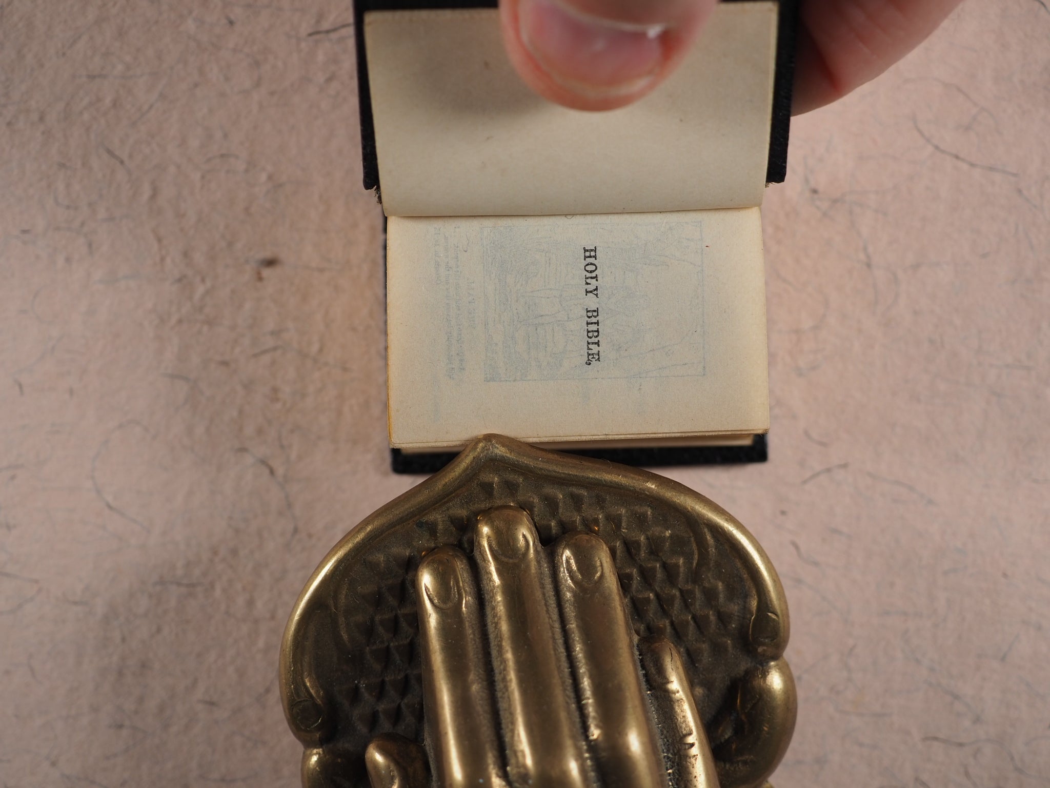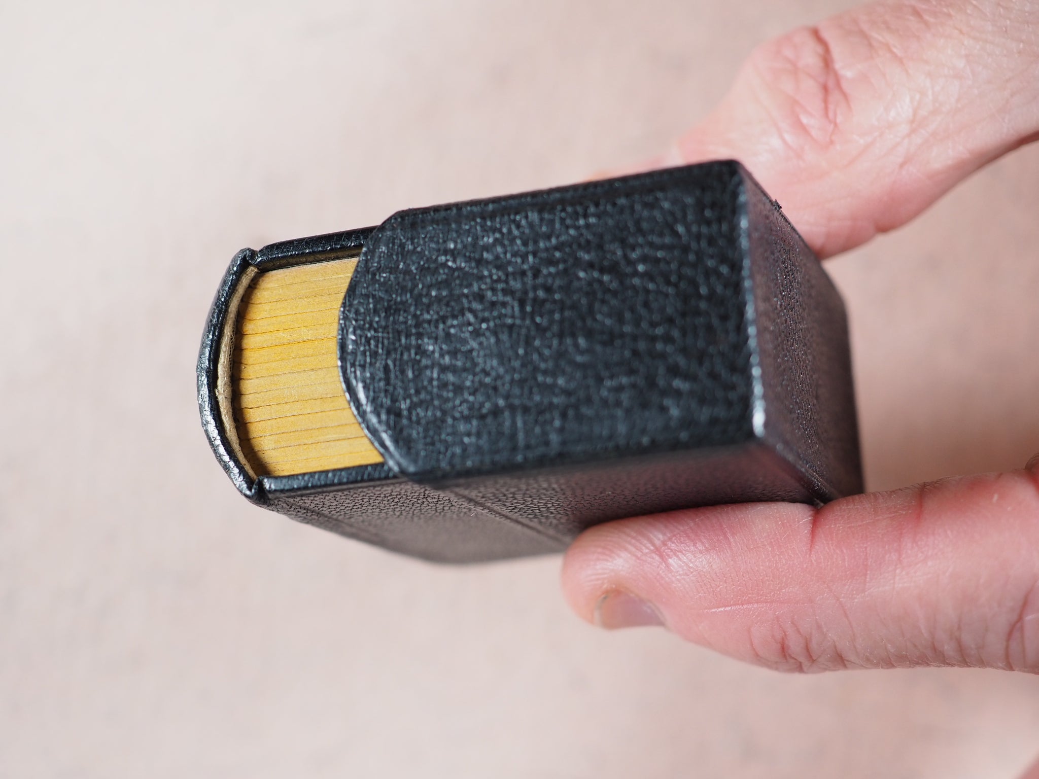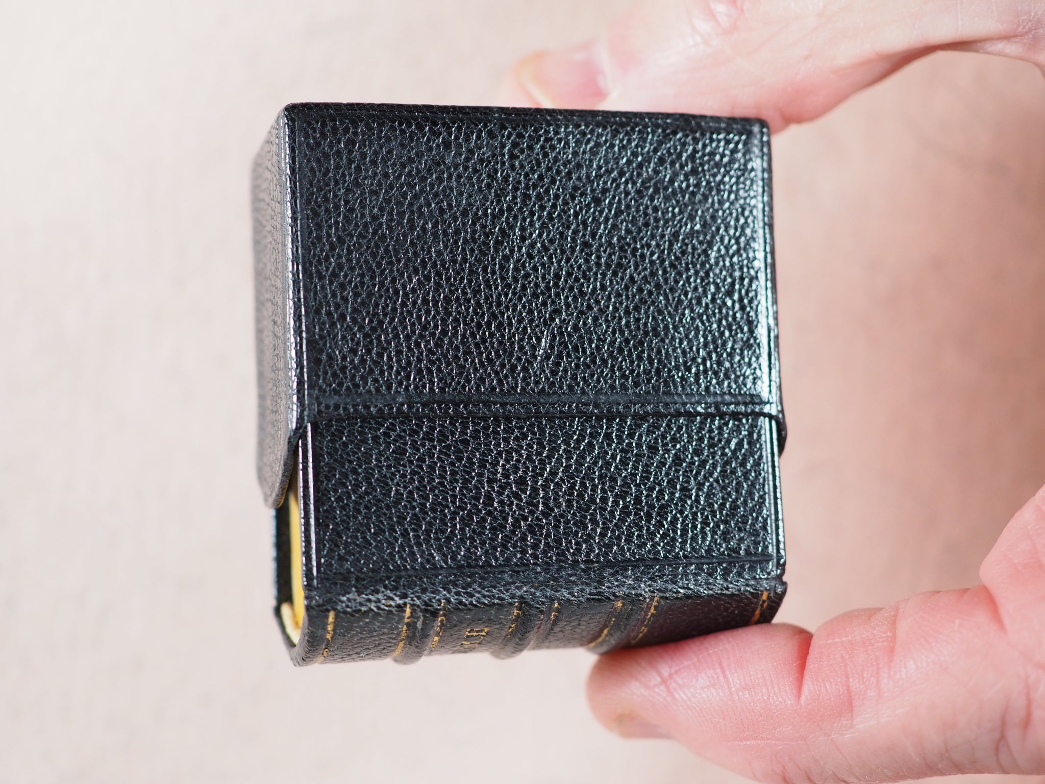 Coronation of Edward vii & Queen Alexandra, 1902. All edges pale yellow. 28 full page line illustrations reduced from designs by Charles Bell Birch (cf. Bondy, p. 111), 22 in O.T., 6 in N.T. 36 x 49 mm. Rebound , possibly by L.G. Challenger or T.F. Ford, in full black crushed niger morocco; spine in compartments with horizontal gilt ruled lines and three raised bands; covers with single blind ruled borders. Presented with attractive matching morocco slipcase. Some rubbing to gilt tooling. The first of two "Coronation Bibles" issued by Bryce. "The 1901 Bible can also be encountered in dark purple cloth with a metal medallion carrying the photographs of King Edward VII and Queen Alexandra glued to the center of the front cover. This latter version was marketed to celebrate the coronation of the royal couple in 1902"- Body. Thomas Francis Ford (1891-1971), Fellow of Royal Institute of British Architects, and Ashpitel Prize winner for outstanding architectural achievement (1919), was a successful Soaneian Classic architect of commercial, cinema, educational, and ecclesiastical buildings. Ford's passion was for bookbinding. L. G. Challenger – book dealer and amateur bookbinder, whose 1960's miniature book bindings are a niche collecting field, and becoming increasingly hard to find; they all have a naïve charm.