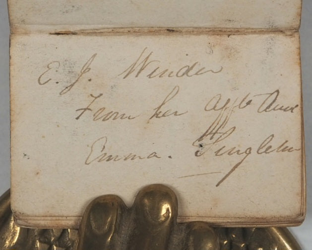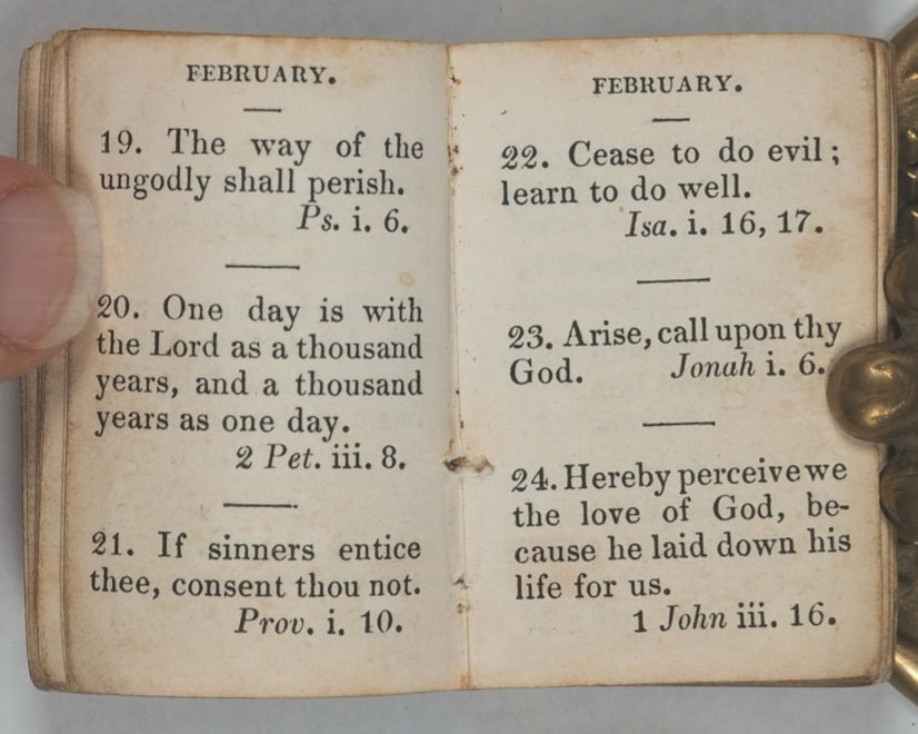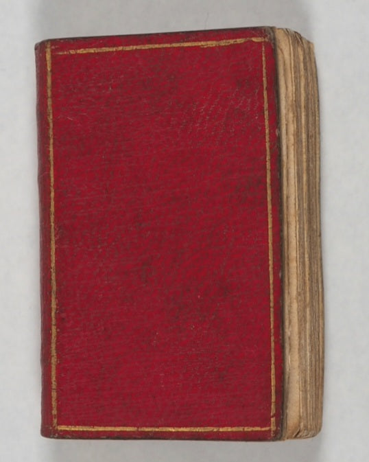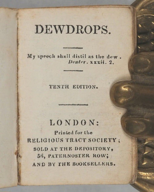[123] pages. 10th edition. Printed by C. Whittingham, the Chiswick Press. Original cream endpapers. All edges gilt. Contemporary ink ownership inscription on front free endpaper. Provenance: Emma Singleton. Slight browning. 32 x 48 mm. Original red roan; four horizontal gilt lines on spine; covers with single gilt fillet borders. Slightly bowed boards. Bondy, 128. Welsh, 2314. WorldCat locates no copies of this edition worldwide. A single, short Bible verse or religious thought for each day, to be "sipped" like dew, providing daily spiritual nourishment. A pivotal time for the Religious Tract Society, that shifted in the 1820s and 1830s from exclusively giving away free tracts to commercially publishing bound, high-quality books and miniature works for children.