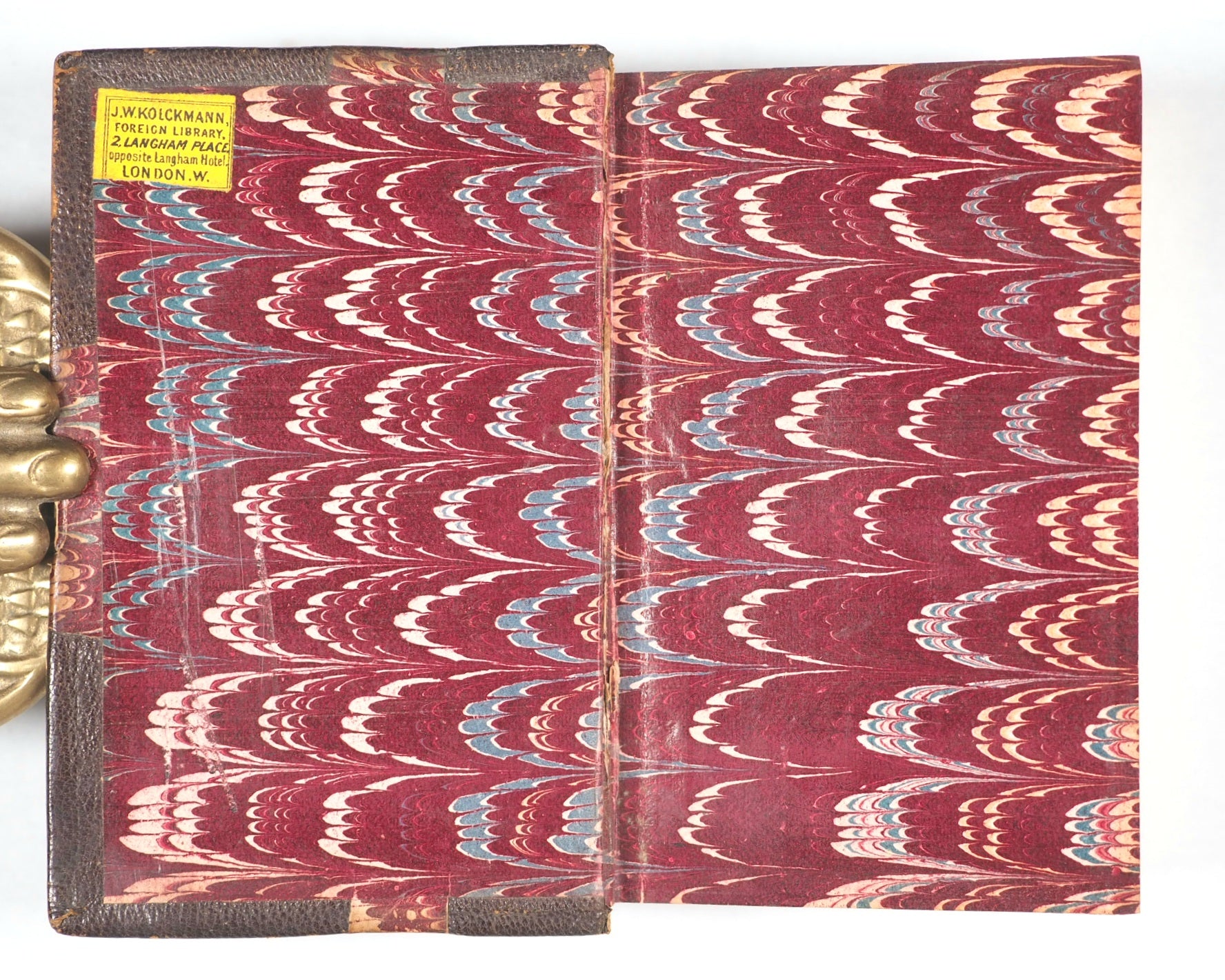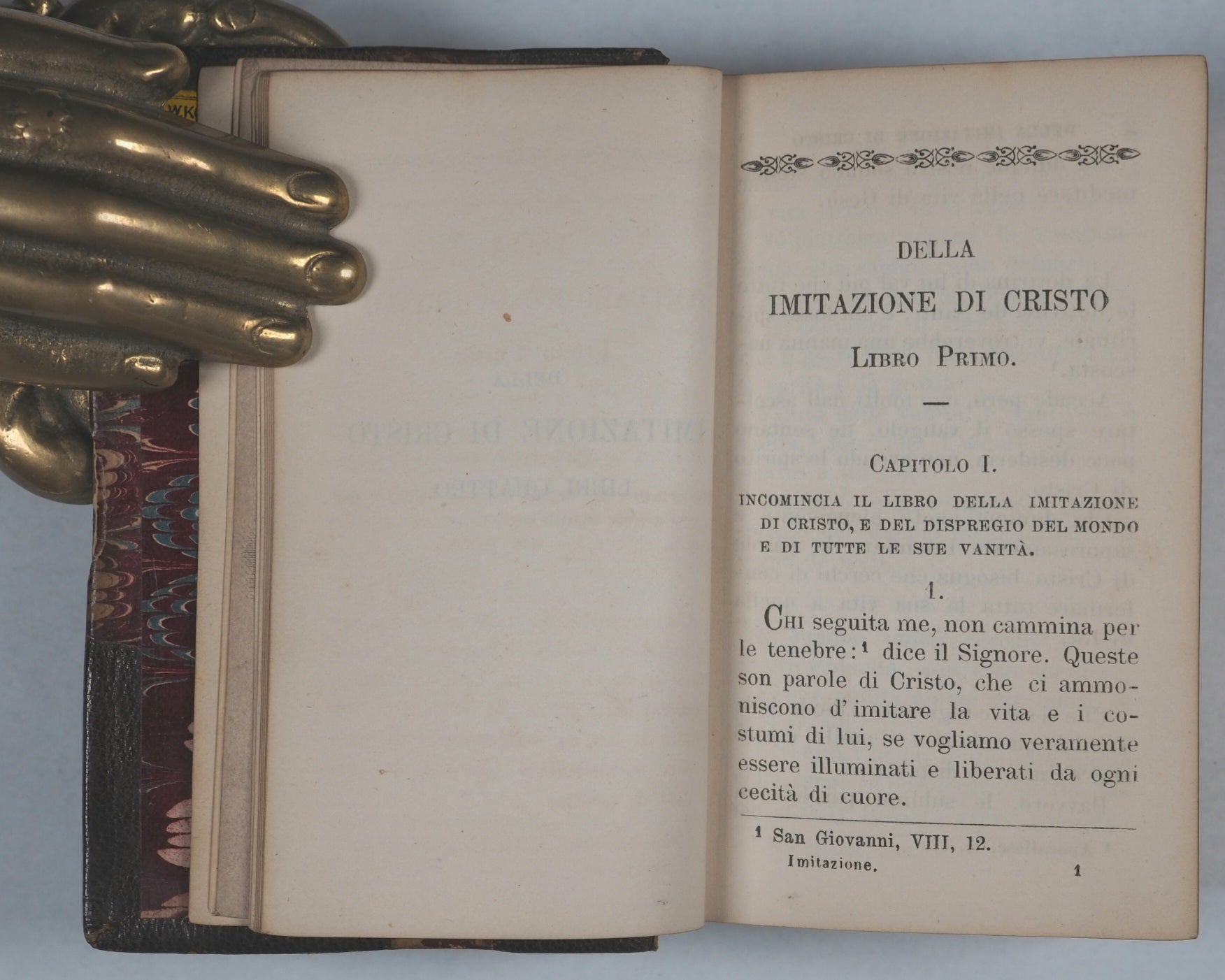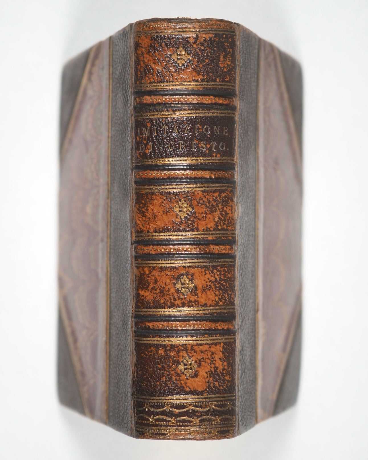 First edition thus. xi, 506 printed pages. Frontispiece. Mild age-toning. All edges gilt. Original marbled emdpapers. Bookseller's label on front free endpaper for J.W.Kolckmann, 'Foreign Library', 2 Langham Place. W. London. 58 x 96 mm. (page size). Contemporary half brown morocco; spine with raised bands, burgundy label with gilt block titling. A little rubbed. Not in Bondy, nor Spielmann, nor Welsh. For second edition see OCLC, 820737762 (one copy located - British Library). WorldCat locates no copies of 1st edition worldwide. Barbèra was a prestigious publisher known for high-quality editions of both classical and contemporary works. Published in 1866, this edition reflects the cultural and religious landscape of post-unification Italy, where classic spiritual texts were being brought into modern, refined language. The Imitation of Christ has continued to influence Christian spirituality for centuries.