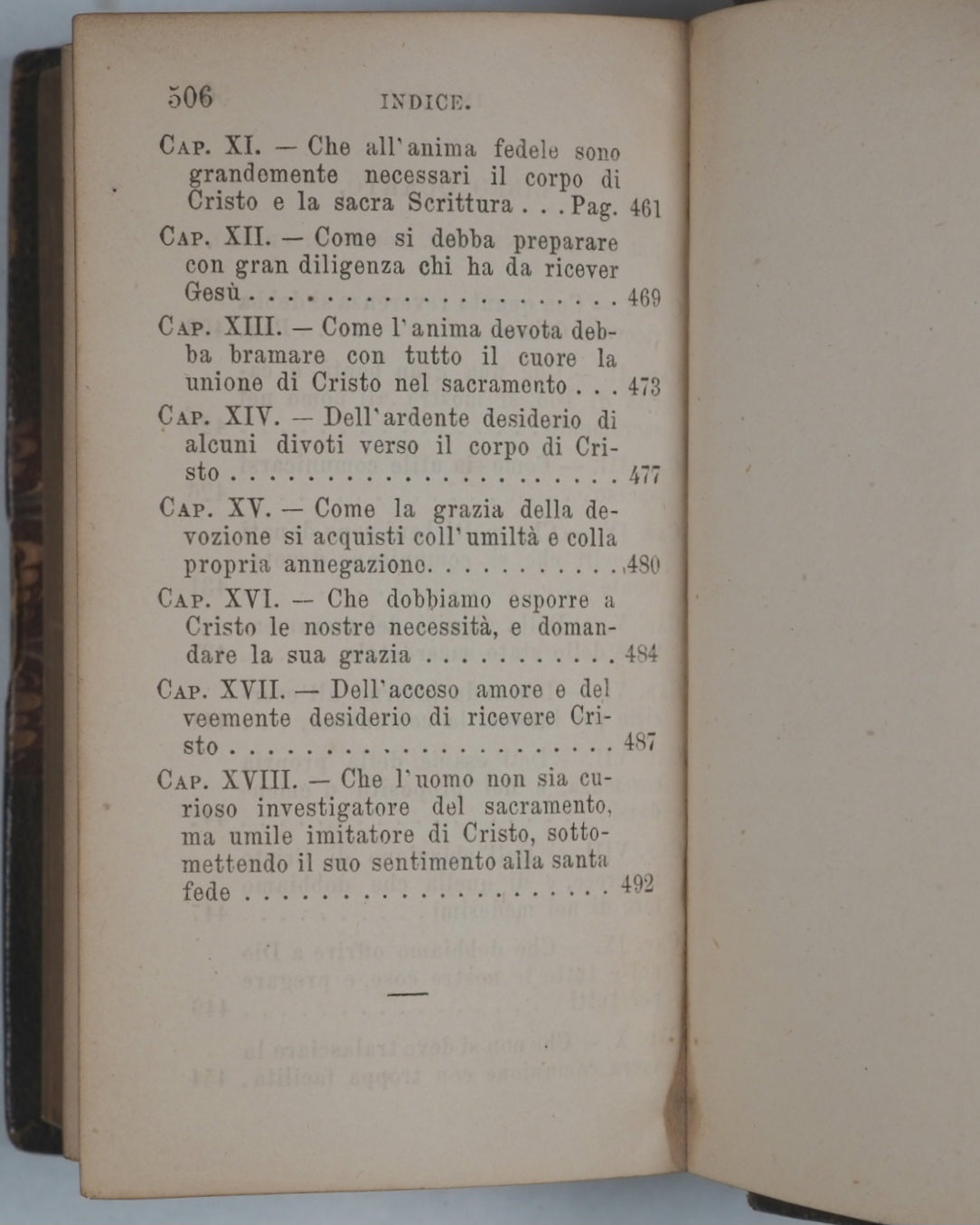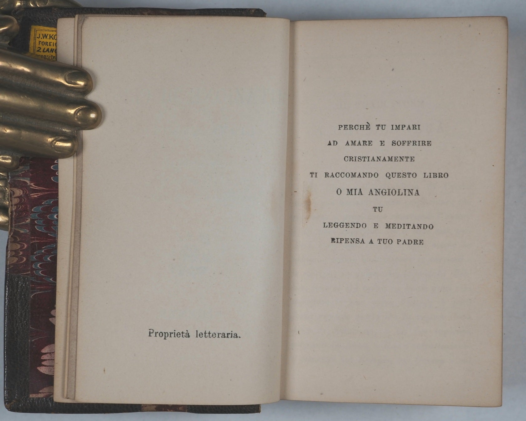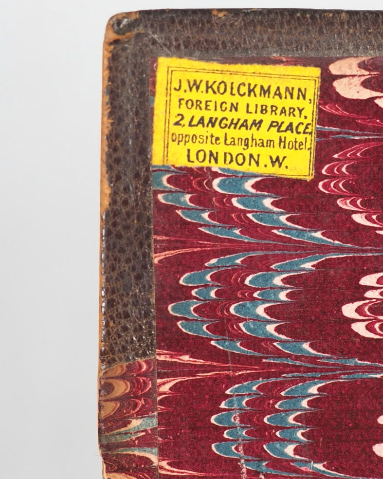 First edition thus. xi, 506 printed pages. Frontispiece. Mild age-toning. All edges gilt. Original marbled emdpapers. Bookseller's label on front free endpaper for J.W.Kolckmann, 'Foreign Library', 2 Langham Place. W. London. 58 x 96 mm. (page size). Contemporary half brown morocco; spine with raised bands, burgundy label with gilt block titling. A little rubbed. Not in Bondy, nor Spielmann, nor Welsh. For second edition see OCLC, 820737762 (one copy located - British Library). WorldCat locates no copies of 1st edition worldwide. Barbèra was a prestigious publisher known for high-quality editions of both classical and contemporary works. Published in 1866, this edition reflects the cultural and religious landscape of post-unification Italy, where classic spiritual texts were being brought into modern, refined language. The Imitation of Christ has continued to influence Christian spirituality for centuries.