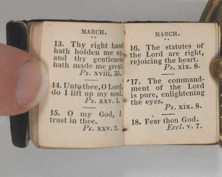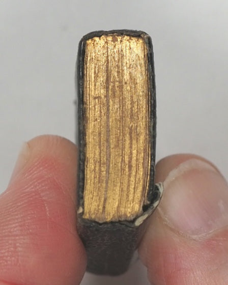 128 pages. Printed by Charles Whittingham at the Chiswick Press. 21st Edition. Lacks front free endpaper. All edges gilt. Original yellow endpapers. Ink ownership inscription on front free endpaper, dated 1853. Contemporary pencil inscription on rear blank leaf, dated 1909. 27 x 34 mm. Original black calf wallet-style binding. A bit abraded in places. Bondy, 127. Spielmann, 466. Welsh, 6434. No OCLC number. WorldCat locates no copies of this edition worldwide. According to Bondy, this title "belongs to the best-loved miniature books, and was obviously much treasured by our Victorian ancestors." At least 34 editions were published in England, making it the most numerous miniature book of the first half of the 19th Century. The earlier editions are less commonly found today.