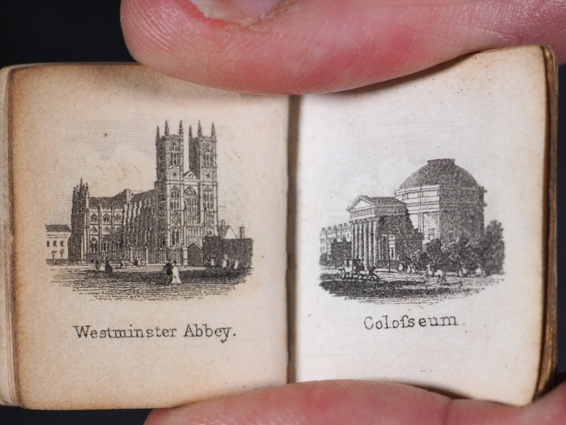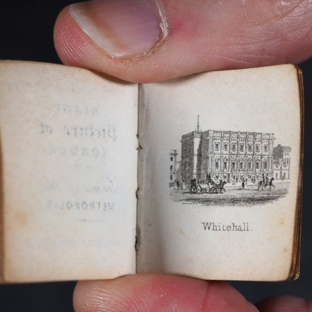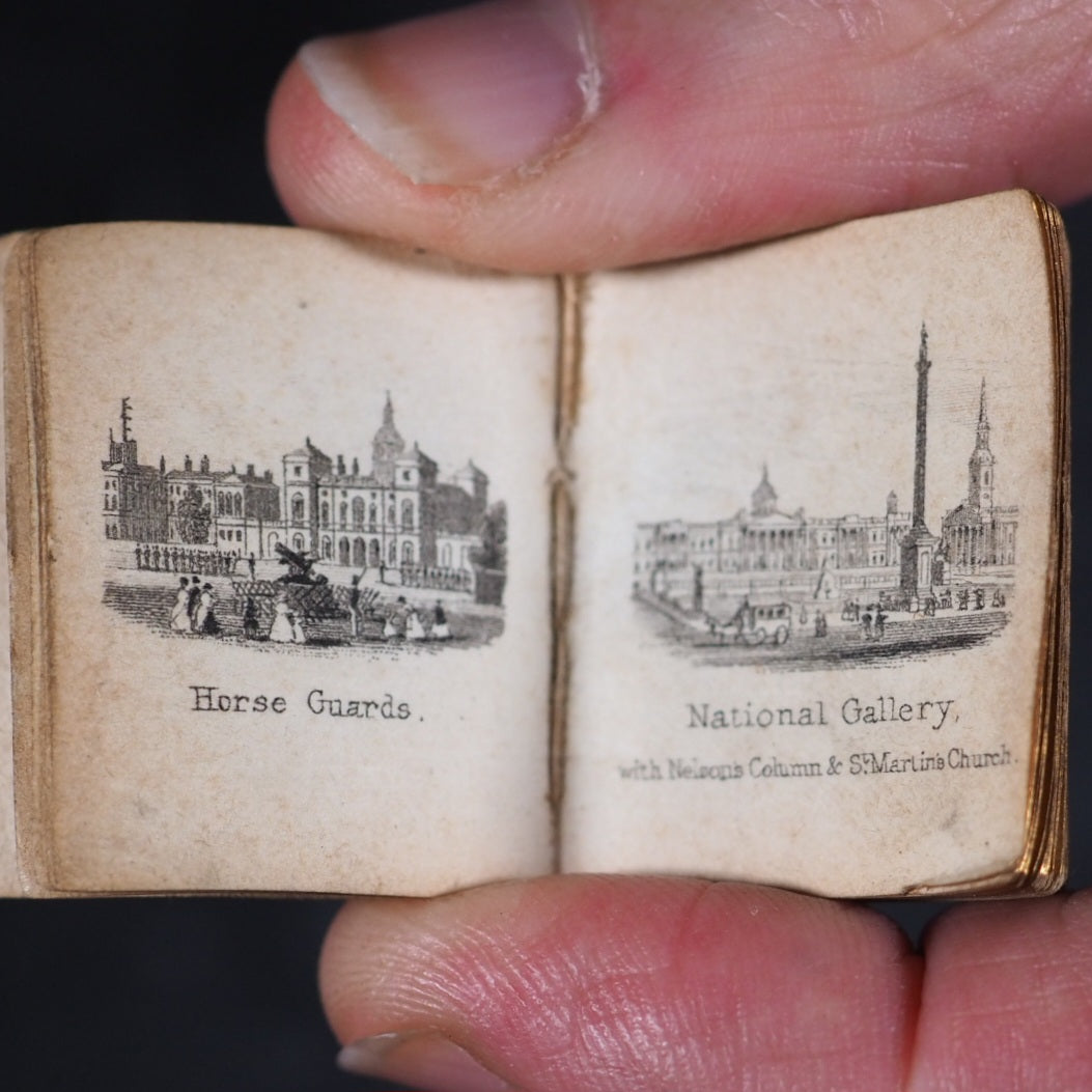 Bijou Picture of London, or the Gems of the Metropolis. Rock, Brothers & Payne. London. No date (but 1850).  Engraved frontispiece, title and 30 plates. Bondy p.152: "... tiny but excellent views of London ..."; Spielmann 58: "[the views] are of exceptional quality considering their tiny size"; All edges gilt. Original pale yellow endpapers. Contemporary signature on title-page and front pastedown endpaper. Provenance: A.C.Owen. 25 x 31 mm. Original dark red cloth gilt. Bondy, 152. Spielmann, 58. Welsh 1282. OCLC, 317824544. WorldCat locates 4 copies worldwide. 180 firsts2024