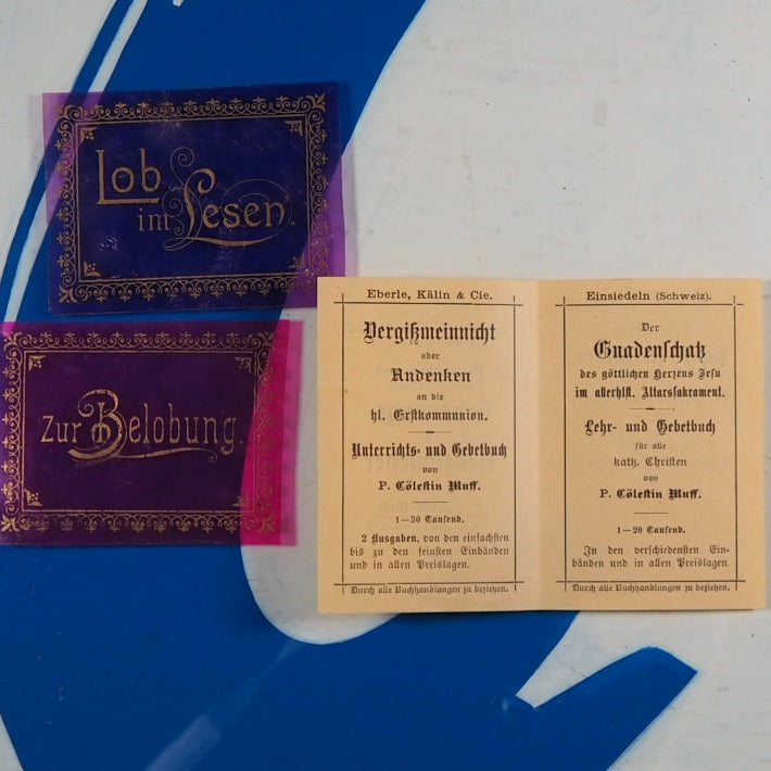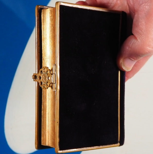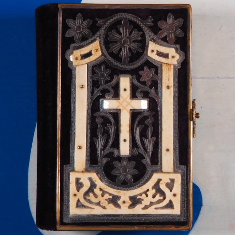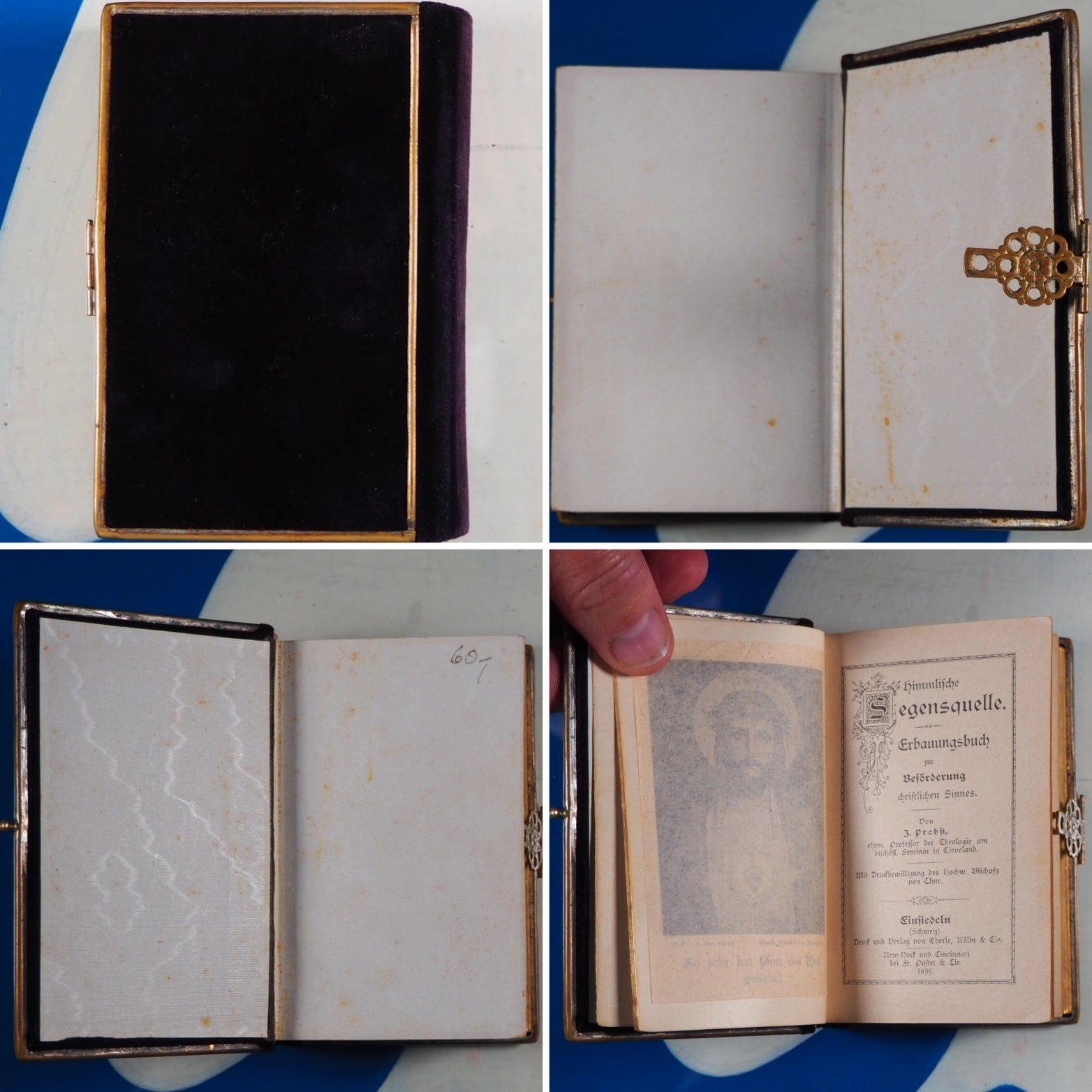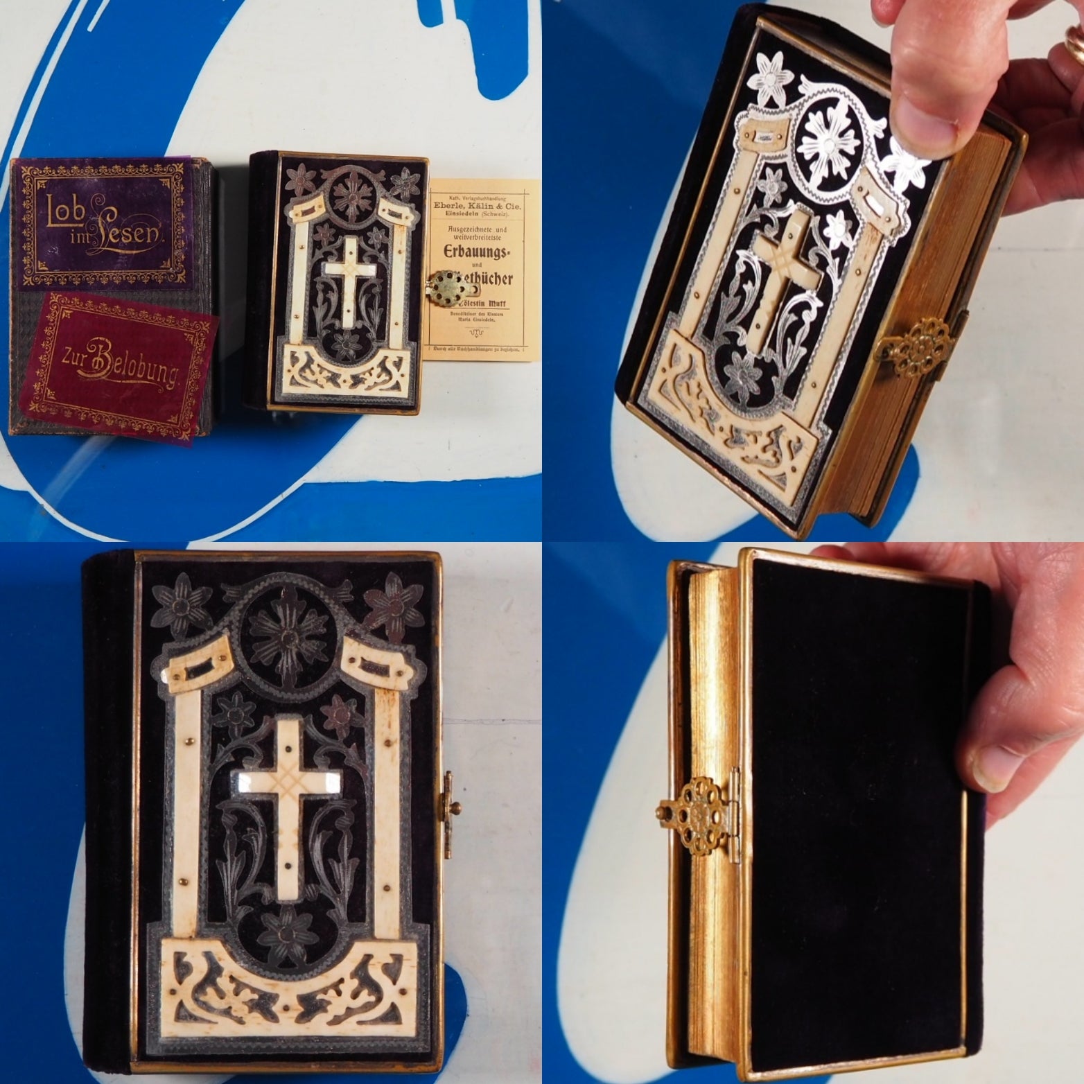 480 printed pages. Frontispiece. Black and white printed Gothic typescript in German. All edges gilt. From the contemporary loosely inserted printed slips, an engagement present ("zur Belobung" translates to on your engagement ). 82 x 120 mm. Splendid original purple velvet binding, with silver metal and bone mounts with brass pins of a central carved crucifix, with architectural abstract surrounds above a floral etched silver metal cut-out ground. Brass edges and brass floral clasp, with original embossed white endpapers. Preserved in original, decorative paper lined and black, 'engine-turned', embossed paper covered box (printed segensquelle 85a on the brown paper covered bottom edge). Loosely inserted is a contemporary publisher's folding advertisement for three other religious books. 19th century, near miniature, Swiss, devotional, Prayer book, in unusual Gothic binding. Seller Inventory # 5251