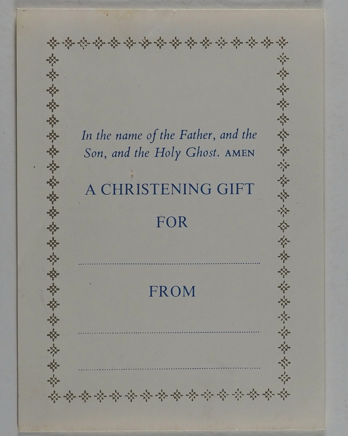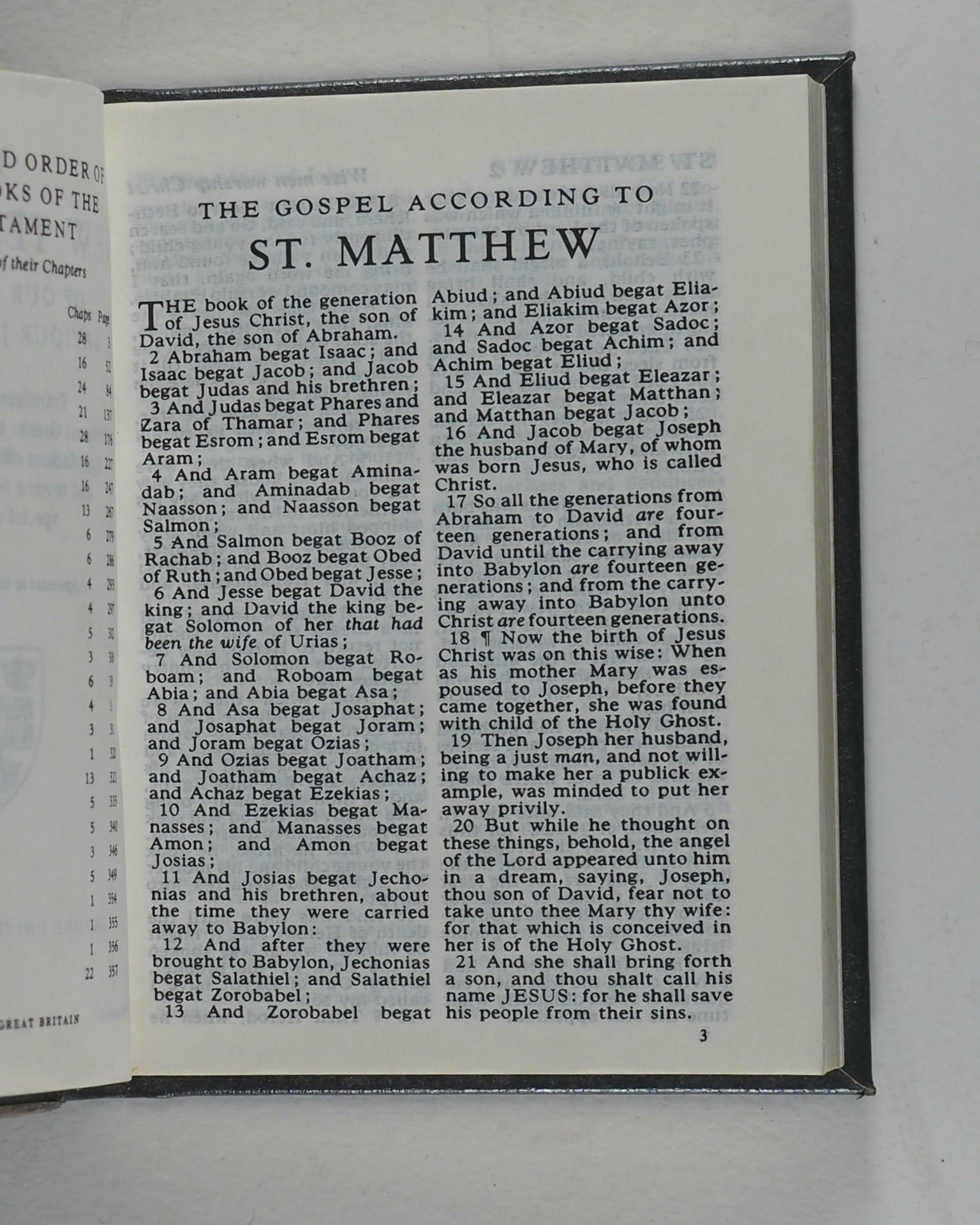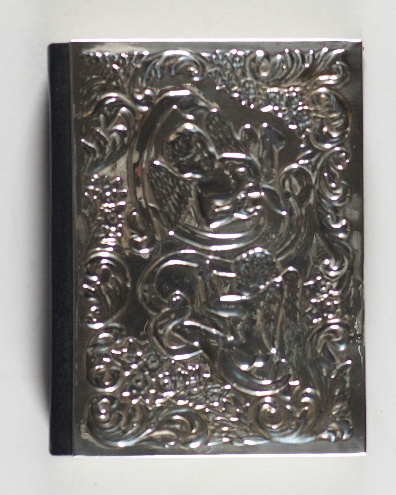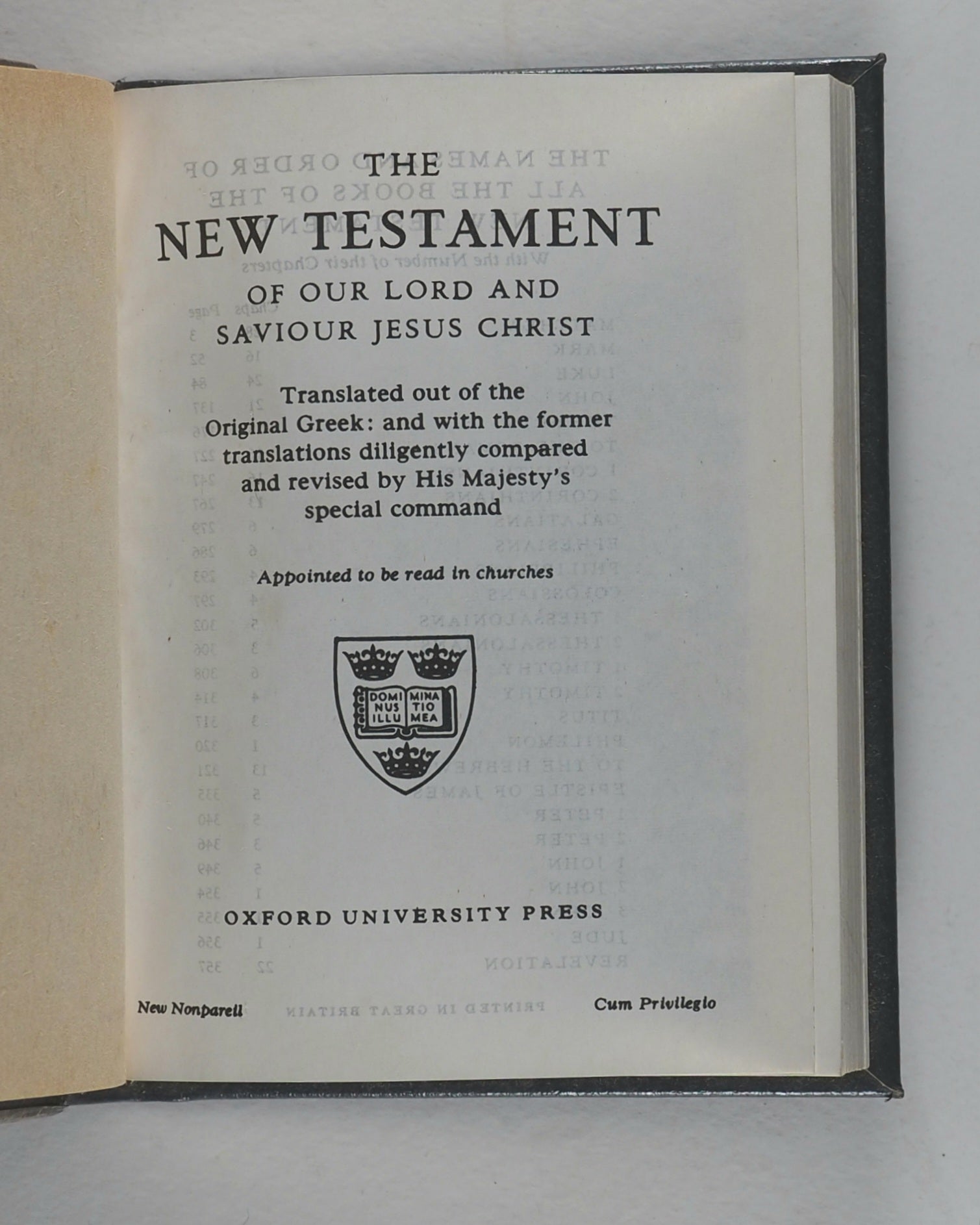 New Testament of Our Lord and Saviour Jesus Christ. Translated out of the original Greek. Oxford University Press. 381 printed pages on fine India paper. 95 x 128 mm. Original navy blue leather binding with fully hallmarked, repoussé silver plaque on the front cover, depicting two winged seraphim within roccoco swags and foliage. Assayed in Birmingham in 1994 and made by the renowned silversmiths Harman Brothers, who operated out of Spencer Street in Birmingham from 1918 to 1997. This wonderful and special bible is thirty years old but still in beautiful condition. No inscriptions to be found anywhere. Three completely unused original blue and gold printed adhesive bookplates loosely inserted: one reads 'Presented to', the next reads 'A Christening gift for' and the last is for a couple getting married. An ideal and fine present for a range of celebratory occasions.