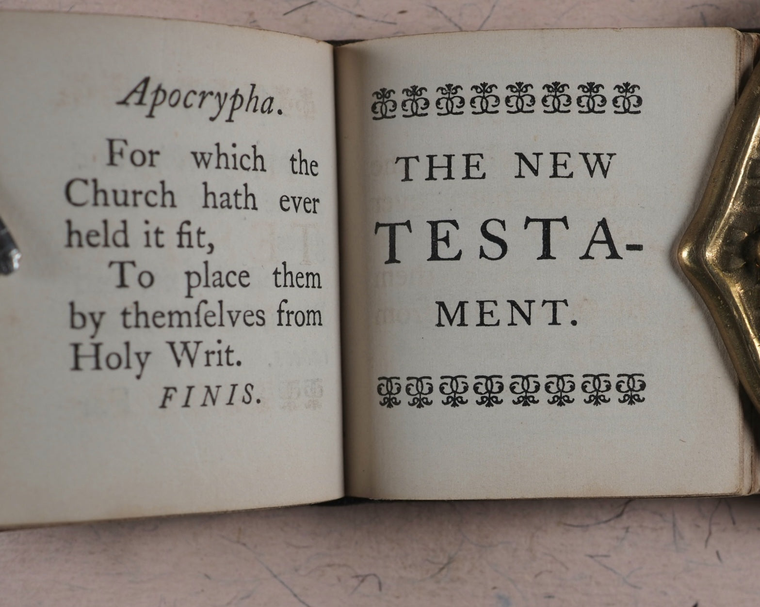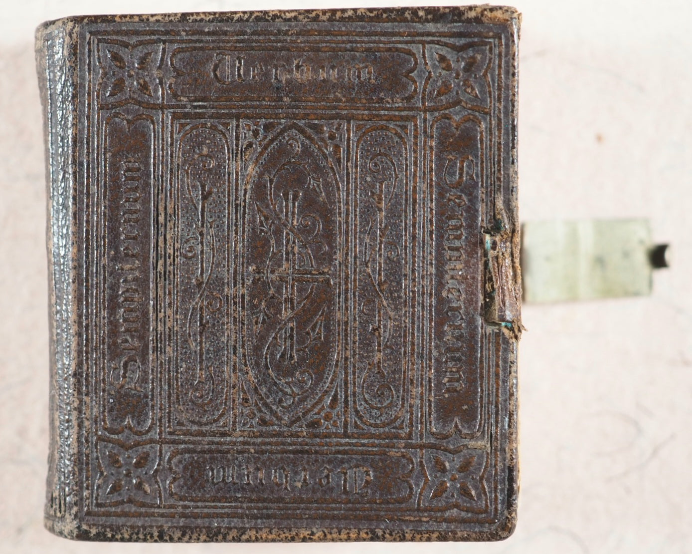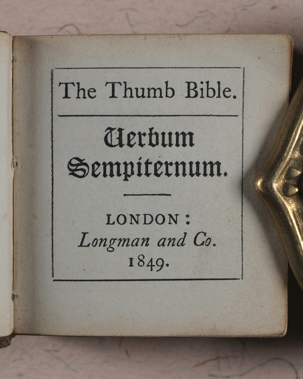 Thumb Bible. Verbum Sempiternum. Longman and co. London. 1849. [288] pages. Exact reprint (not facsimile) of 1693 third edition of couplets giving abstracts of scripture by John Taylor. Spelling revised. Including the New Testament, 'Salvator Mundi'. Printed by C. Whittingham, Chiswick, in 12-point typeface. All edges red. Marbled endpapers. Half-title slightly thumbed. 50 x 55 mm. Publisher's brown blind-stamped decorated calf. Lacks original metal piece where the clasp attaches to the front cover. This Longman edition was well enough received to go on to four furhter editions, the last one in 1860, and a final reprint in 1889 by Hodder & Stoughton. Johnston, x. Spielmann, 496. Stone, 'Snuff-Boxful', 44. Welsh, 1218. WorldCat locates no copies worldwide of this edition.