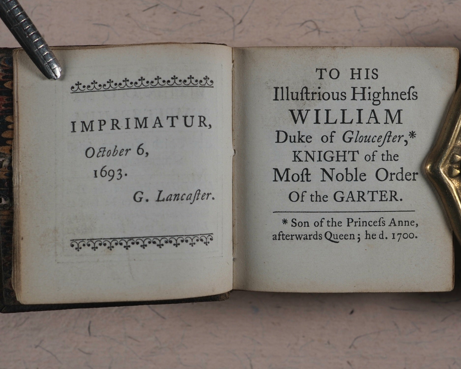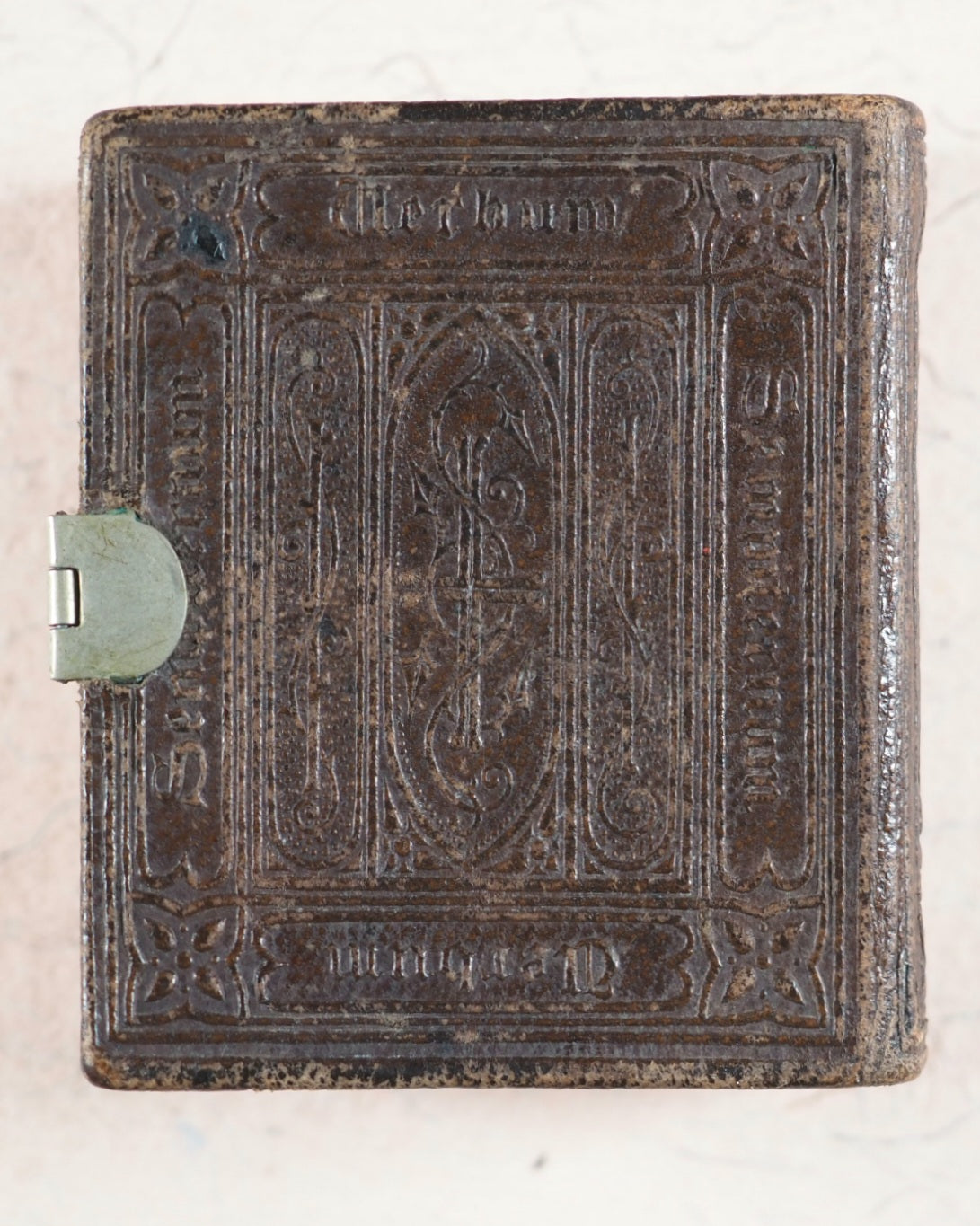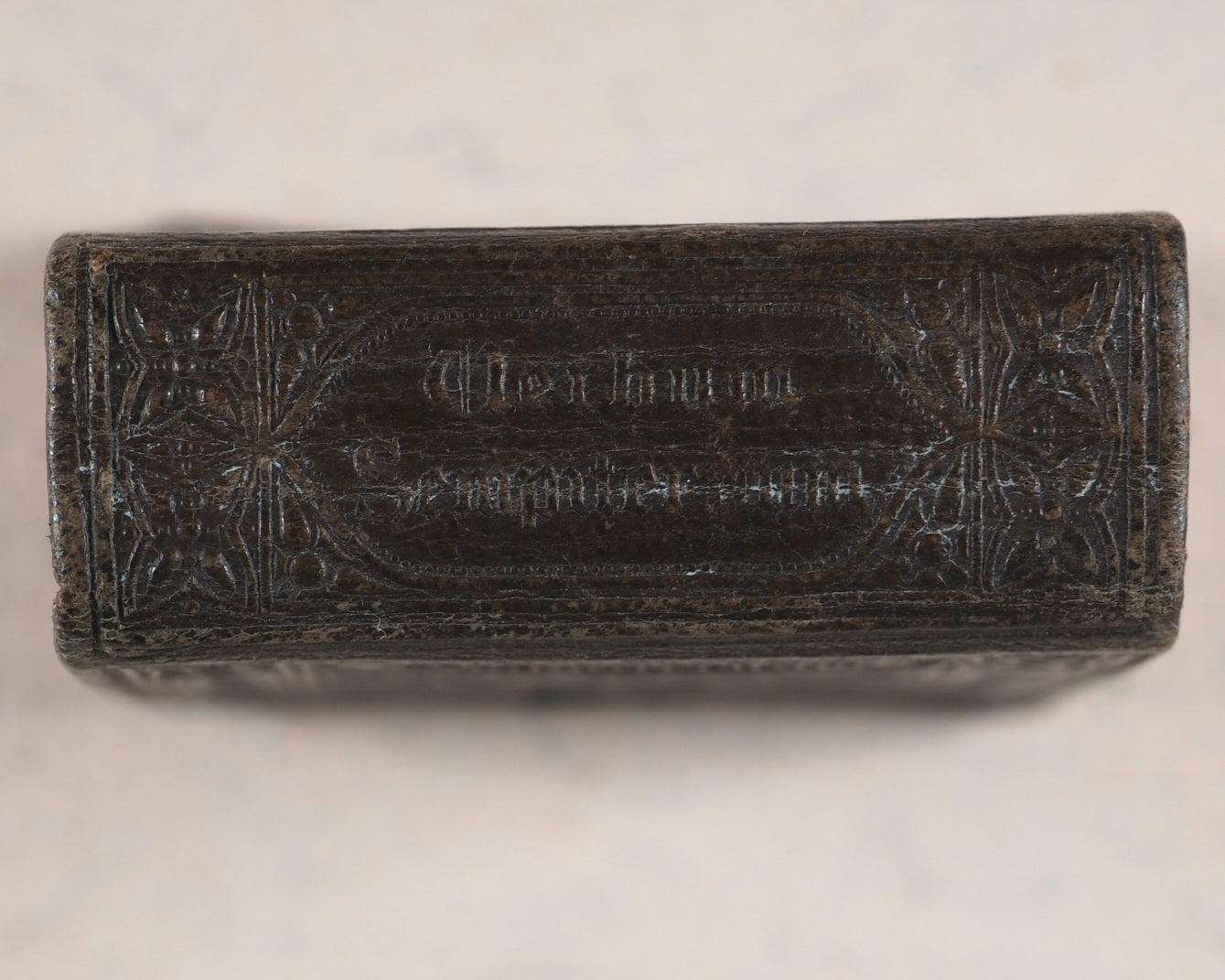 Thumb Bible. Verbum Sempiternum. Longman and co. London. 1849. [288] pages. Exact reprint (not facsimile) of 1693 third edition of couplets giving abstracts of scripture by John Taylor. Spelling revised. Including the New Testament, 'Salvator Mundi'. Printed by C. Whittingham, Chiswick, in 12-point typeface. All edges red. Marbled endpapers. Half-title slightly thumbed. 50 x 55 mm. Publisher's brown blind-stamped decorated calf. Lacks original metal piece where the clasp attaches to the front cover. This Longman edition was well enough received to go on to four furhter editions, the last one in 1860, and a final reprint in 1889 by Hodder & Stoughton. Johnston, x. Spielmann, 496. Stone, 'Snuff-Boxful', 44. Welsh, 1218. WorldCat locates no copies worldwide of this edition.