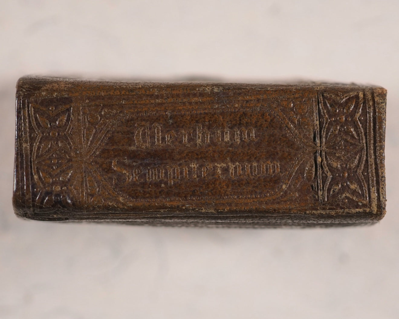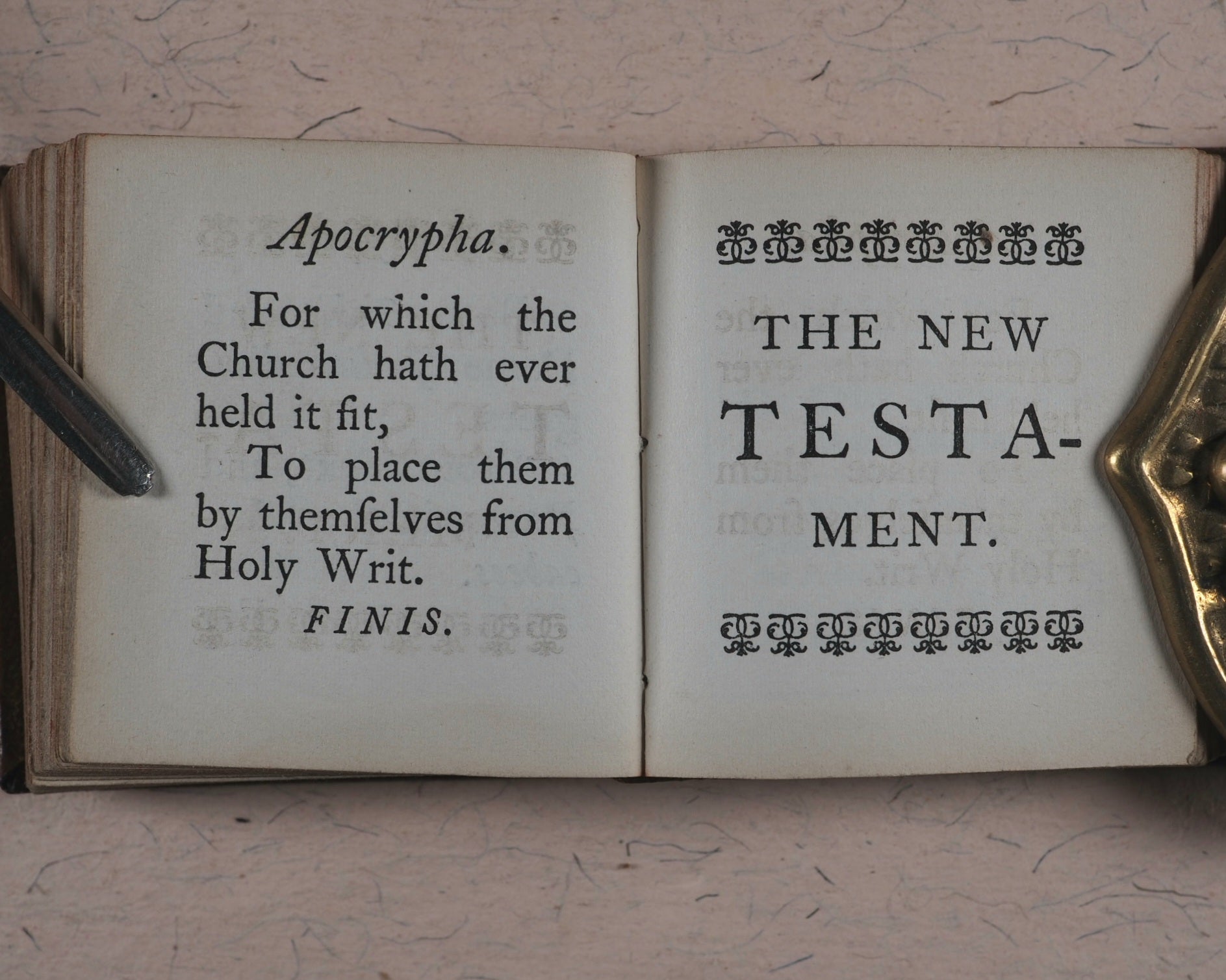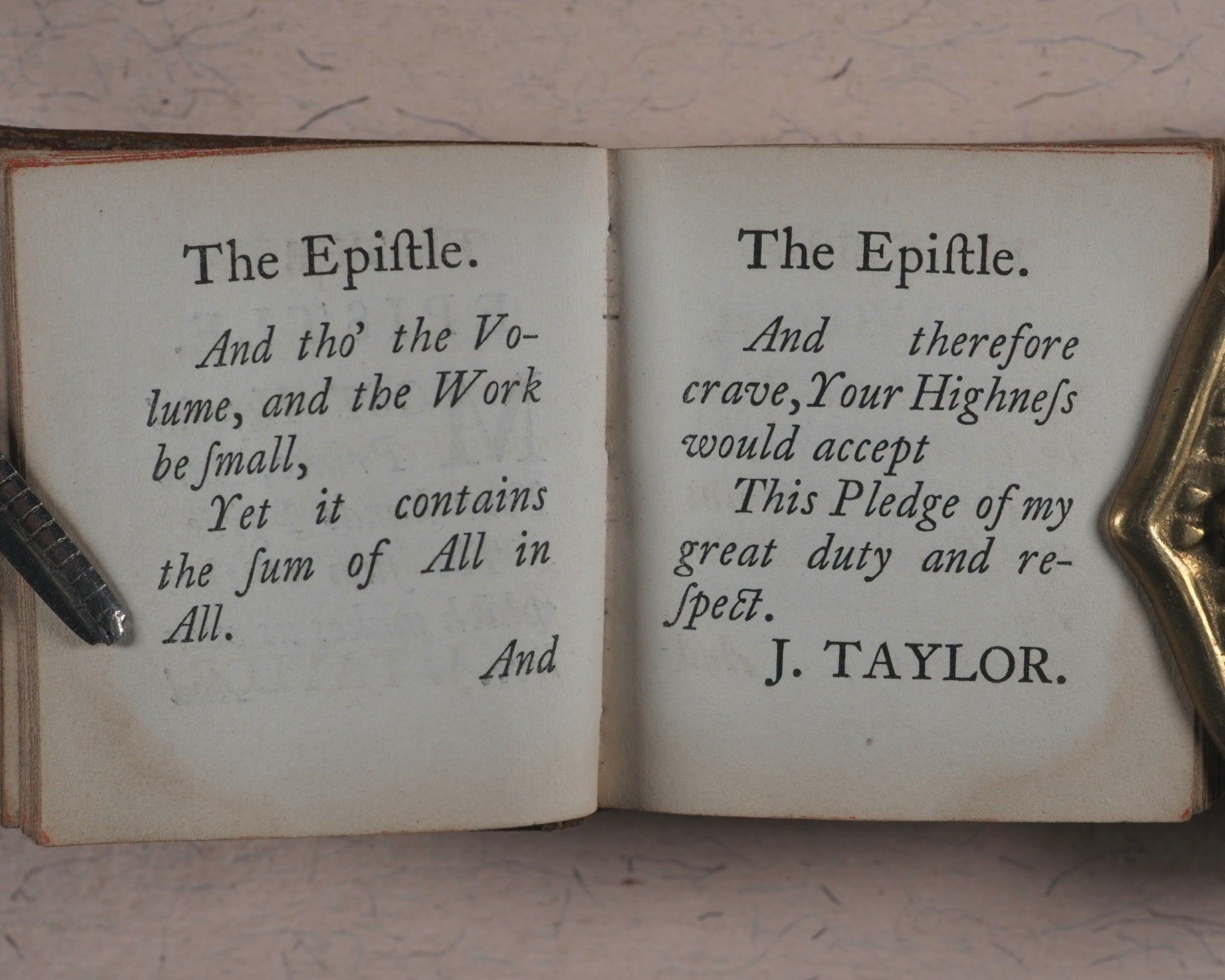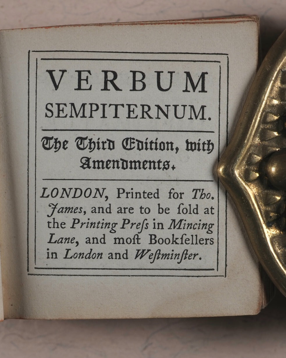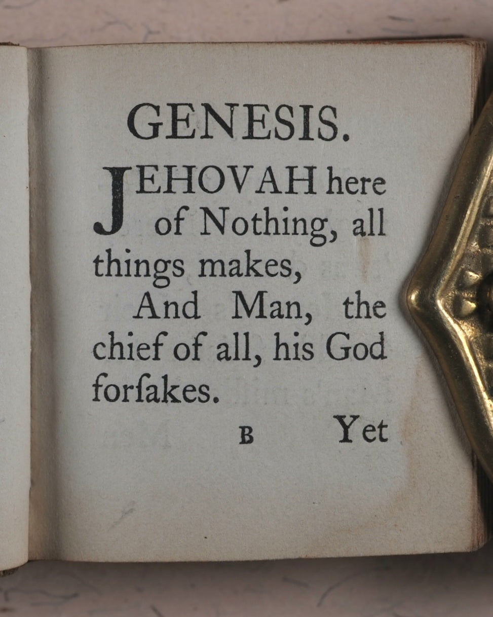 [288] pages. Exact reprint (not facsimile) of 1693 third edition of couplets giving abstracts of scripture by John Taylor. Spelling revised. Including the New Testament, 'Salvator Mundi'. Printed by C. Whittingham, Chiswick, in 12-point typeface. All edges red. Marbled endpapers. Some page edges with marginal old and mild staining. 50 x 55 mm. Publisher's brown blind-stamped decorated calf. Lacks original metal clasp. This third Longman edition was well enough received to go on to four editions, the last one in 1860, and a final reprint in 1889 by Hodder & Stoughton. Johnston, x. Not in Spielmann. Stone, 'Snuff-Boxful', 44. Welsh, 1220. WorldCat locates no copies worldwide of this edition.