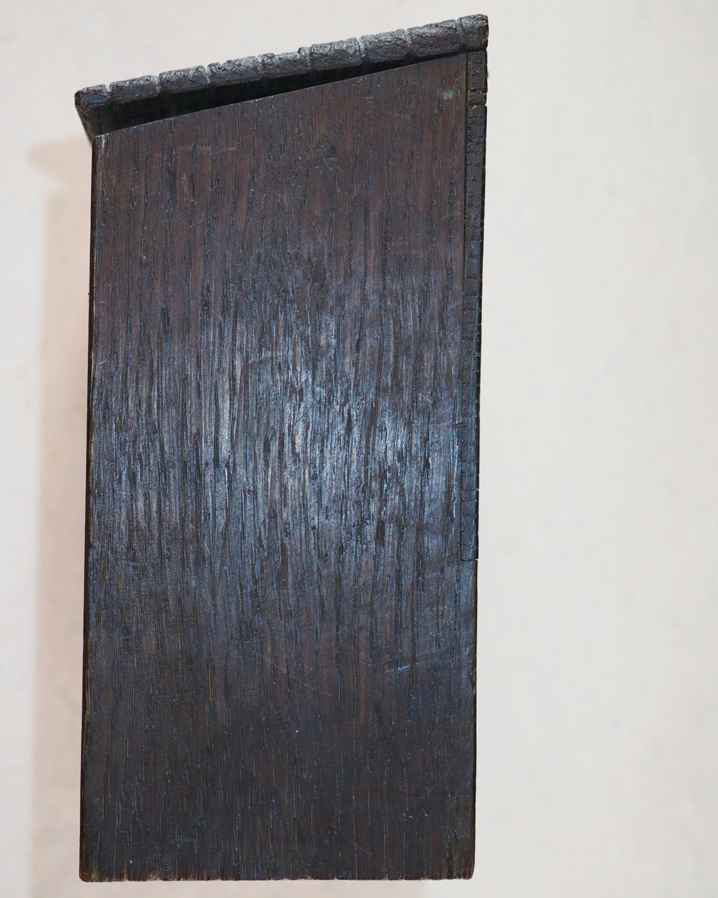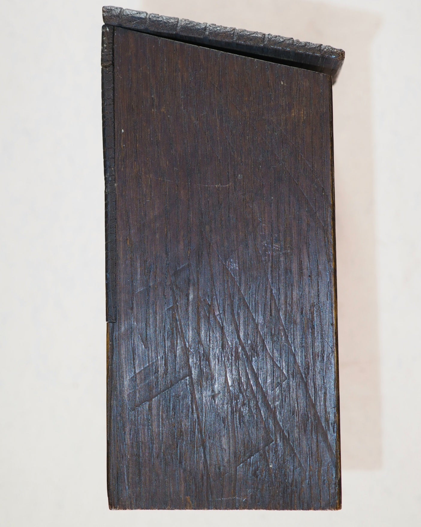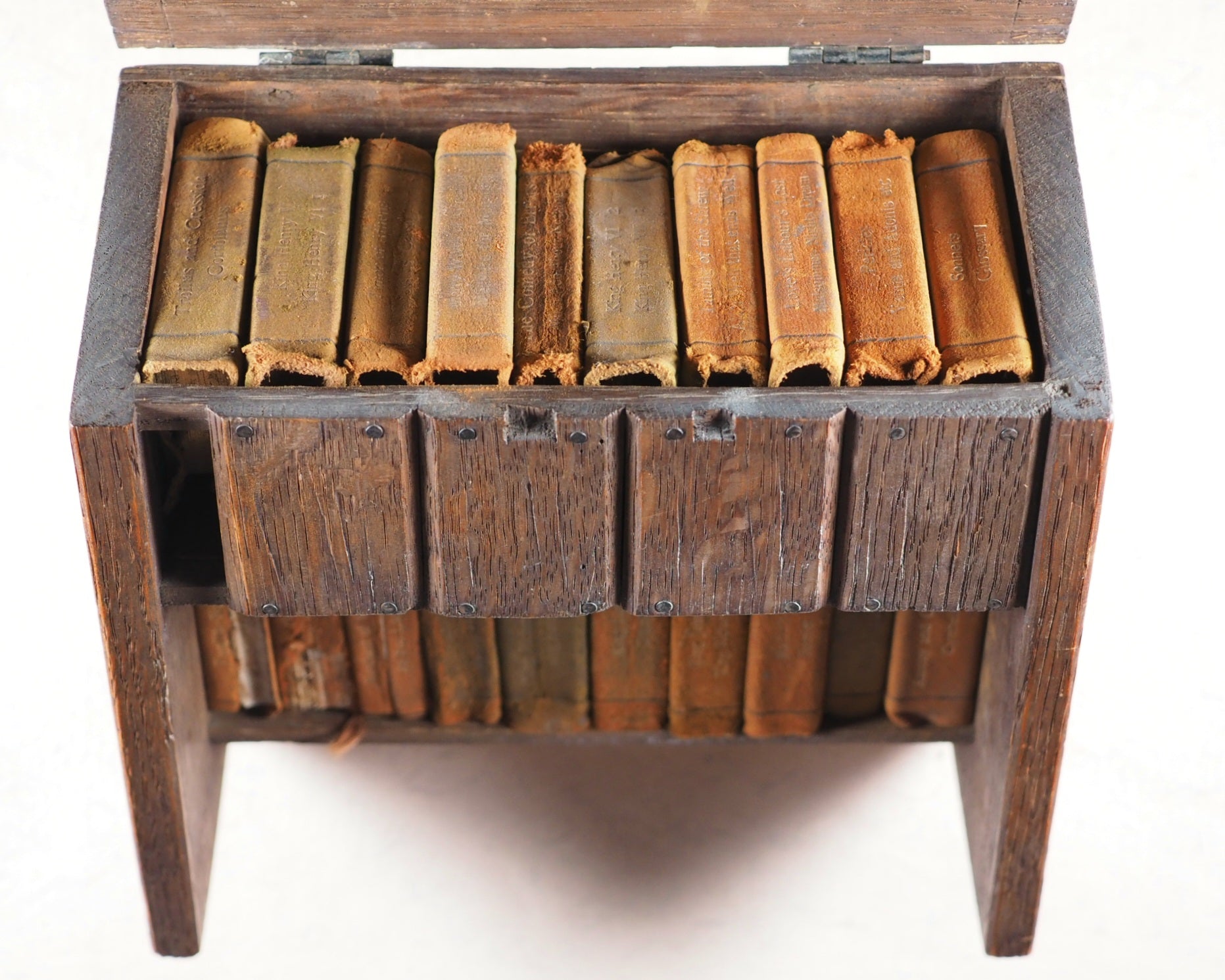 20 volume set of William Shakespeare's works housed in a miniature wooden replica of Shakespeare's desk which is modelled on the original in a Stratford museum. 18.5 x 17.5 x 8 cm. This desk is made of oak taken from Holy Trinity Church, Stratford-Upon-Avon, where Shakespeare was baptised and buried. The original of Shakespeare's desk may be seen in Shakespeare's House in Stratford-Upon-Avon, England. A label on the rear says that this replica miniature desk is made from oak from Holy Trinity Church, where he was baptized and is buried. There is the original deliberate scrawling on the desk lid, for child-like authenticity. Crack along the back below the hinges, otherwise the desk is in very good condition (I have never seen any for sale in the last 25 years other than this one and another that was sold by a collector in a public auction at Bonhams, 9th November 2022). There is one other desk in the National Library of Scotland in Glasgow, but no others I can trace. These 'forty bound as twenty' volumes, are extremely uncommon and difficult to find. This was one of only two presentations I know of - the other being the oak chest - that Bryce had two Shakespeare works especially bound into one - to complete the set in 20, instead of 40, books. Two volumes with defective spines, and one volume missing but has a replacement of the same two plays - As You Like It, and Merchant of Venice - not having the yapp edges nor front cover crest, but published in the same series, and of the same publication date - just that one binding varies slightly. All spines faded. All bindings slightly worn.