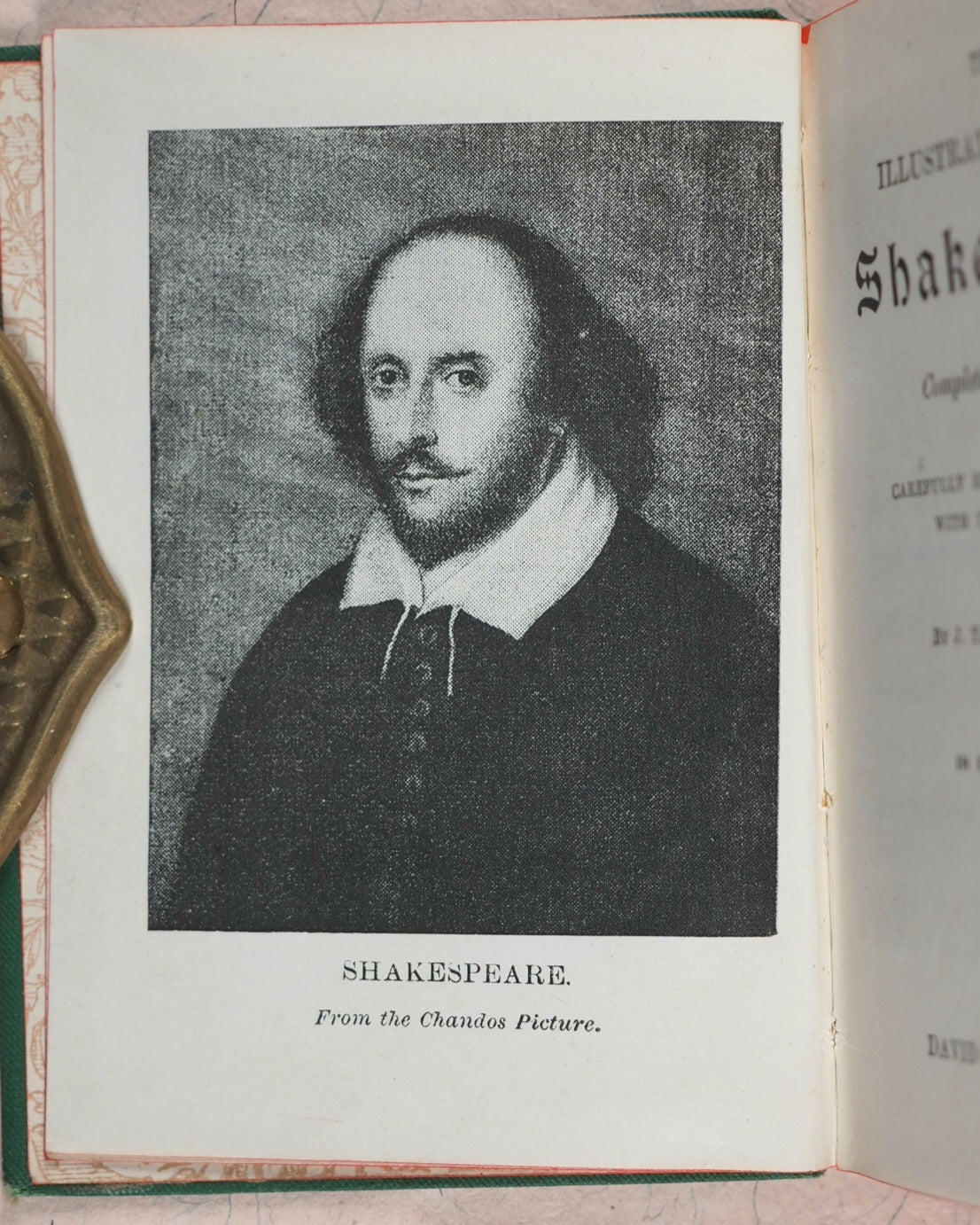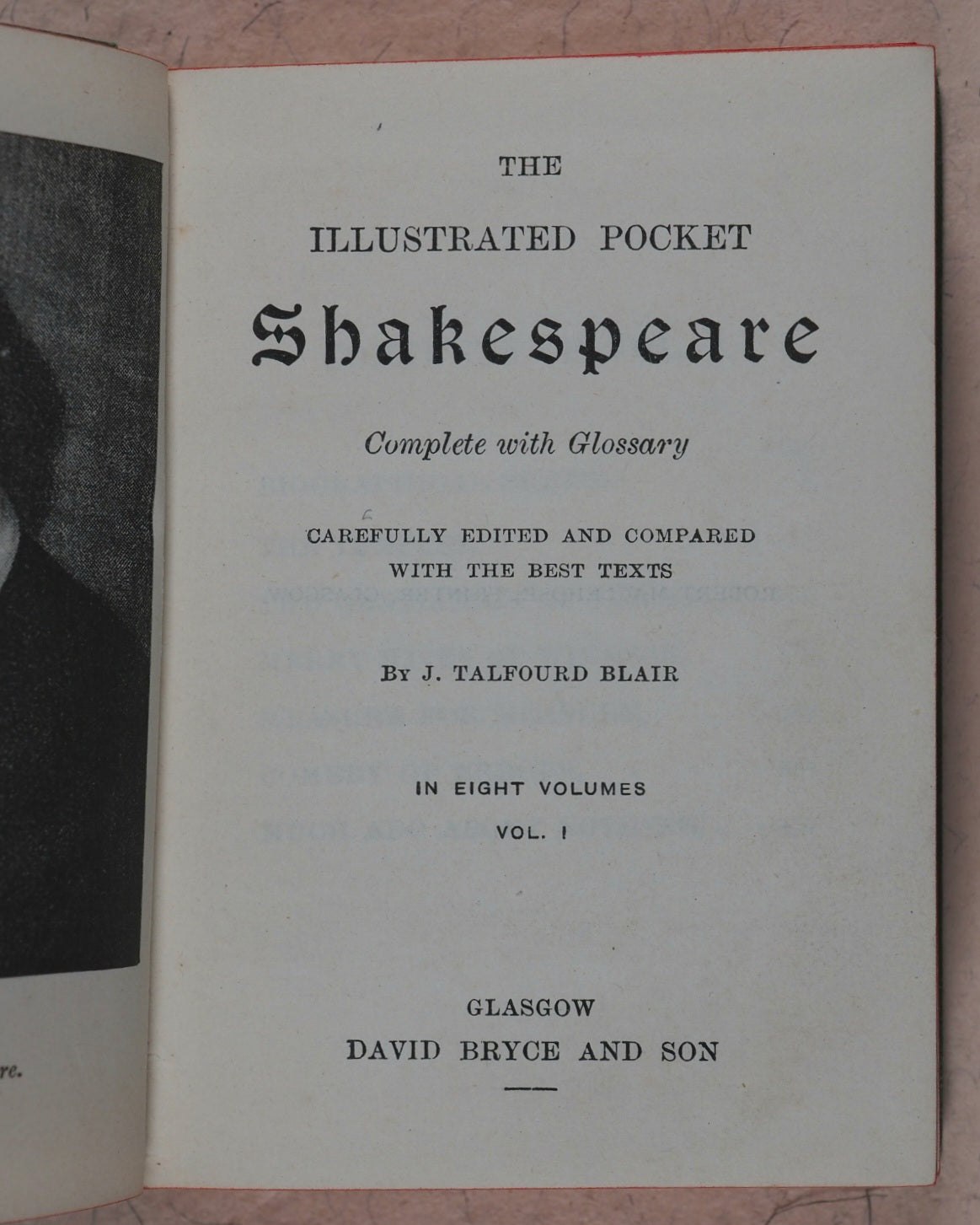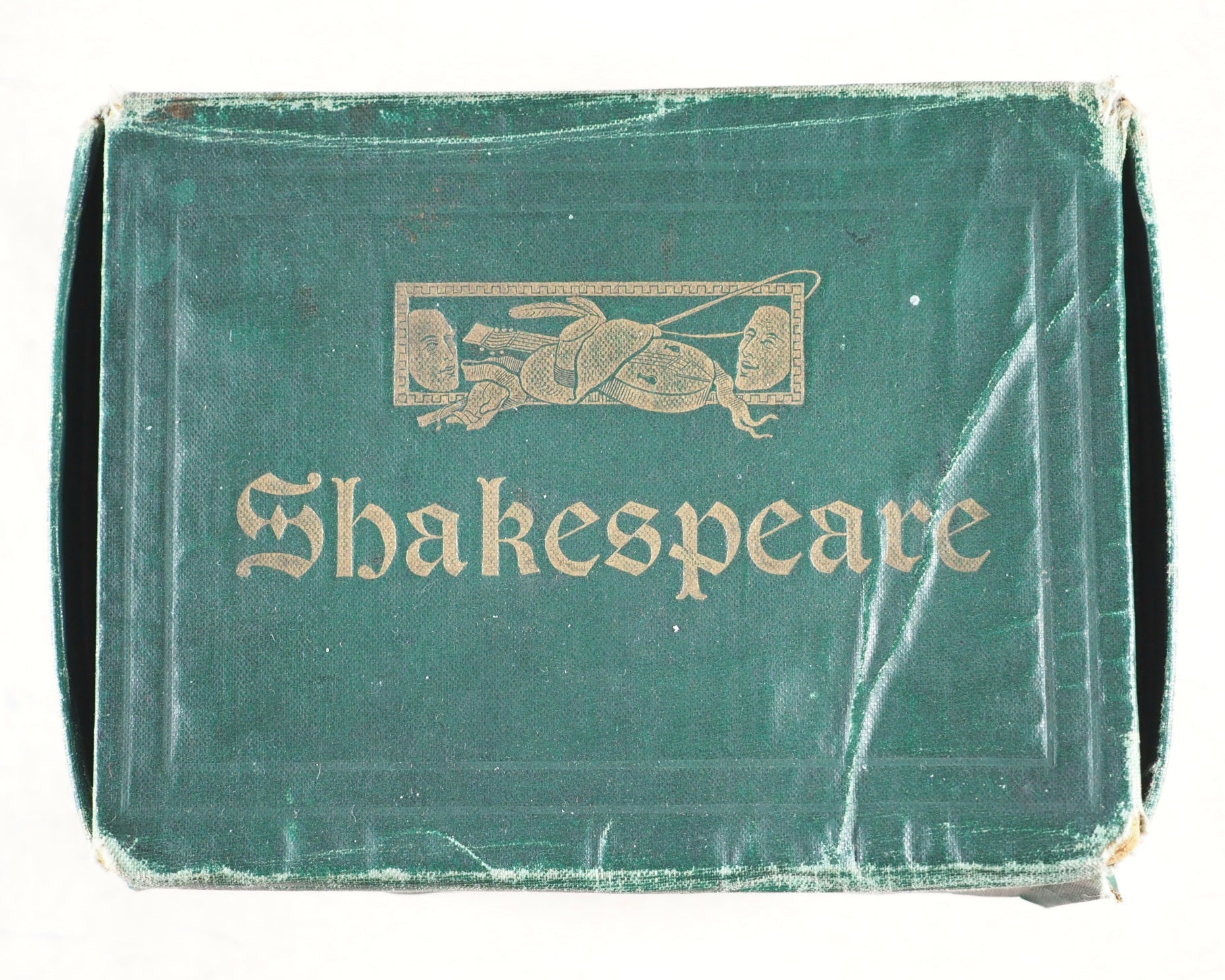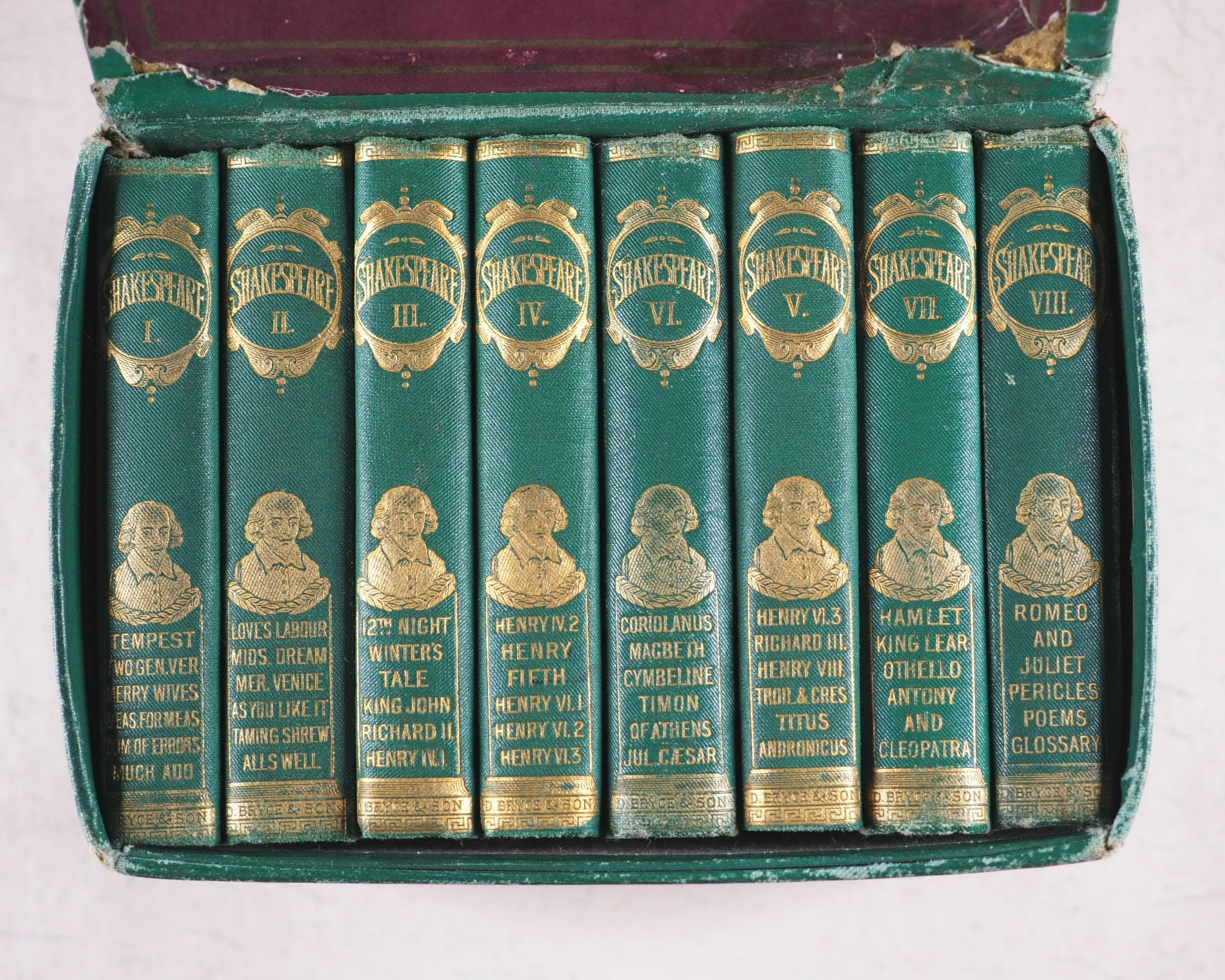 Date from British Museum acquisition stamp in 1886. 8 volumes edited by Talfourd Blair. Each volume with frontispiece. 516; 534; 482; 490; 496; 508; 499, and 523 printed pages including glossary at end. Printed by Robert Maclehose, Glasgow. Uncommon boxed set. A few volumes with the odd slightly sprung gathering. Decorated endpapers. All edges red. Case 14 x 10 x 7.5cm. Each volume, 67 x 93mm. Original green embossed cloth; spine with bust of Shakespeare surmounting list of plays and publisher all in gilt and with gilt titling cartouche above and scrolling greek key pattern in gilt at the head and tail; plain back covers but blind embossed front covers with three various decorative scenes. Box in matching cloth; lid gilt emboseed "Shakespeare" and with theatrical emblems within scrolling key border. Lacks original ribbons. Barely any significant handling or wear. Box rather worn at the top hinge; slight wrinkling, rubbing all over with mild spotting and damage at the sides. Not in Bondy, nor Spielmann, nor Welsh. OCLC, 829710418. WorldCat locates 7 copies worldwide.