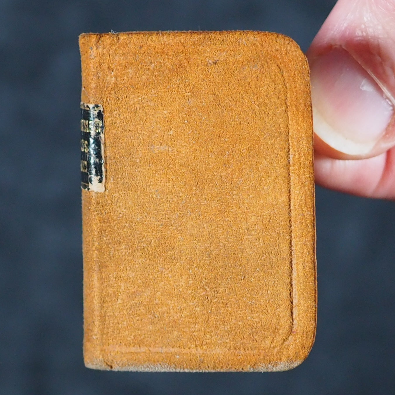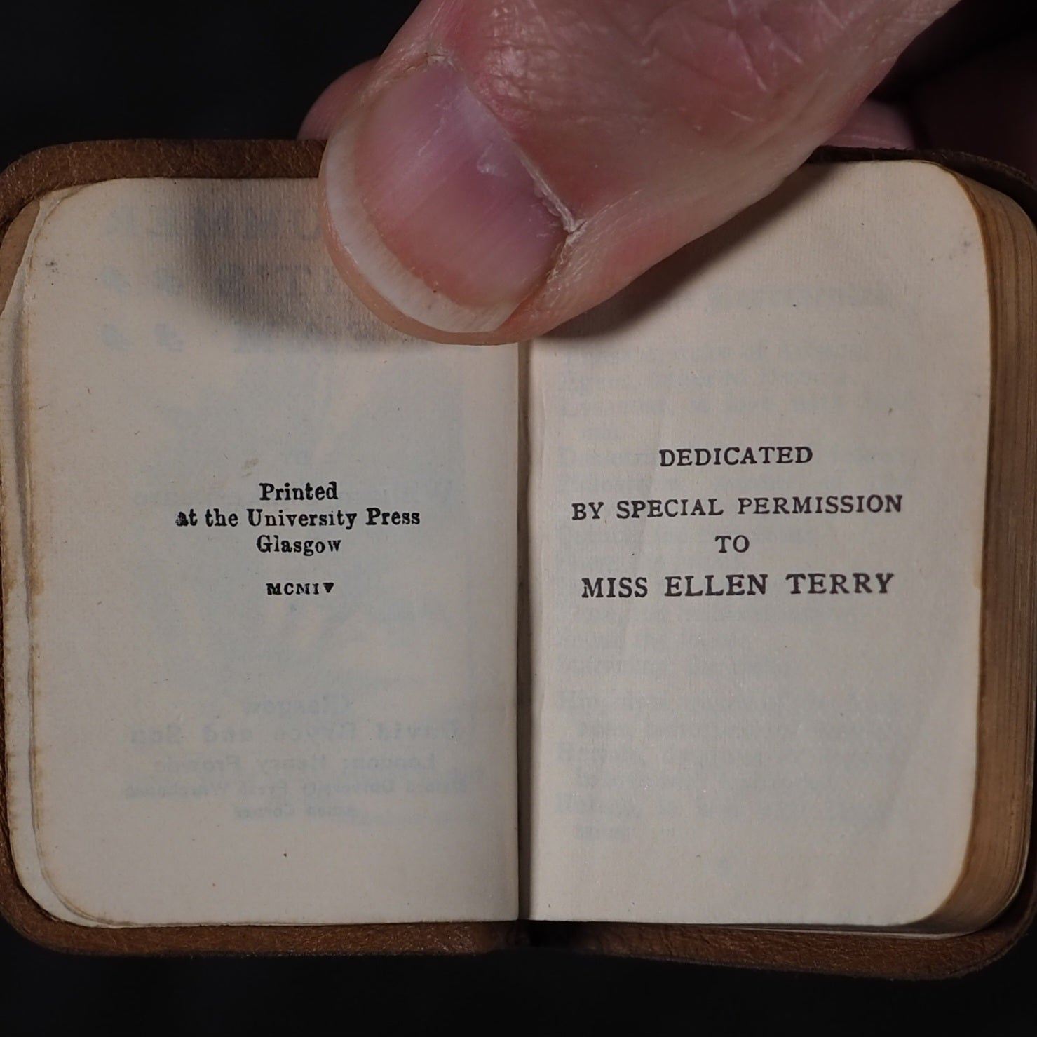 Shakespeare, William. Midsummer Night's Dream. Bryce, David & Son. Glasgow. 1904. 285 printed pages. Thin India paper. Frontispiece. Rounded corners. Original marbled endpapers. Contemporary ink ownership signature on verso of front free endpaper. Original glossy blue retailer's label on front free endpaper "From The Tudor House" Stratford-upon-Avon". 35 x 50 mm. Original tan suede; black leather label with gilt lettering on spine; covers with single ruled blind-embossed border. One of a series of miniature books dedicated by the publisher David Bryce to the actress Miss Ellen Terry. The eighth of forty volumes that made up the Ellen Terry Complete Works of Shakespeare. "Carefully edited and compared with the best texts by J. Talfourd Blair". Bryce achieved this tiny print with the relatively recent technology of the time , Photographic Reduction: regular sized printed content was photographed using high-resolution cameras. The negative of the photograph was then reduced in size multiple times until the desired miniature size using photomechanical processes; combining advanced photographic techniques with traditional electroplating and printing methods could create tiny, highly detailed books. He also maintained strong connections with the printing houses associated with the universities of Glasgow and Oxford, which helped account for the clarity and legibility of the texts. His association with Oxford University Press was especially fortunate, as from 1875 they owned the process to make the ultra-thin opaque sheets called 'India paper', which enabled the production of extremely small textblocks. Henry Frowde was manager of the London office of Oxford University Press until 1913. OCLC, 270900821. Garbett, 42. Welsh, 6300.