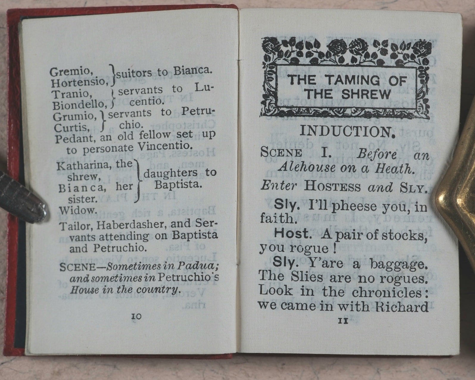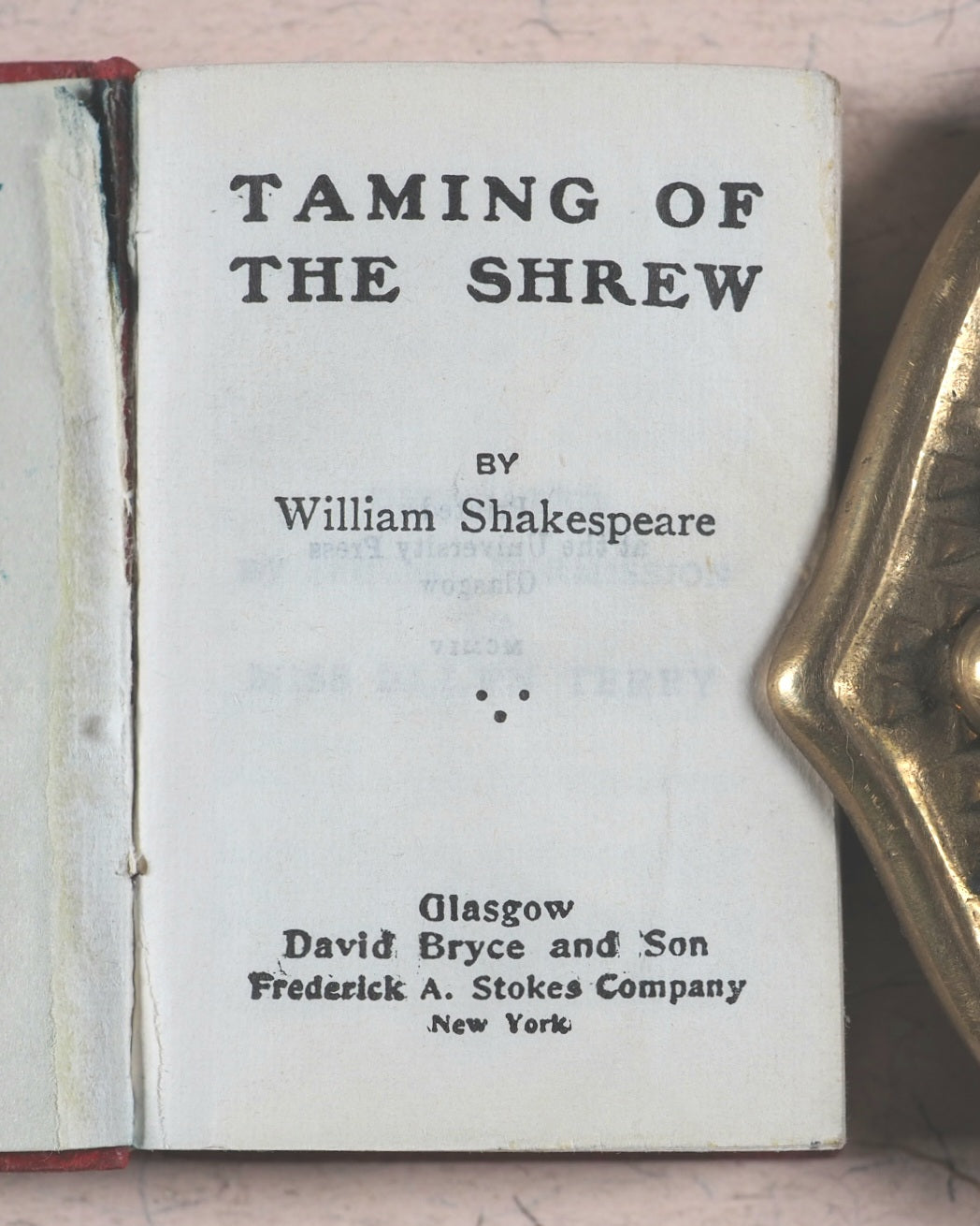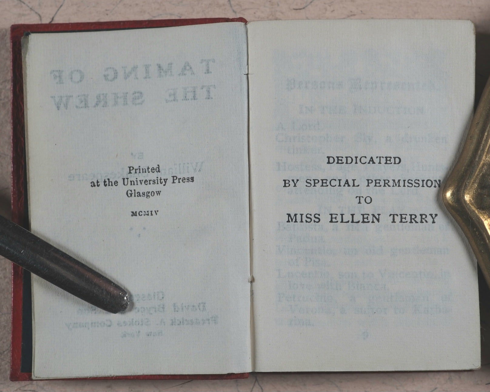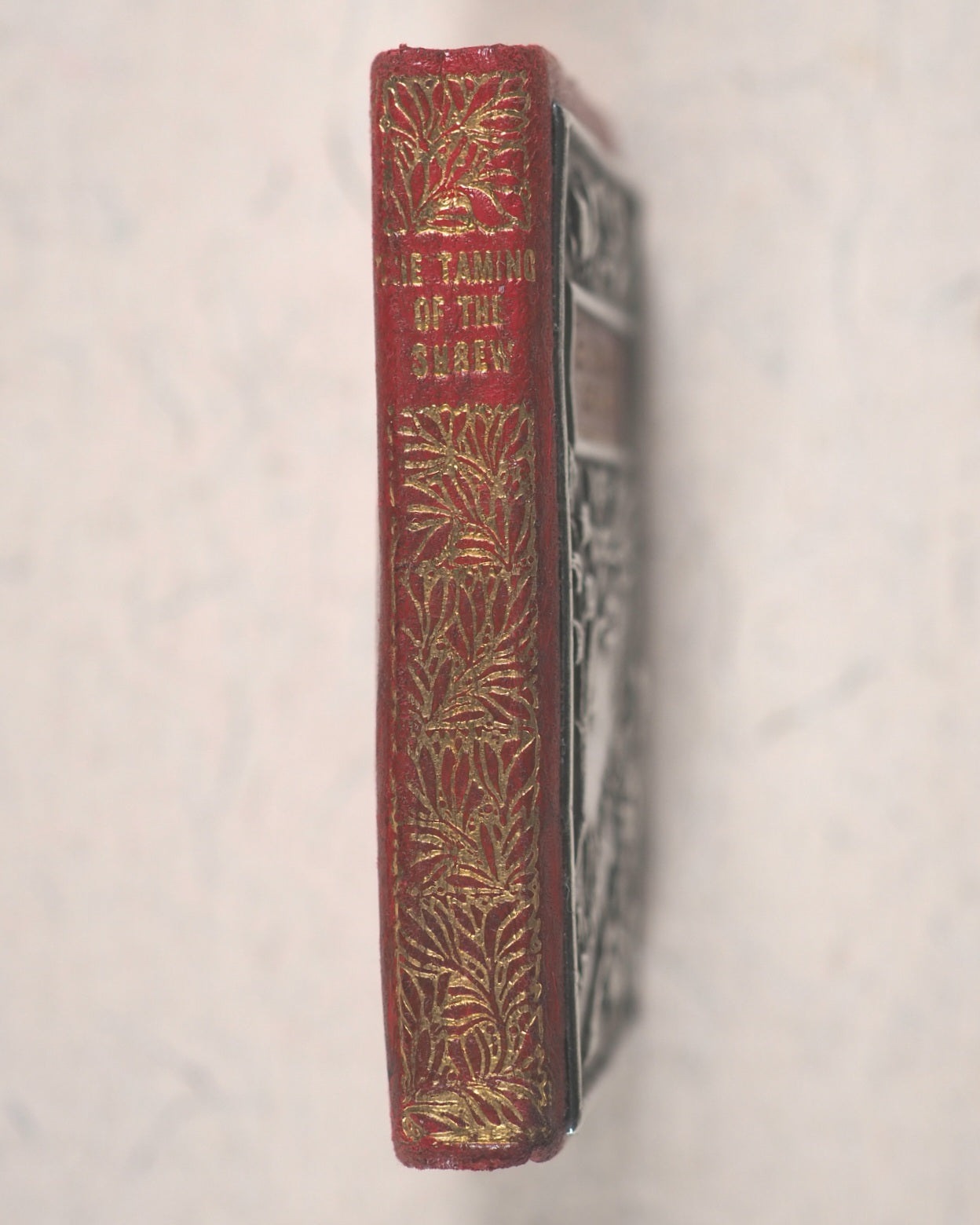 355 printed pages. Frontispiece. Ellen Terry Shakespeare, volume 11. Embossed, fully hallmarked silver plaque affixed to the front cover. Levi and Salaman, Birmingham, 1904. All edges gilt. Original dark blue endpapers. 35 x 50 mm. Original full red limp lambskin; spine and front cover with gilt titling and decoration. Bondy, 114. Garbett, 41. Welsh, 6325.
