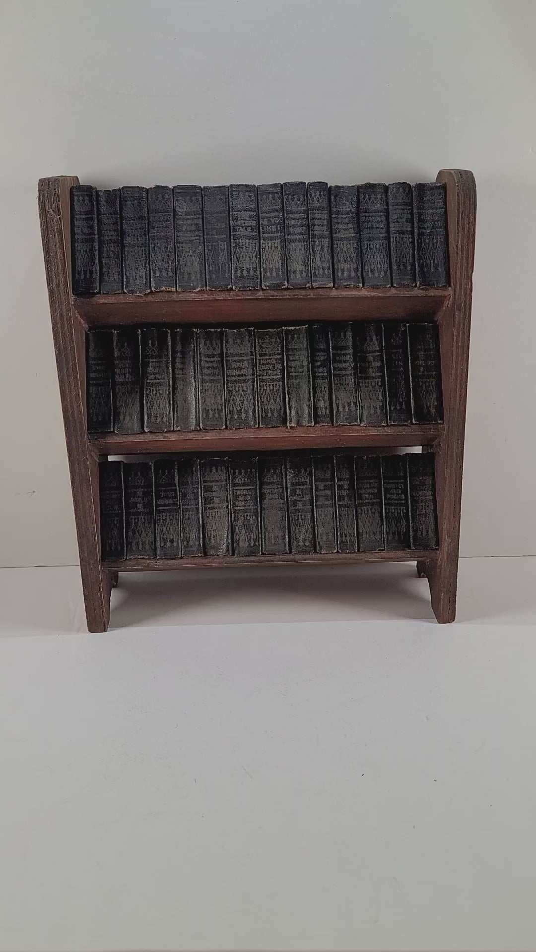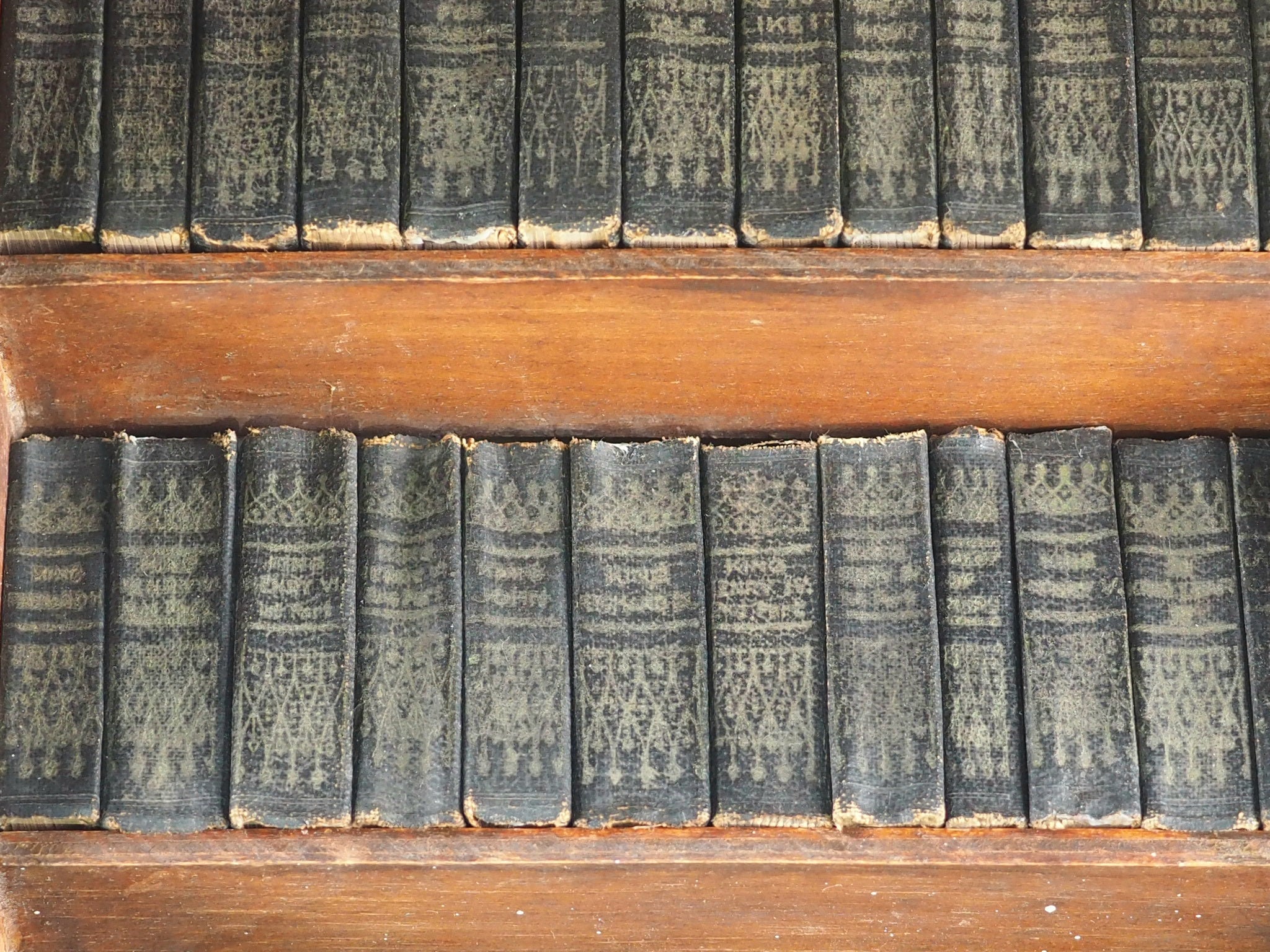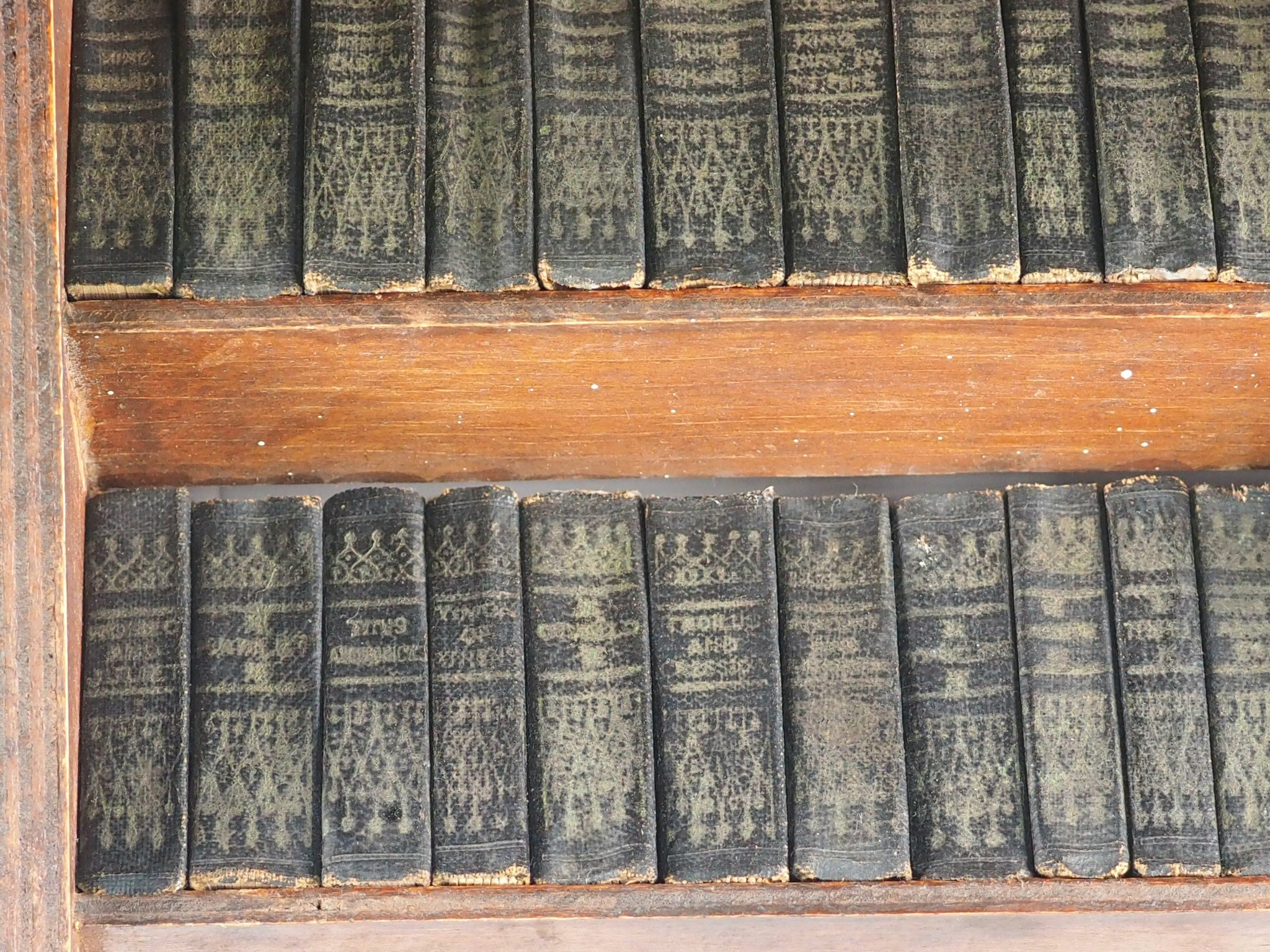 1 1/4 in. WIDE. BOOKS VARY FROM l/8 in. to 1/4 in. IN THICKNESS. EACH VOLUME WEIGHS FROM 1/2 oz. to 1 oz. WEIGHT OF 40 VOLS. WITH BOOKCASE, 2lb 6oz. Each Book is Bound in Morocco-grained Rexine with Title and Decorative Design on Spine in Gilt.