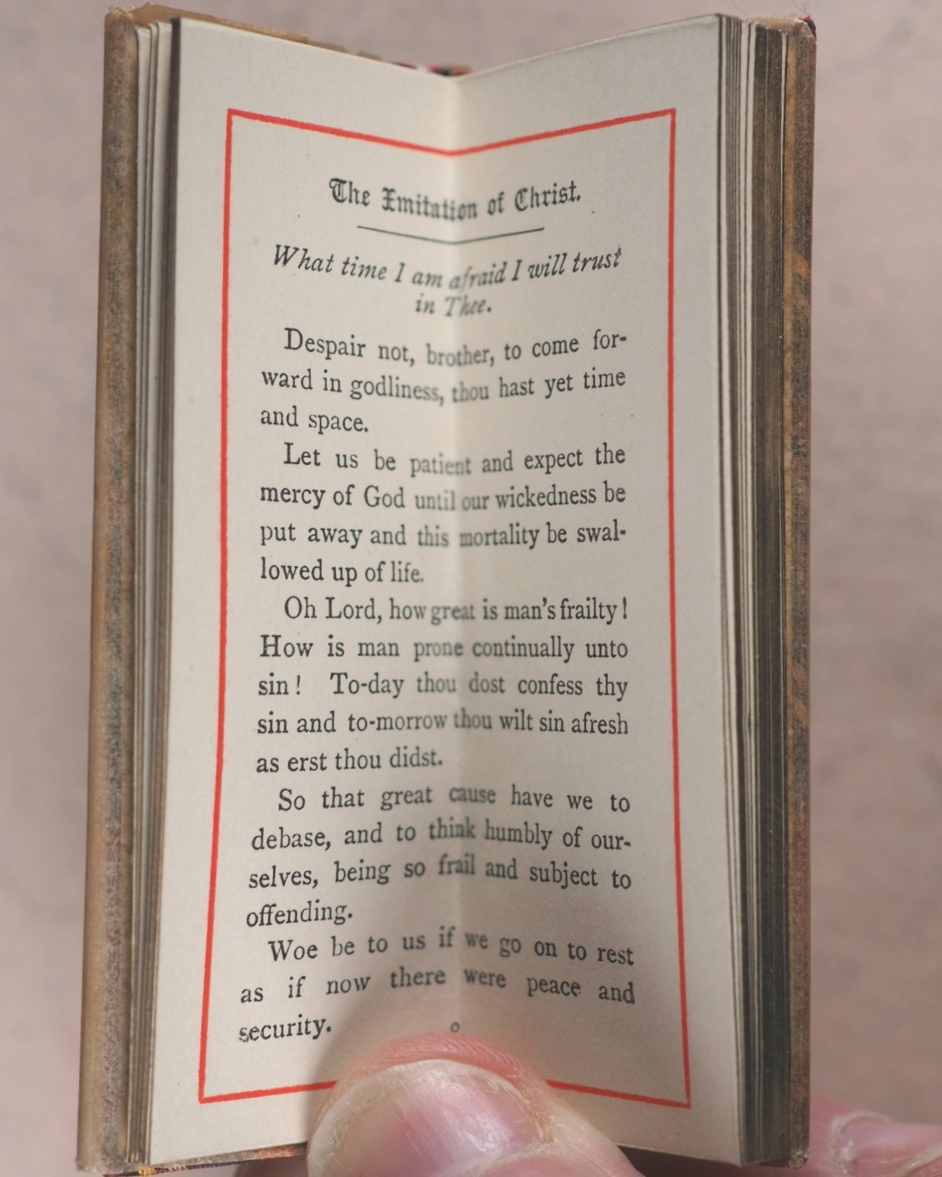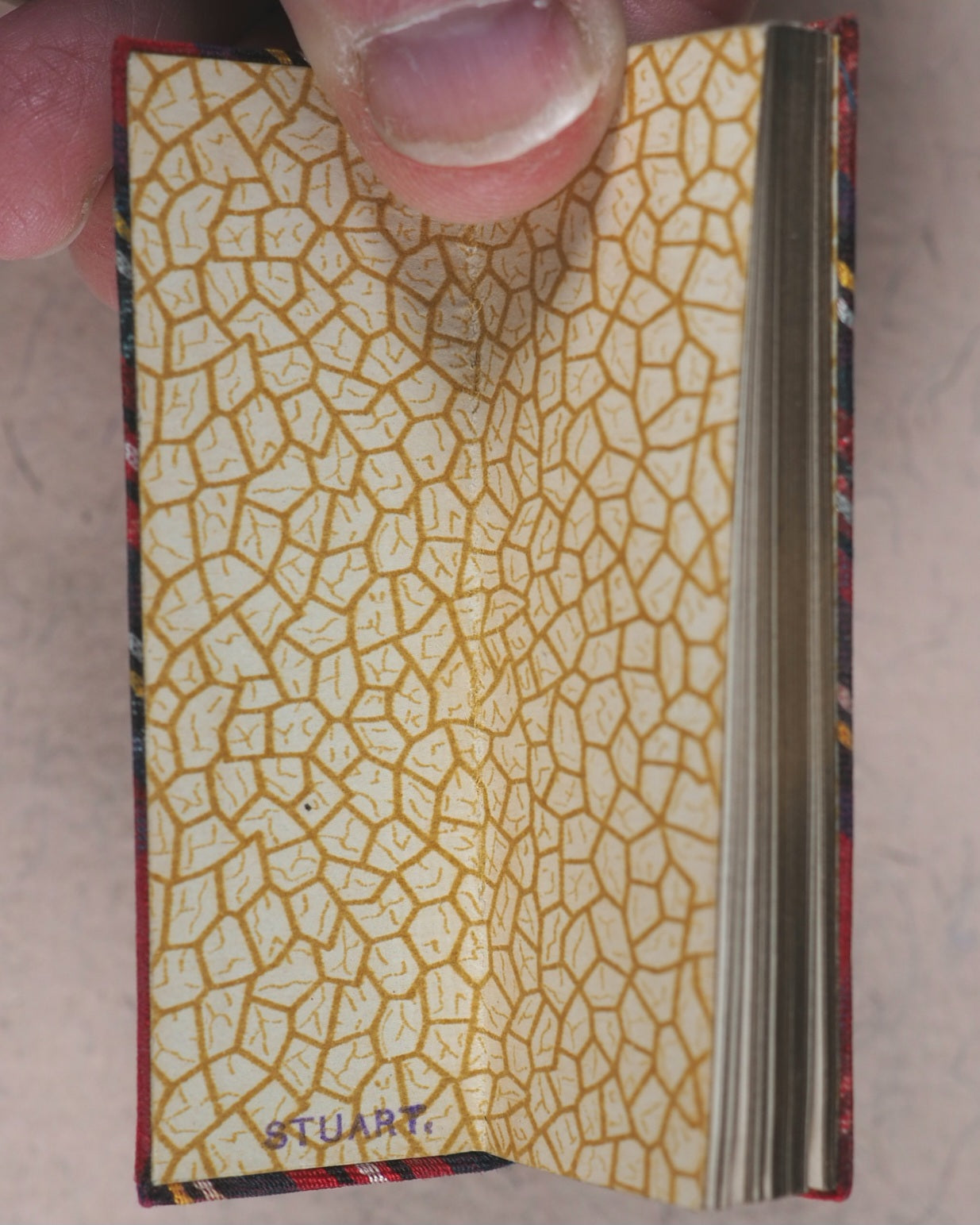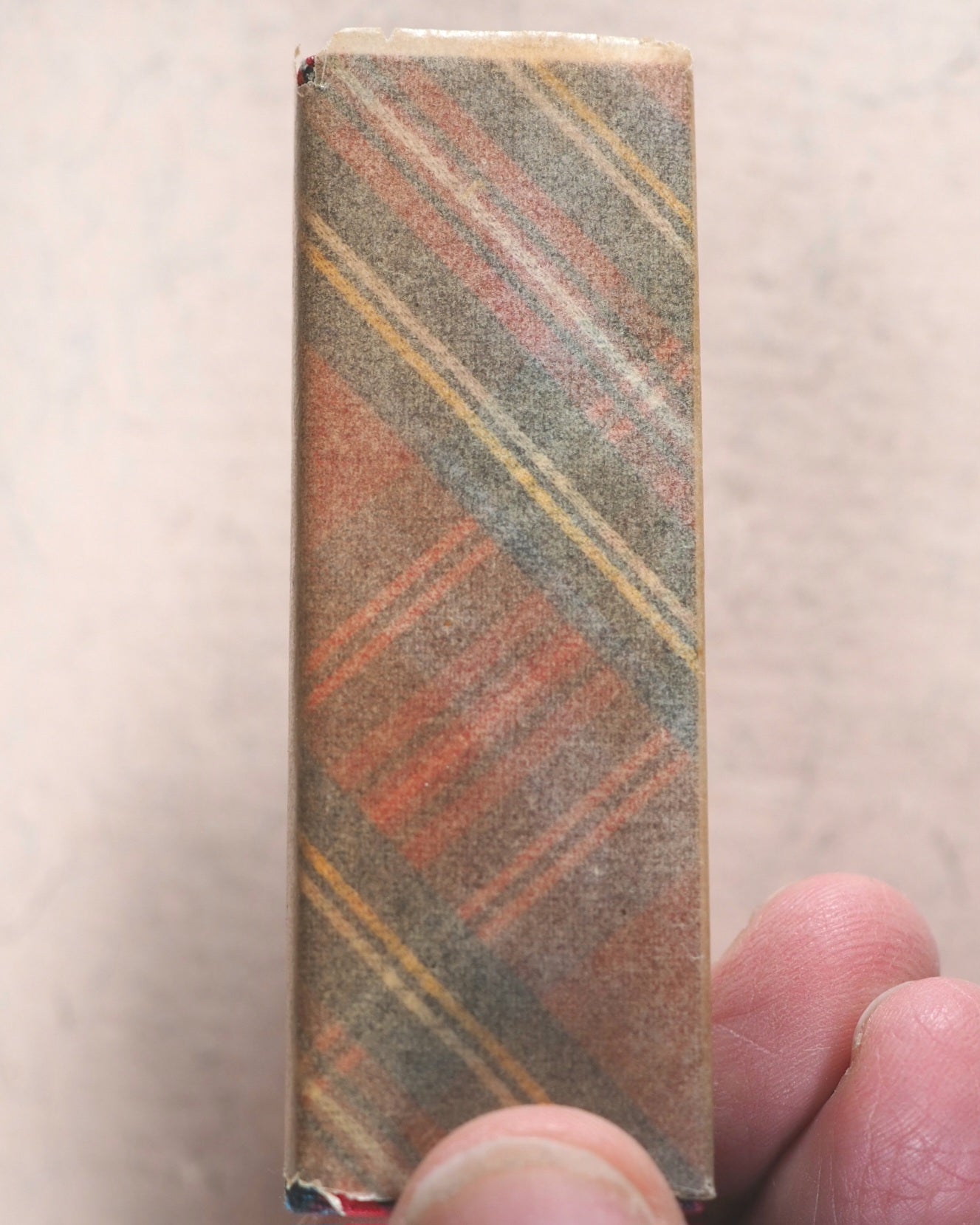 32 printed pages. All pges with red borders. Number 1, out of seven titles in the Finger-Post Series. All edges gilt. Decorated endpapers. 28 x 80 mm. Original tartan silk from the Stuart clan. Title in gilt printed on black leather label on spine. Complete with very uncommon original glassine wrappers. Not in Spielmann. Welsh 6684 only lists a Stokes, N.Y. Imprint but not a Glasgow Bryce & Son edition.See Welsh, 6684 for Stokes, New York edition. OCLC, 774643445. WorldCat locates one copy worldwide (British Library).